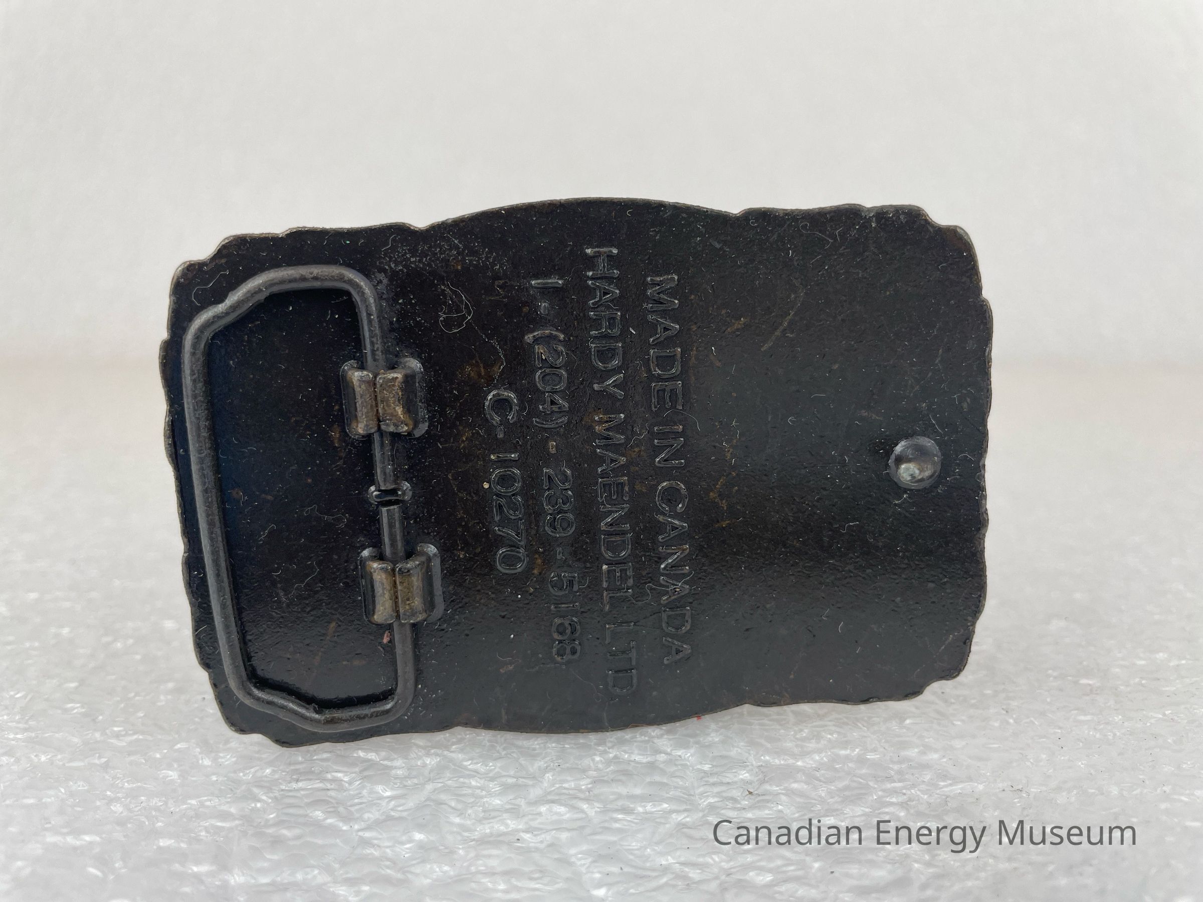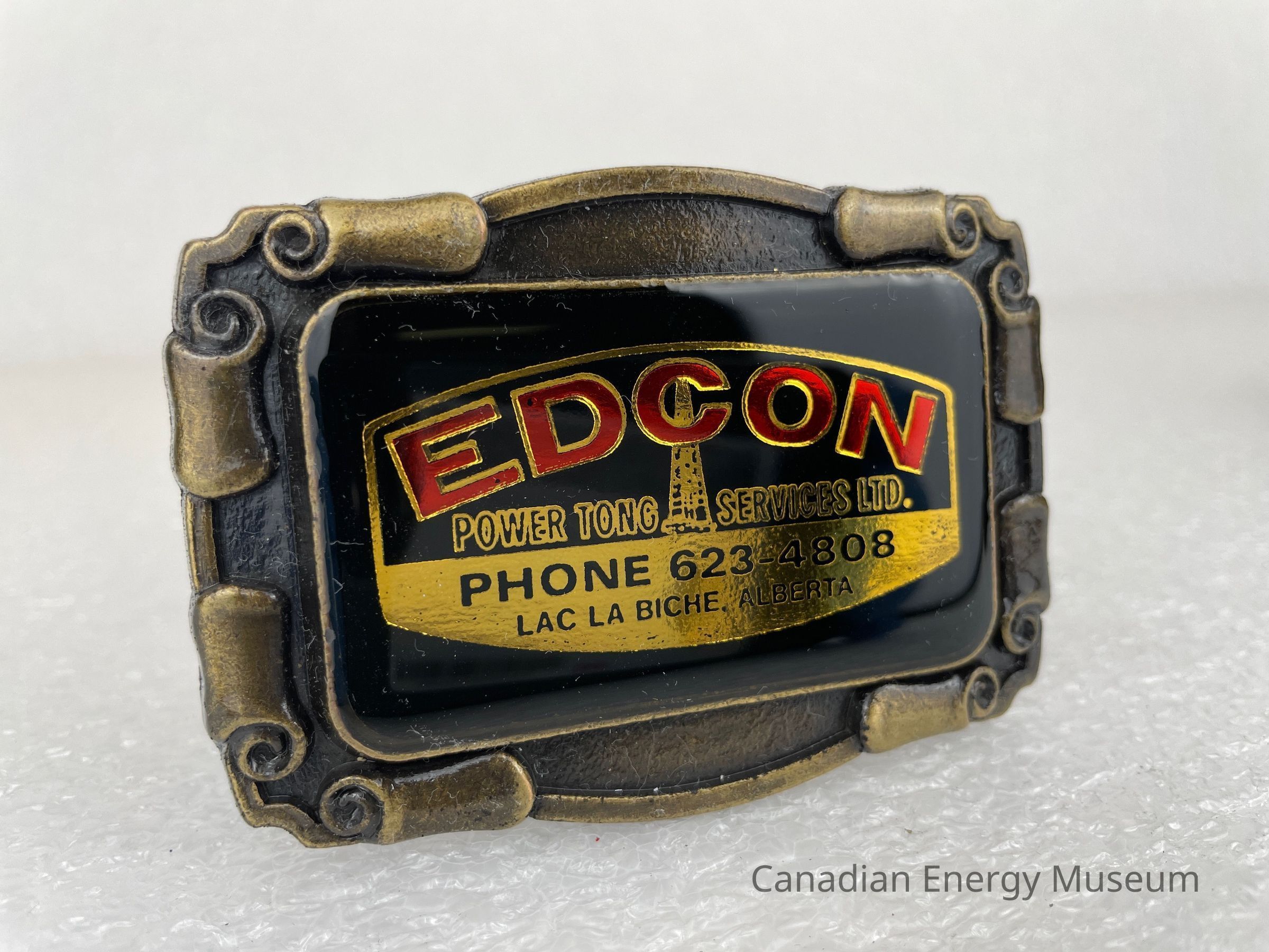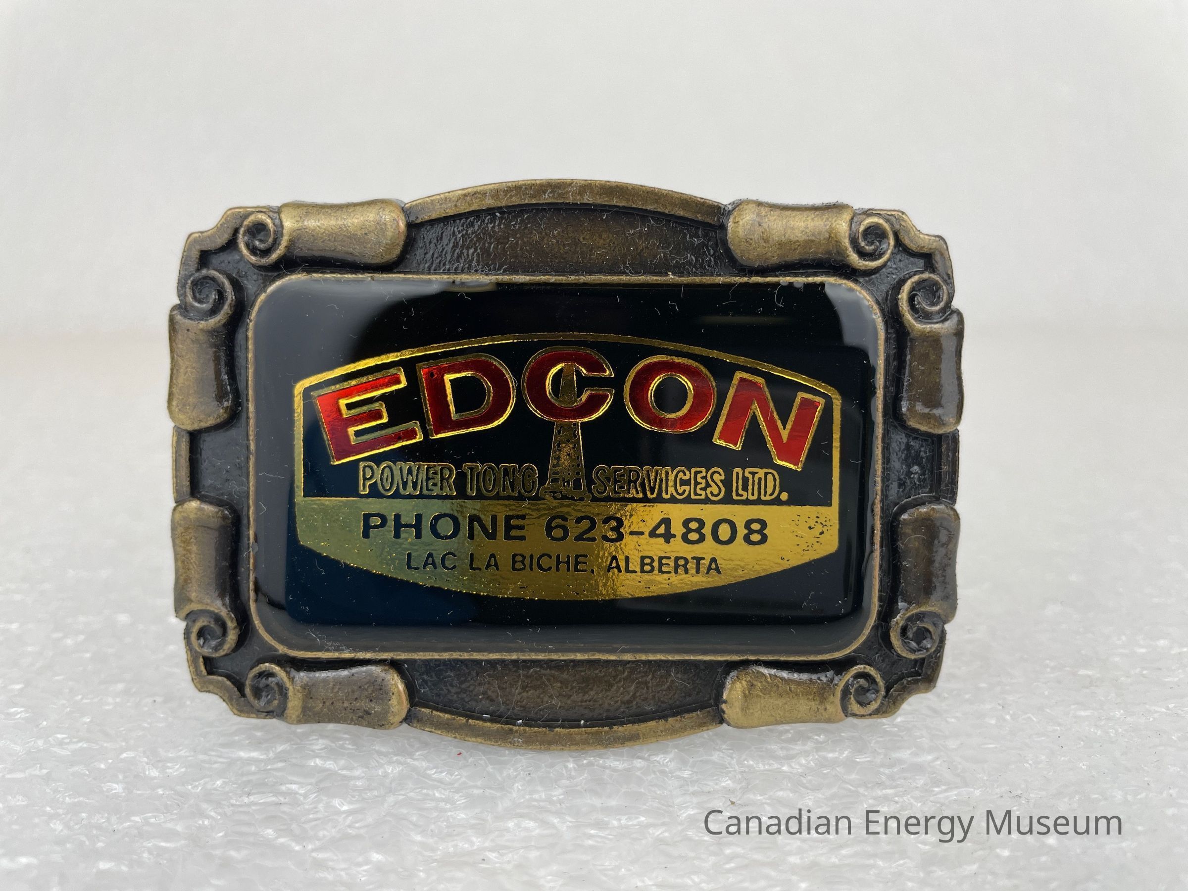 Front Design: A large, rounded rectangle of black enamel is displayed on the front. A gold outline of a rectangle with curved sides, and the lower 1/3 portion being filled in with gold. The top of the rectangle displays red text outlined in gold reading, "EDCON" and gold outlined text underneath reading, "POWER TONG SERVICES LTD." with a gold derrick layered underneath the red "C". The lower half of the rectangle features black text reading, "PHONE 623 - 4808 / LAC LA BICHE, ALBERTA". The border of the buckle is antique-bronze and features two scroll shapes placed on each corner.