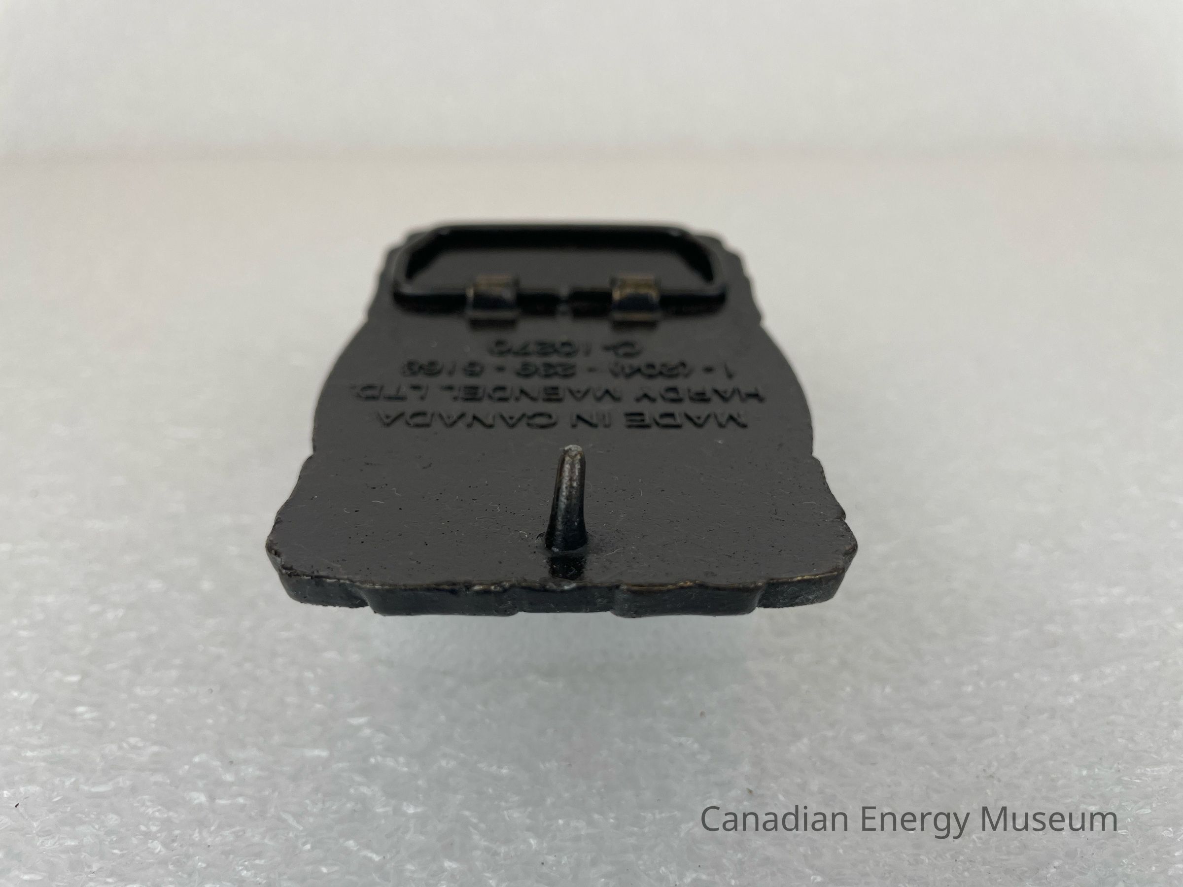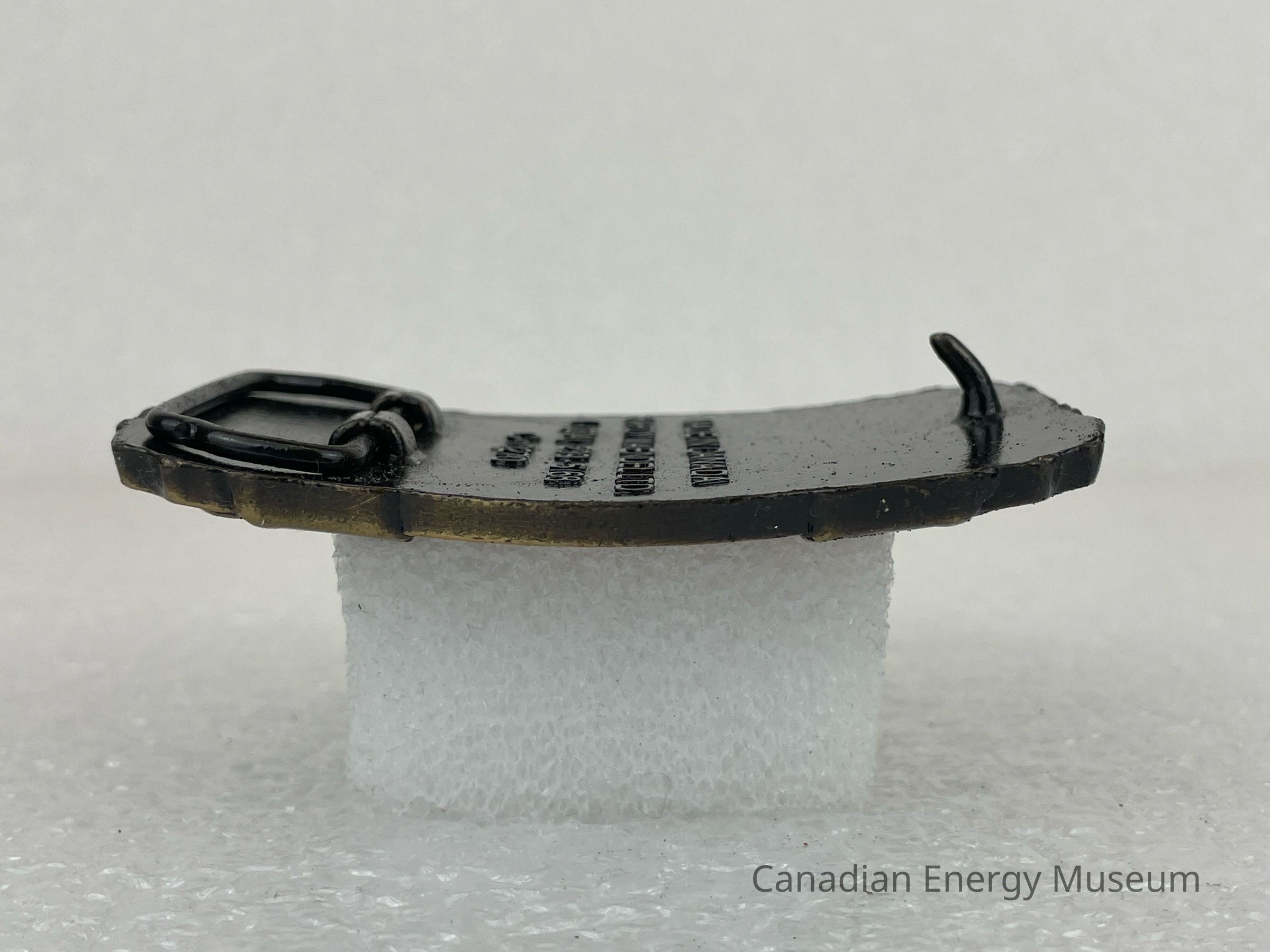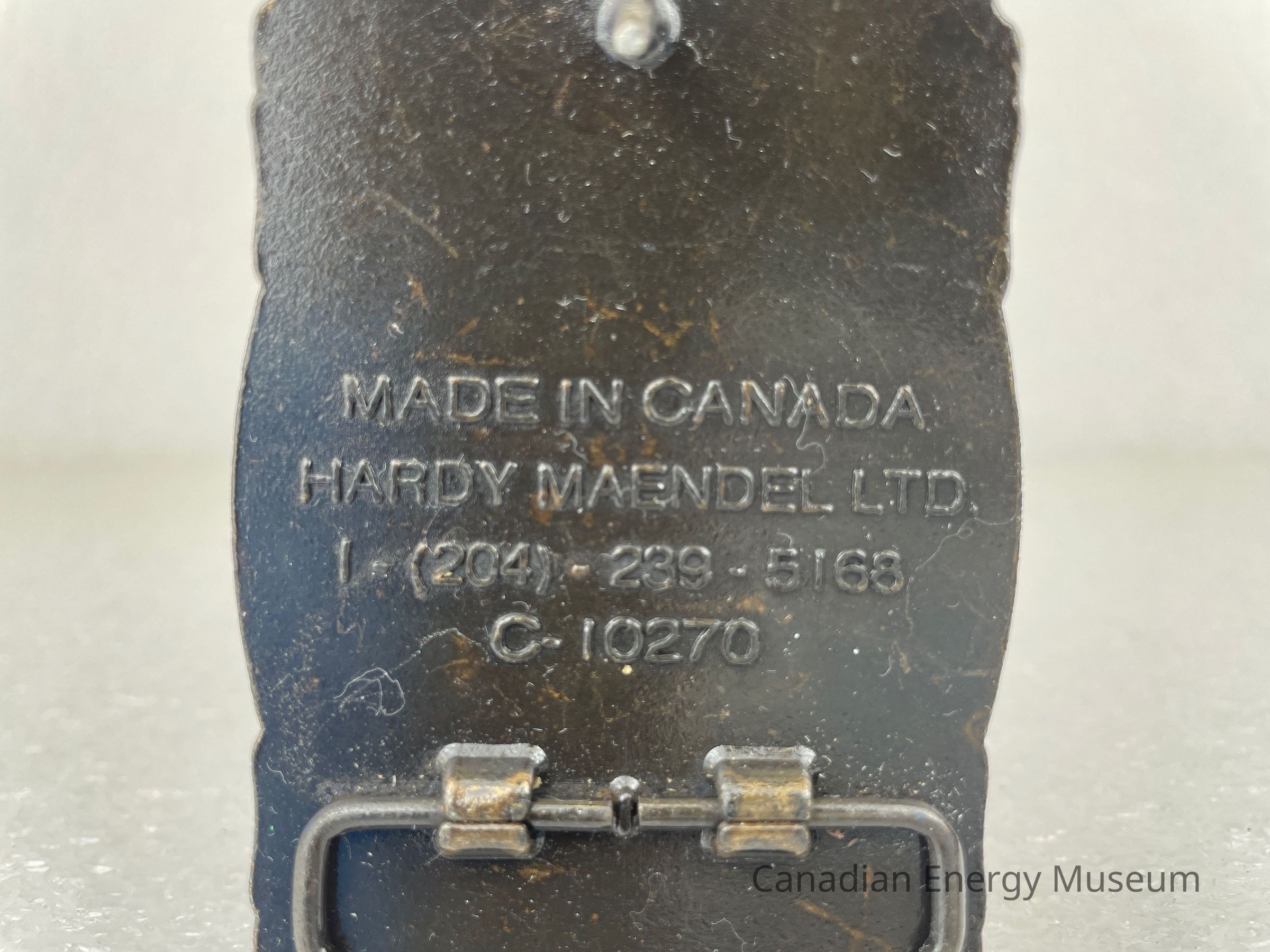 Front Design: A large, rounded rectangle of black enamel is displayed on the front. A gold outline of a rectangle with curved sides, and the lower 1/3 portion being filled in with gold. The top of the rectangle displays red text outlined in gold reading, "EDCON" and gold outlined text underneath reading, "POWER TONG SERVICES LTD." with a gold derrick layered underneath the red "C". The lower half of the rectangle features black text reading, "PHONE 623 - 4808 / LAC LA BICHE, ALBERTA". The border of the buckle is antique-bronze and features two scroll shapes placed on each corner.
