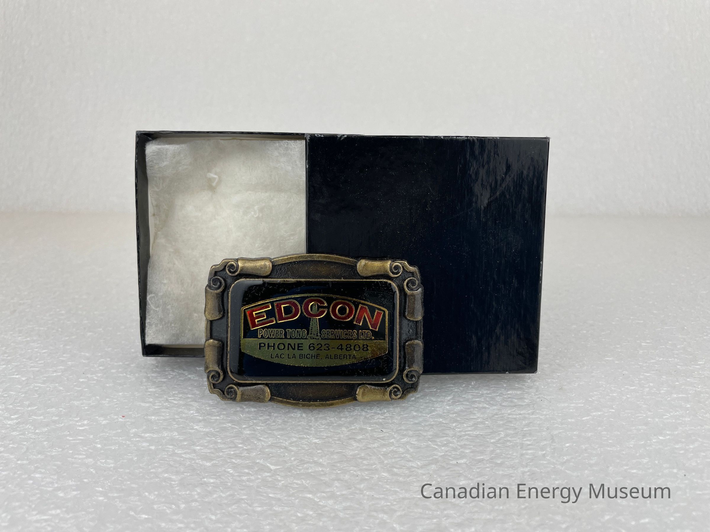 A rounded rectangle belt buckle, branded to EDCON Power Tong Services Ltd., kept within a black cardboard box.