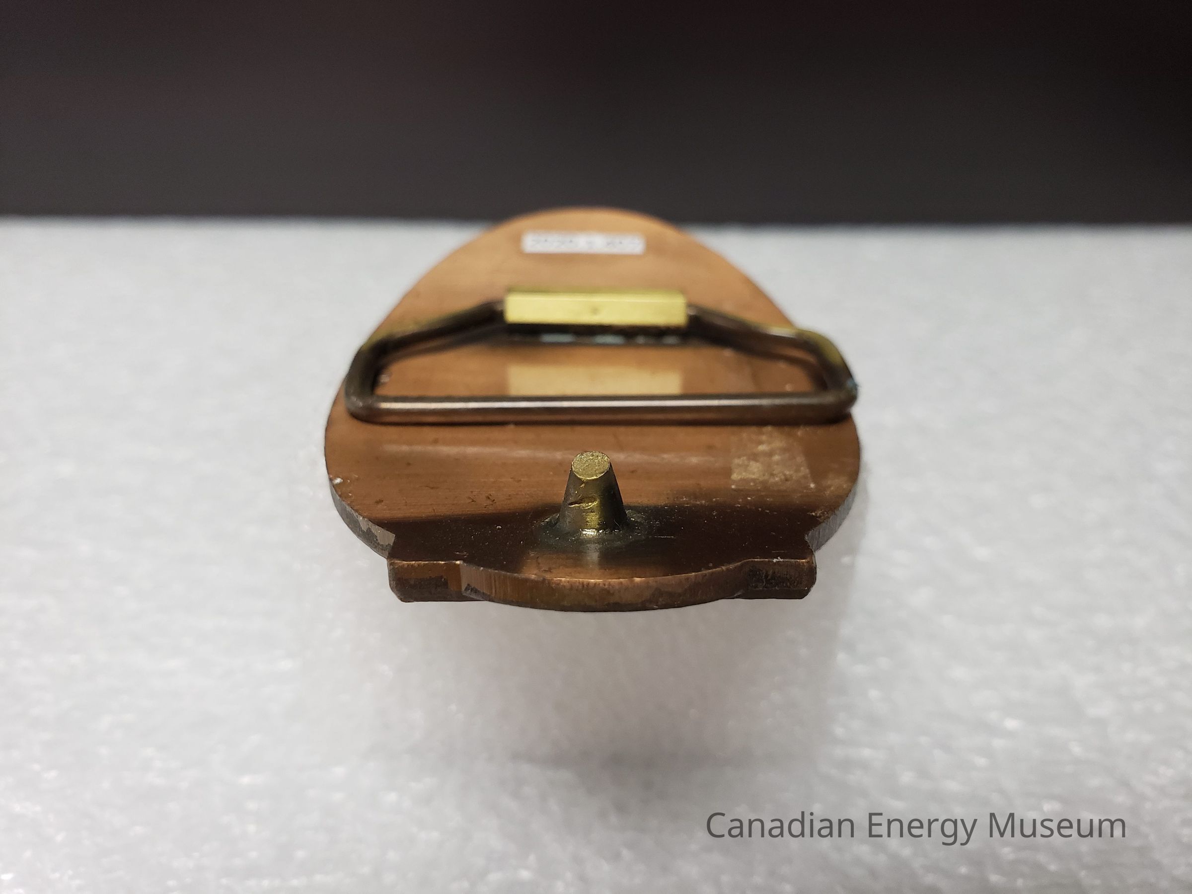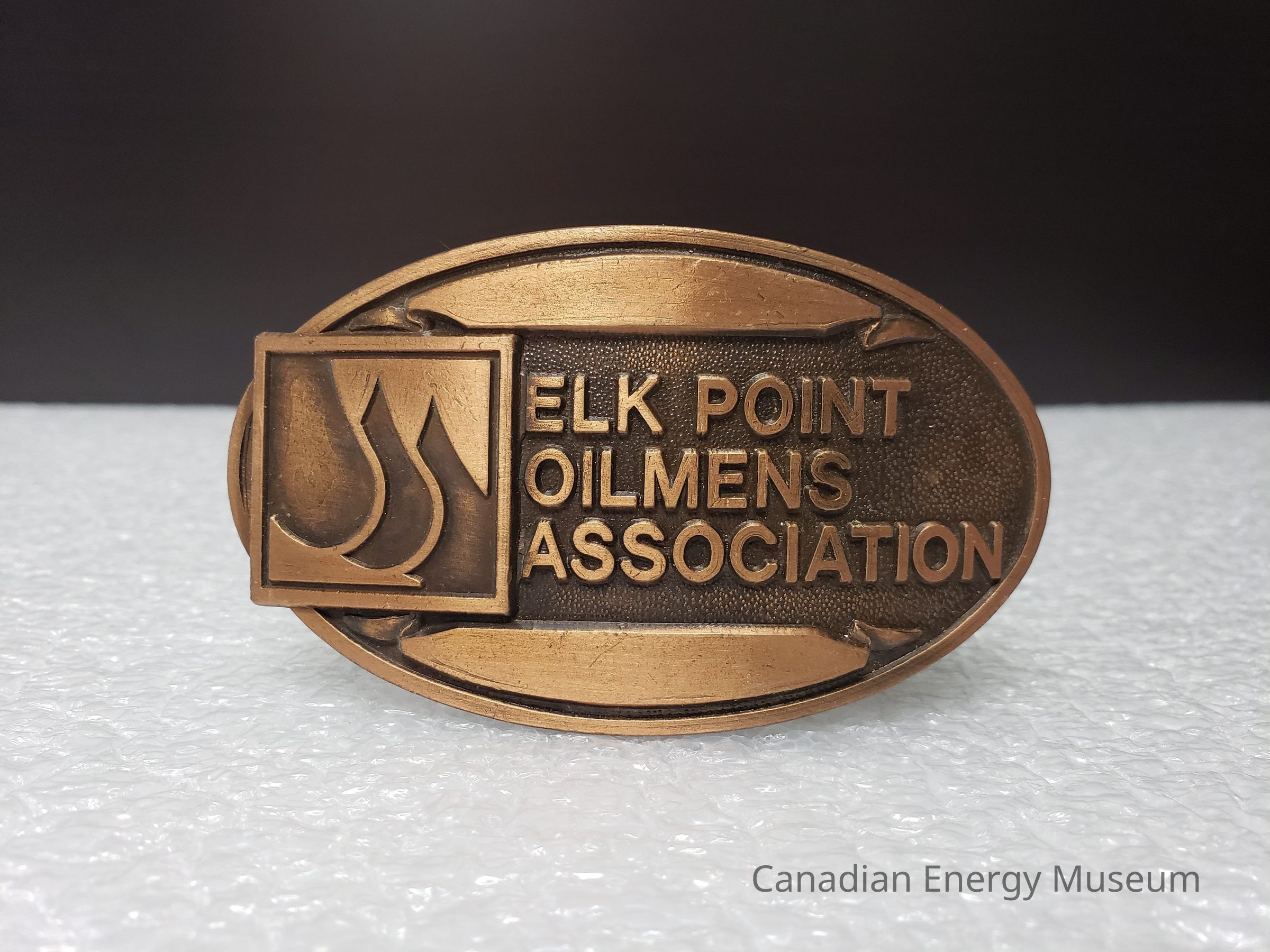 Old Description (Kelsey Dalrymple, 6 March 2020): Elk Point Oilmens Association. Oval copper belt buckle. Three oil drops in square on left.Collection