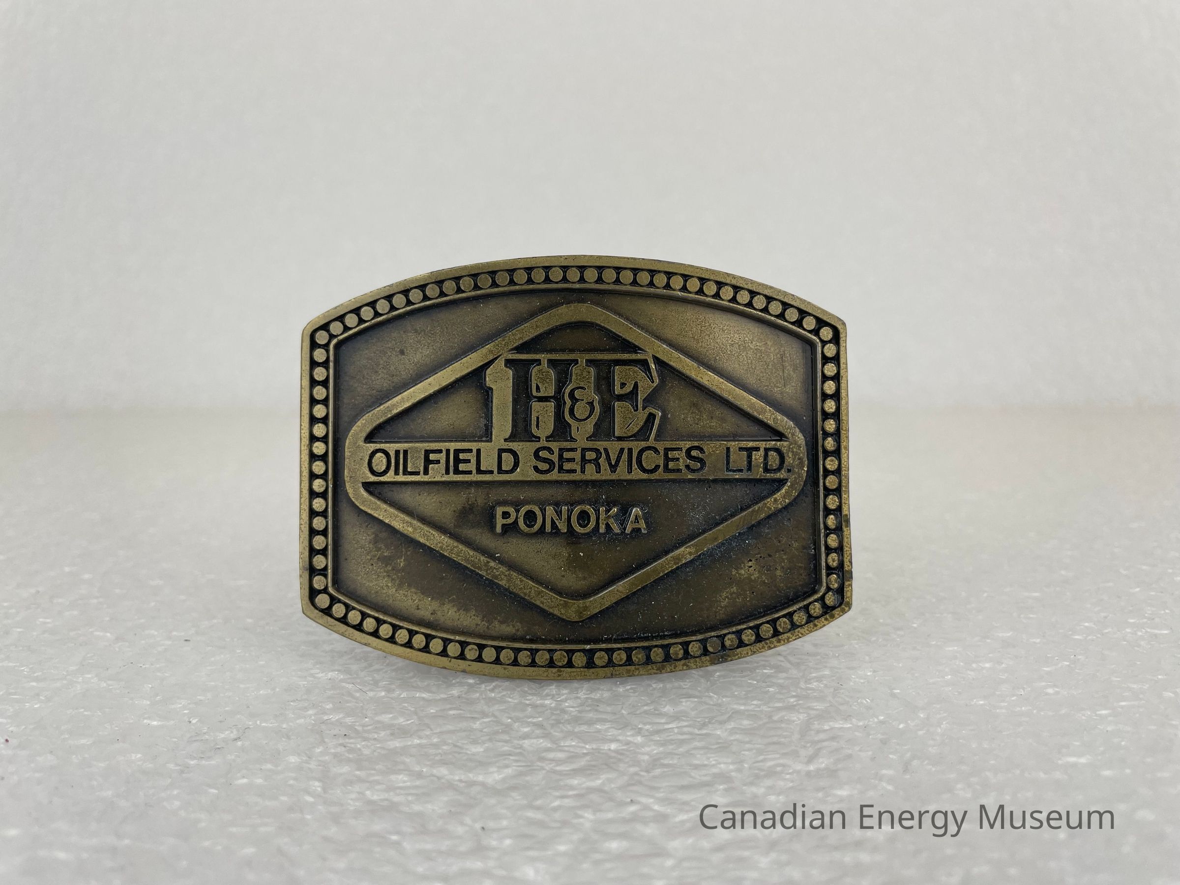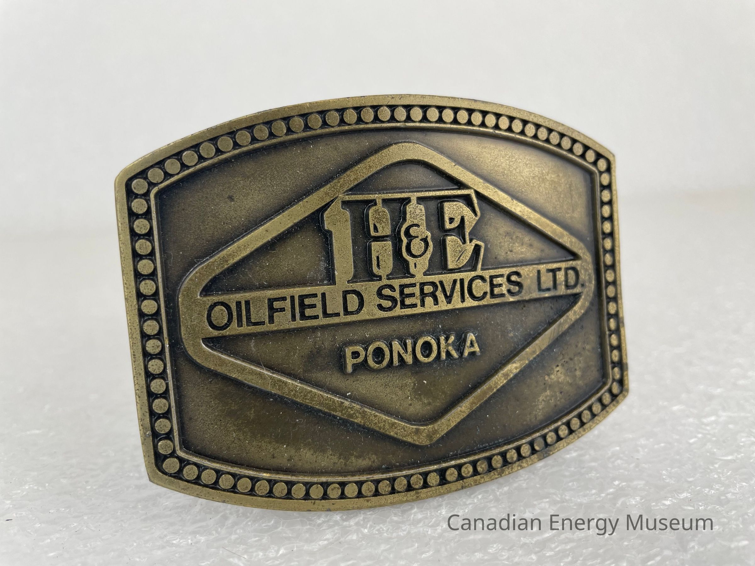 Front Design: A bronze border of circles runs around the edge, with a recessed, smooth interior surface. The buckle features a bronze raised diamond with text placed inside reading, "H&E OILFIELD SERVICES LTD. PONOKA". The "OILFIELD SERVICES LTD." is placed on a thin rectangle running through the middle of the diamond.
