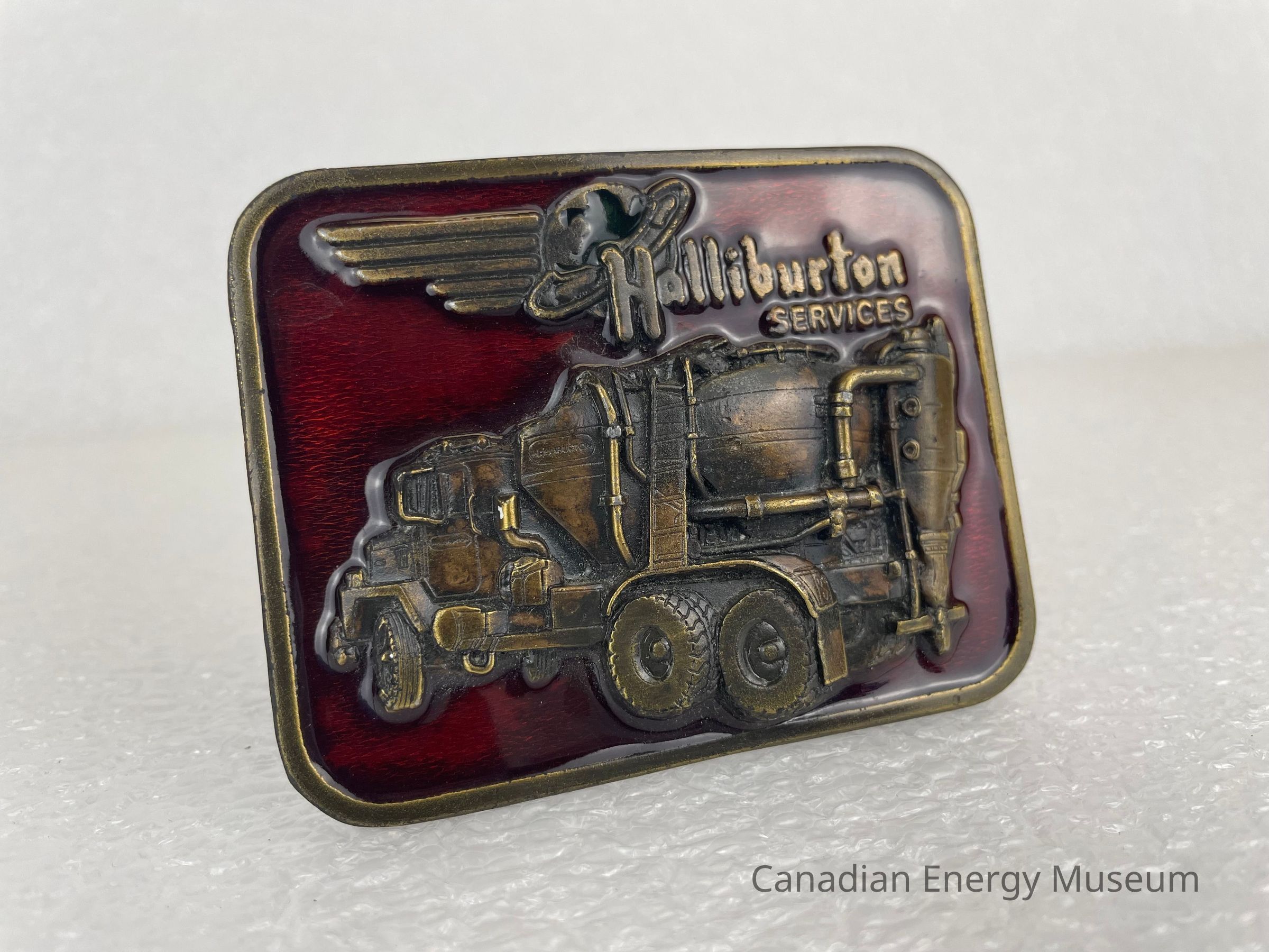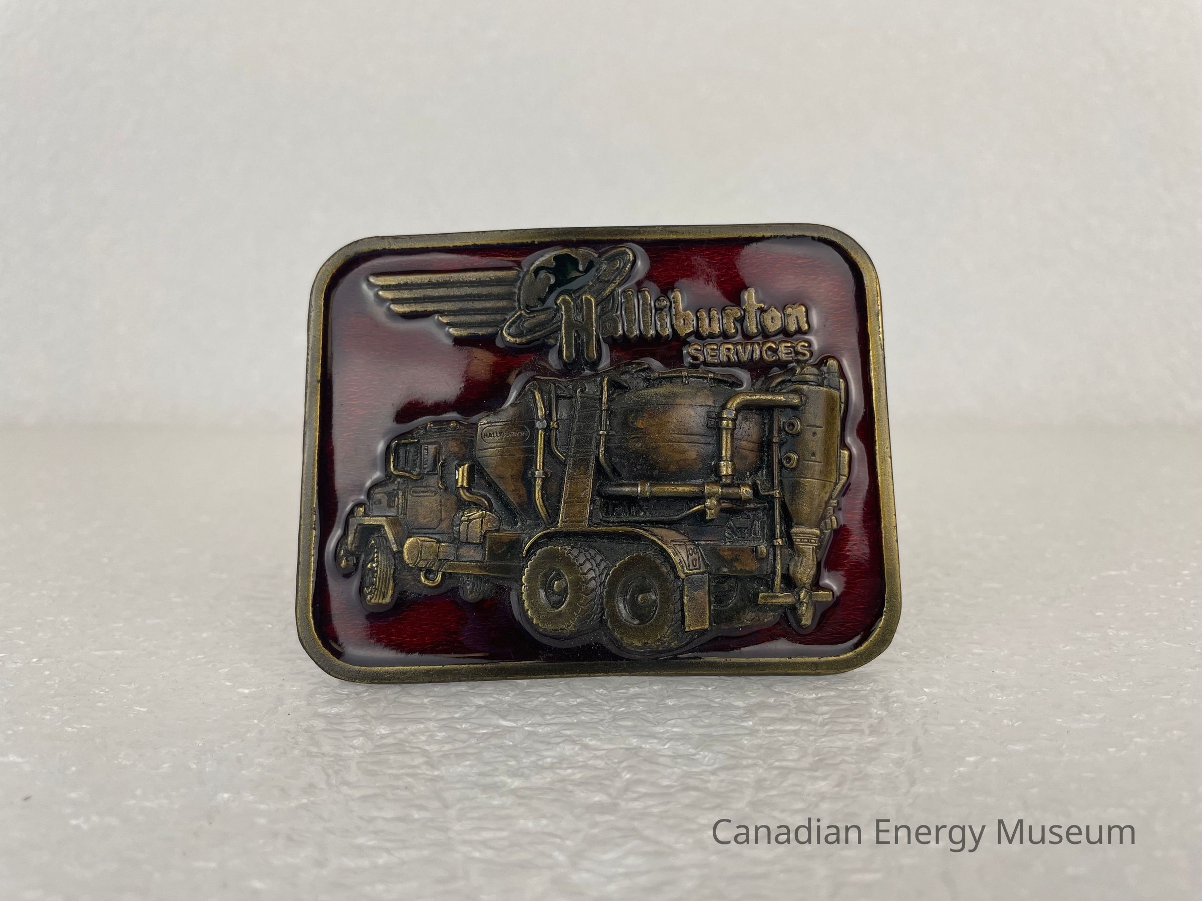 Front Design: A bronze border runs around the edge, with the recessed interior surface having a dark red enamel filled background. At the centre of the space is a raised truck facing the left, with a focus on the tanks at the back of the truck. The top of the buckle features the Halliburton logo of a planet with a ring surrounding it like Saturn. Five staggered lines come out from the planet and stretch to the left side. Layered overtop the logo is text, "Halliburton SERVICES".