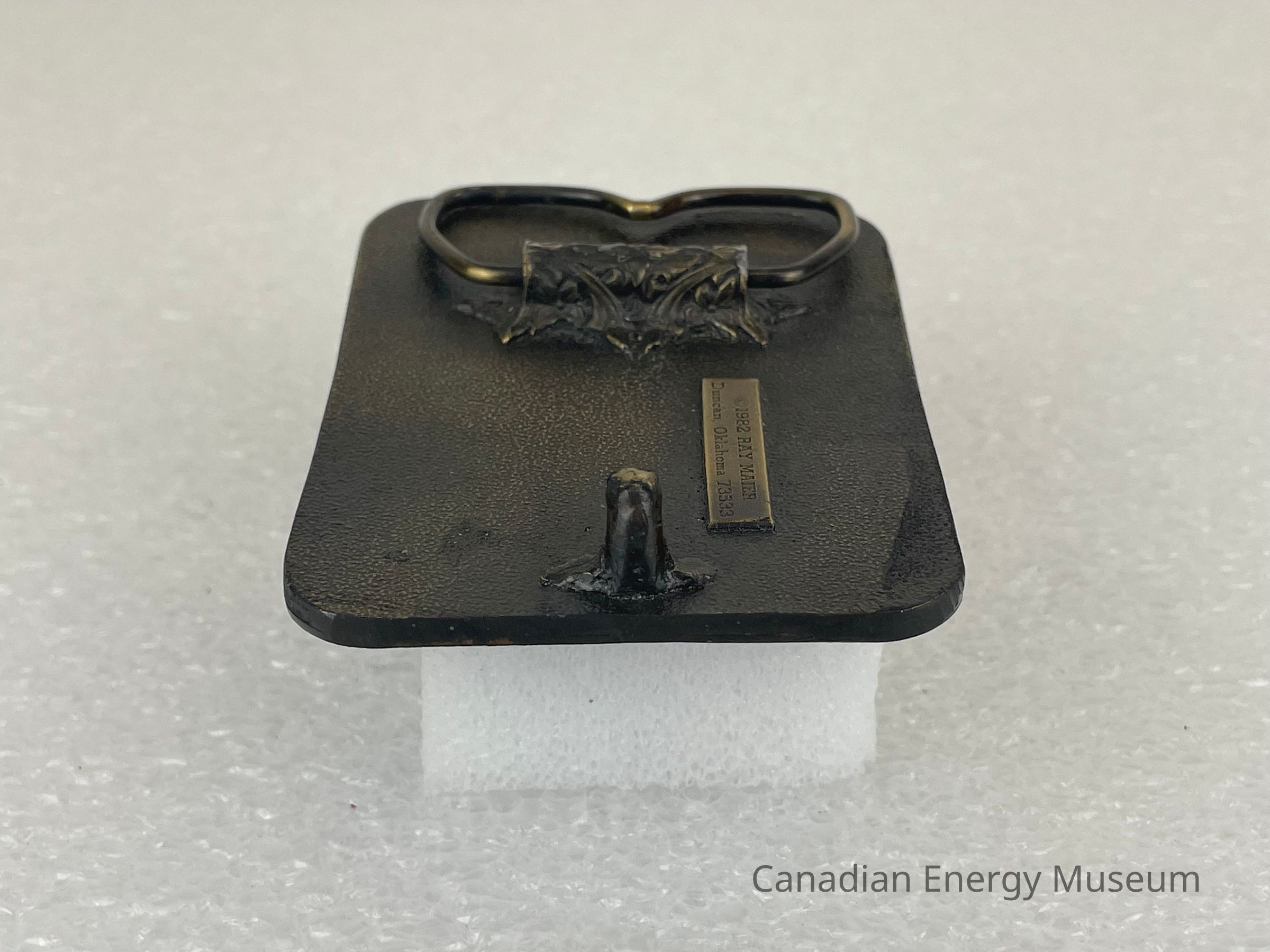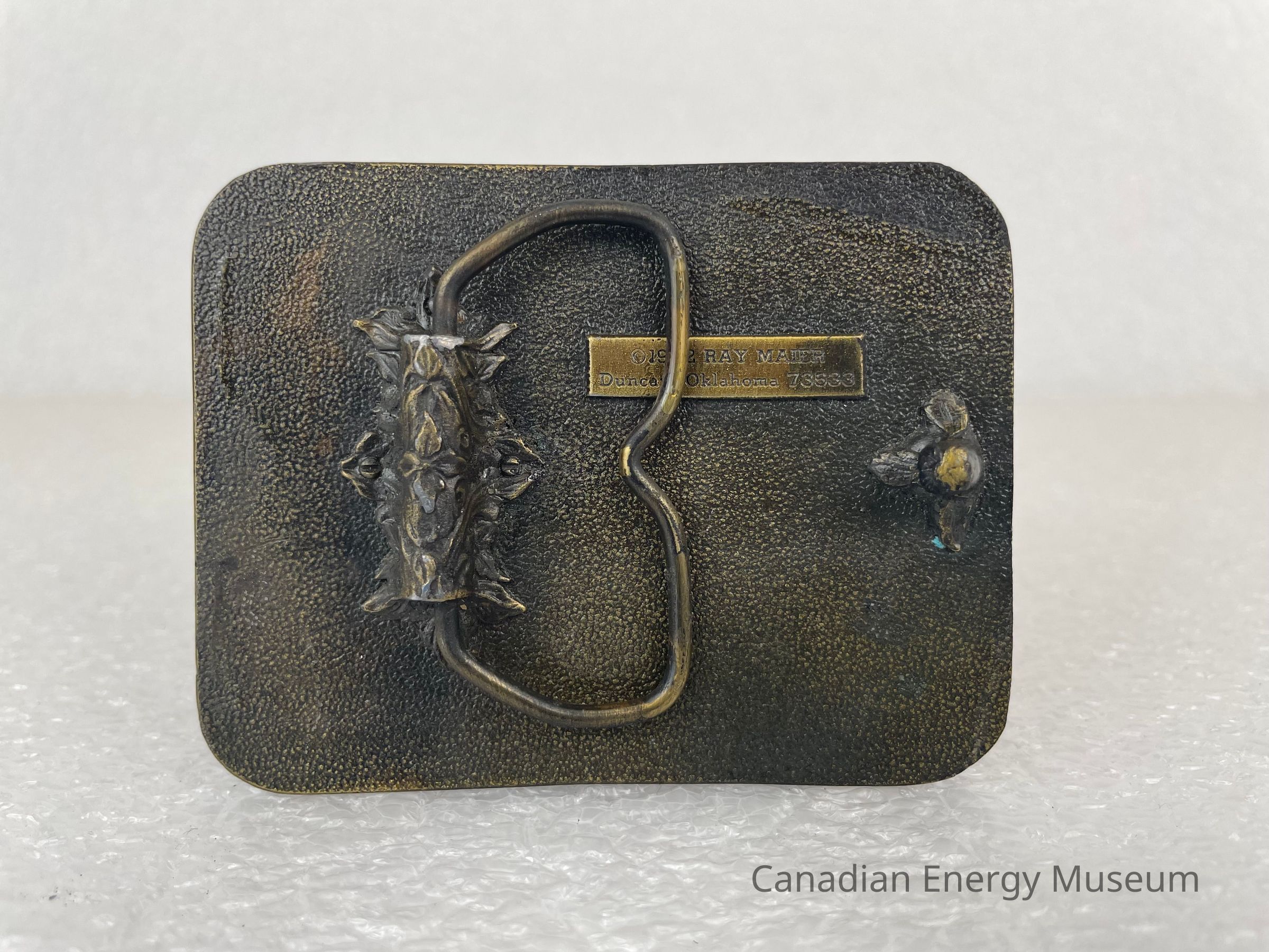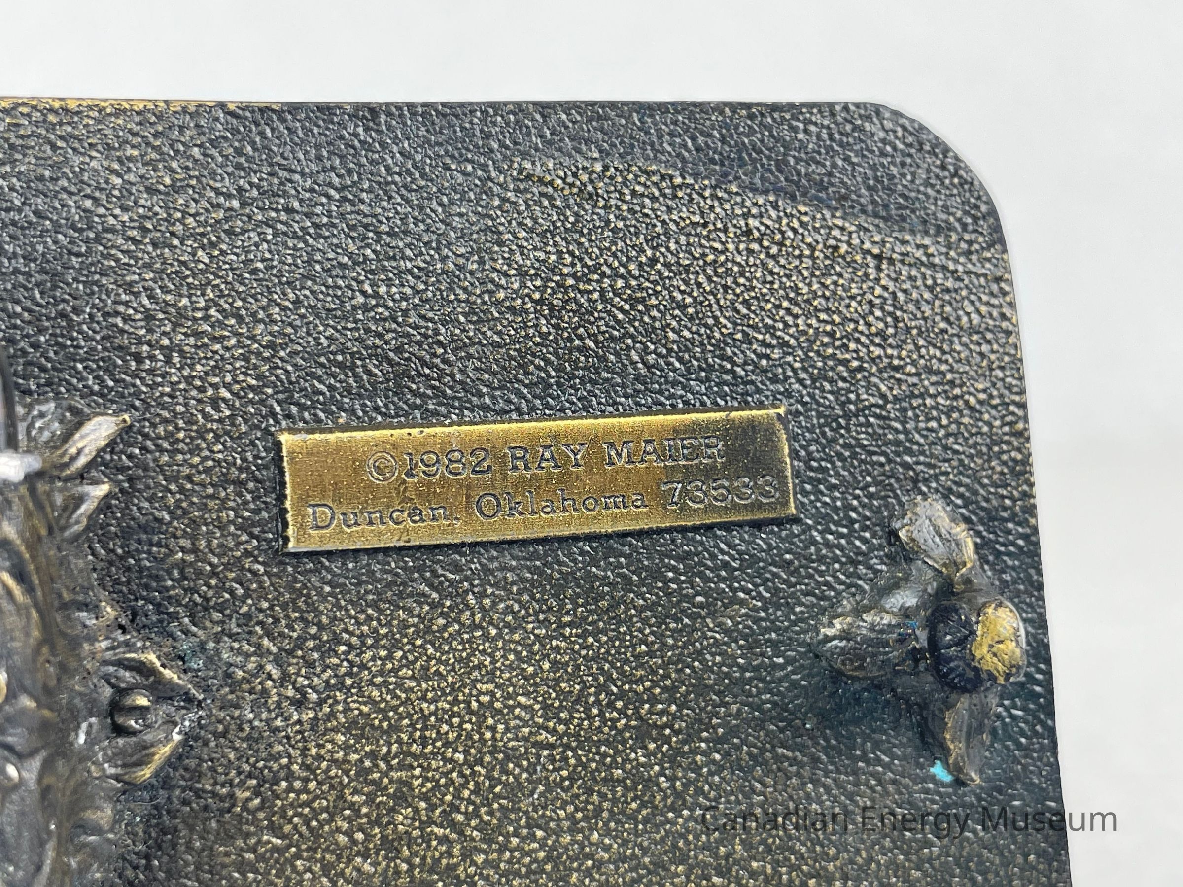 Back Elements: The back displays a dotted texture surface. The hook has a three-leafed base with a thin, curved cylinder body. The hinge is a rounded trapezoid with an indented centre, and the hinge is attached at one point by a leafy/ floral texture. A small rectangular plate reads, "©1982 RAY MAIER / Duncan, Oklahoma 73533".Collection