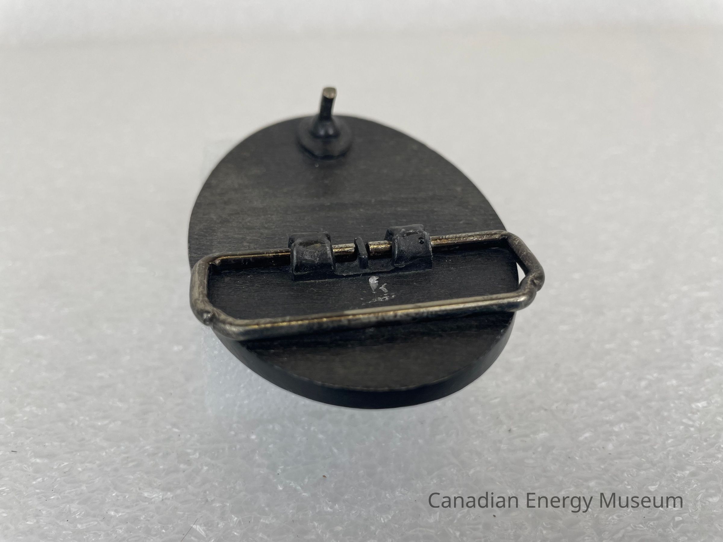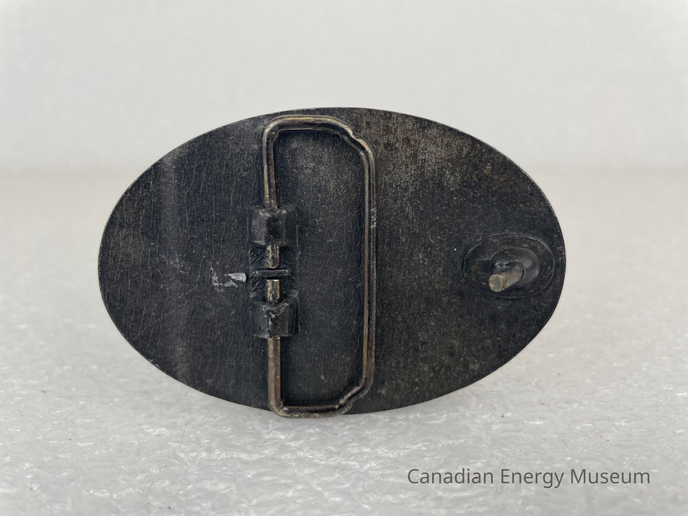 Features: An oval cast metal belt buckle, finished in antique silver.