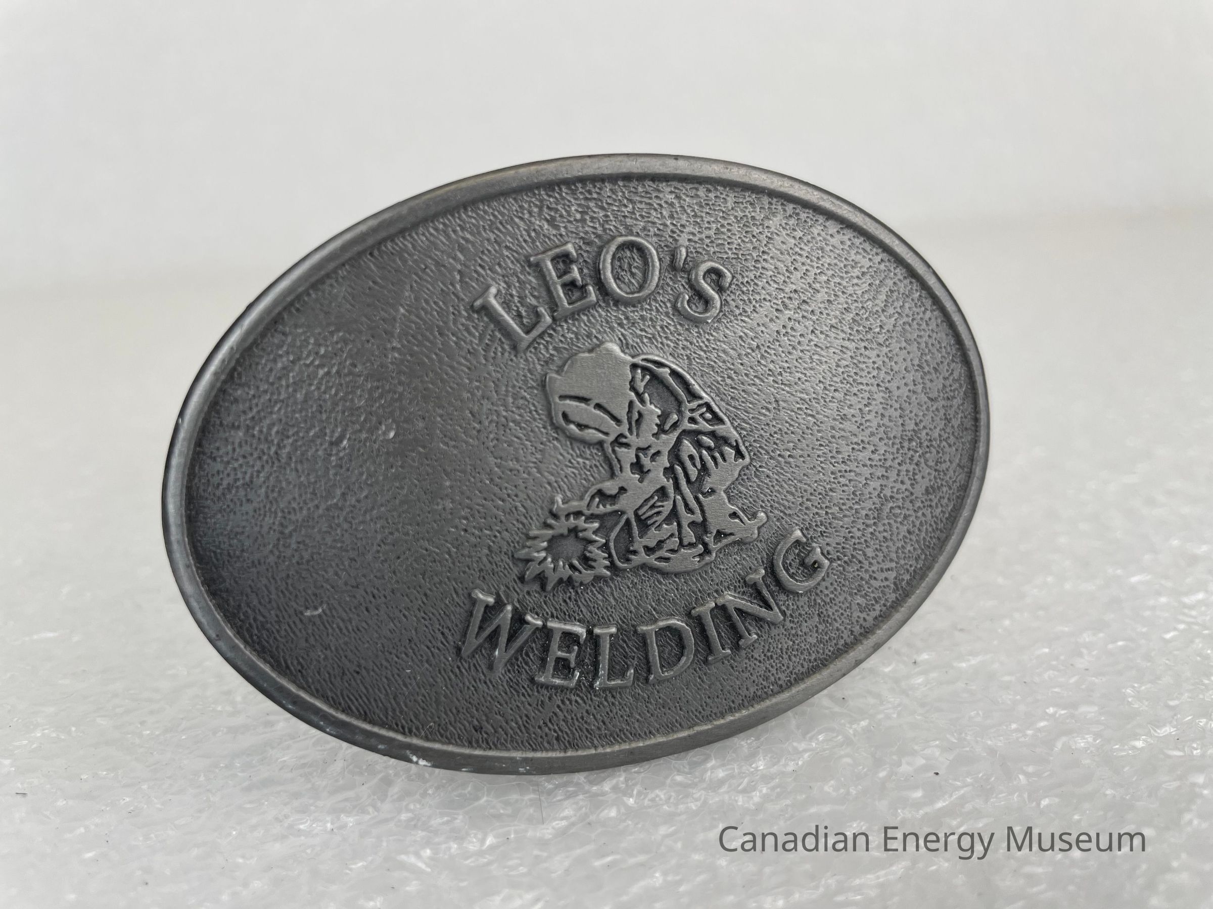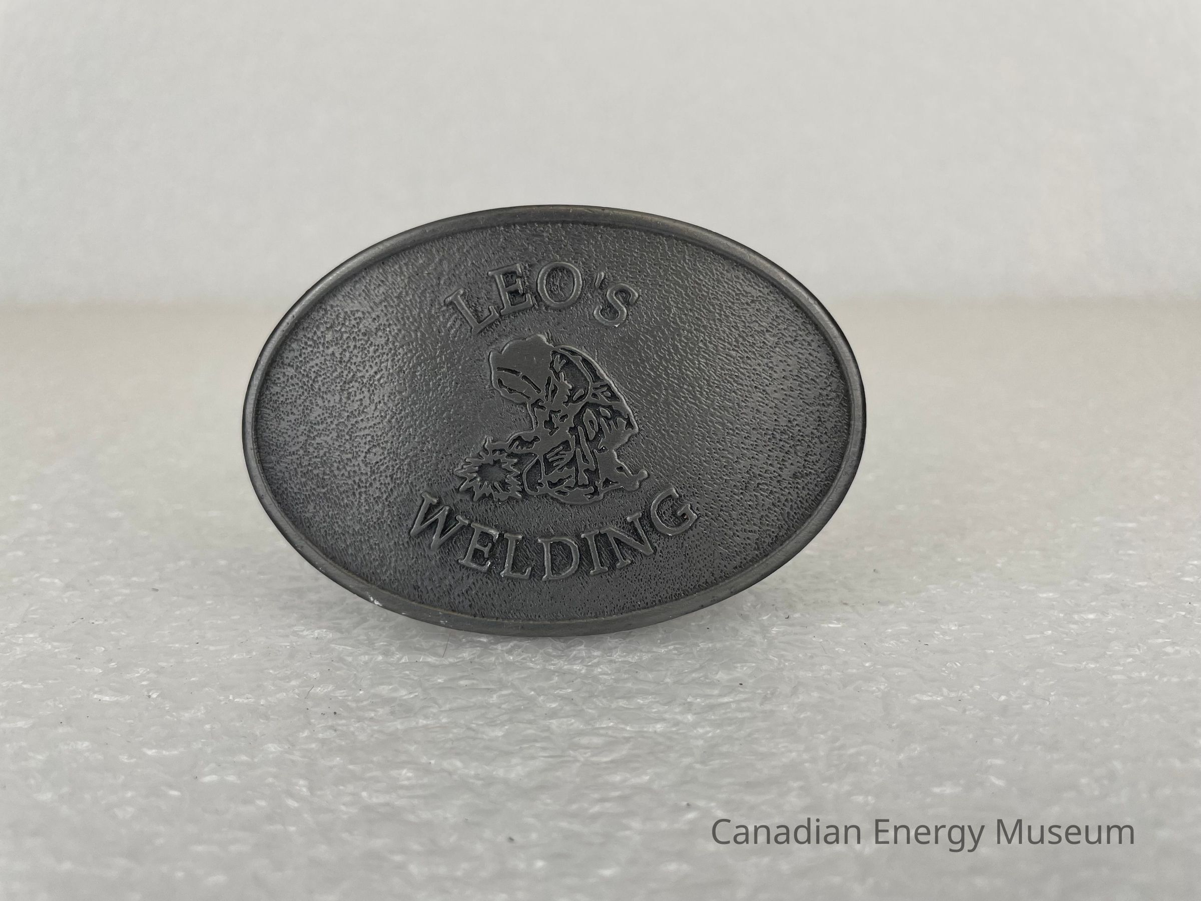 An oval belt buckle, branded to Leo's Welding.