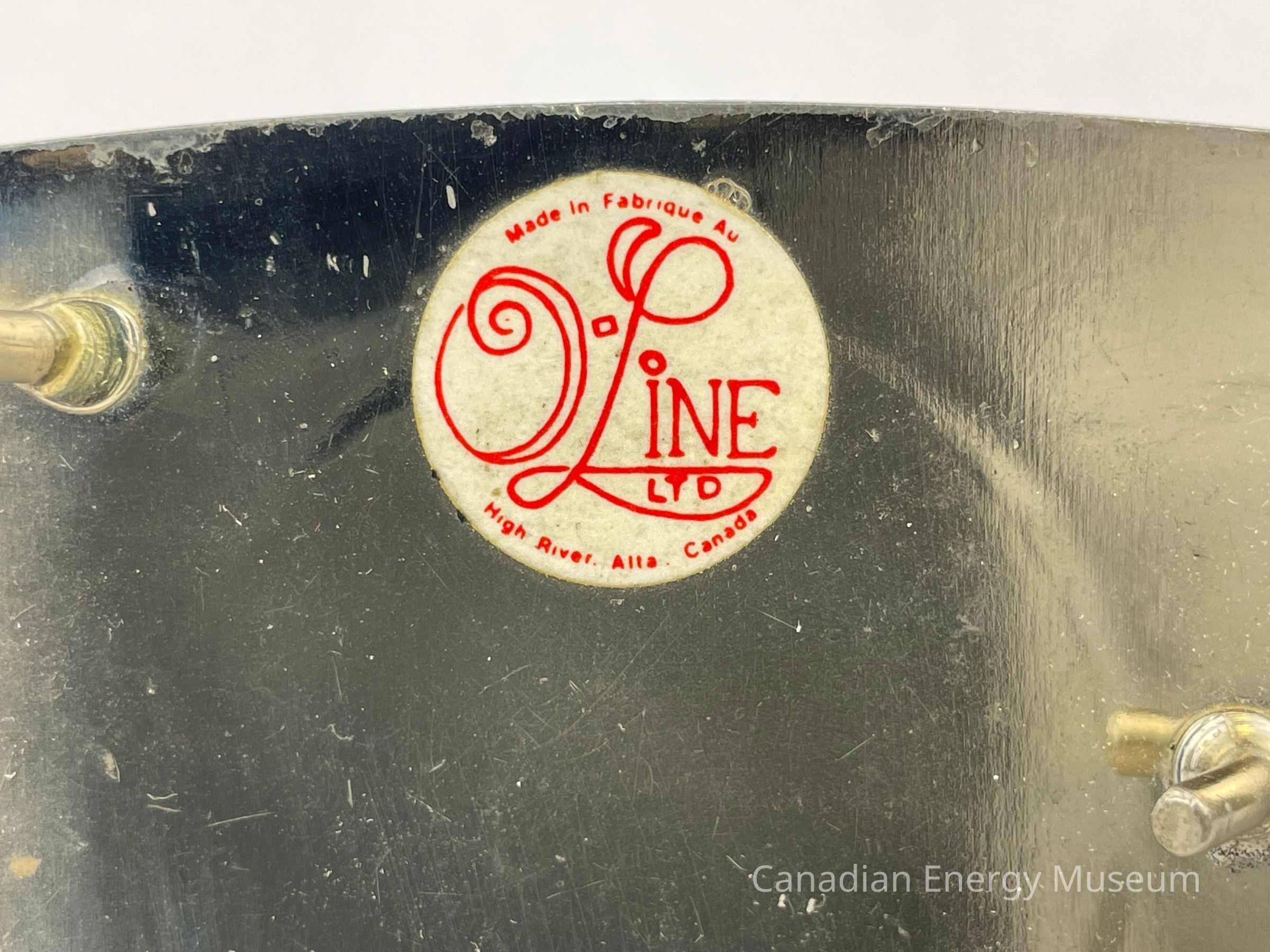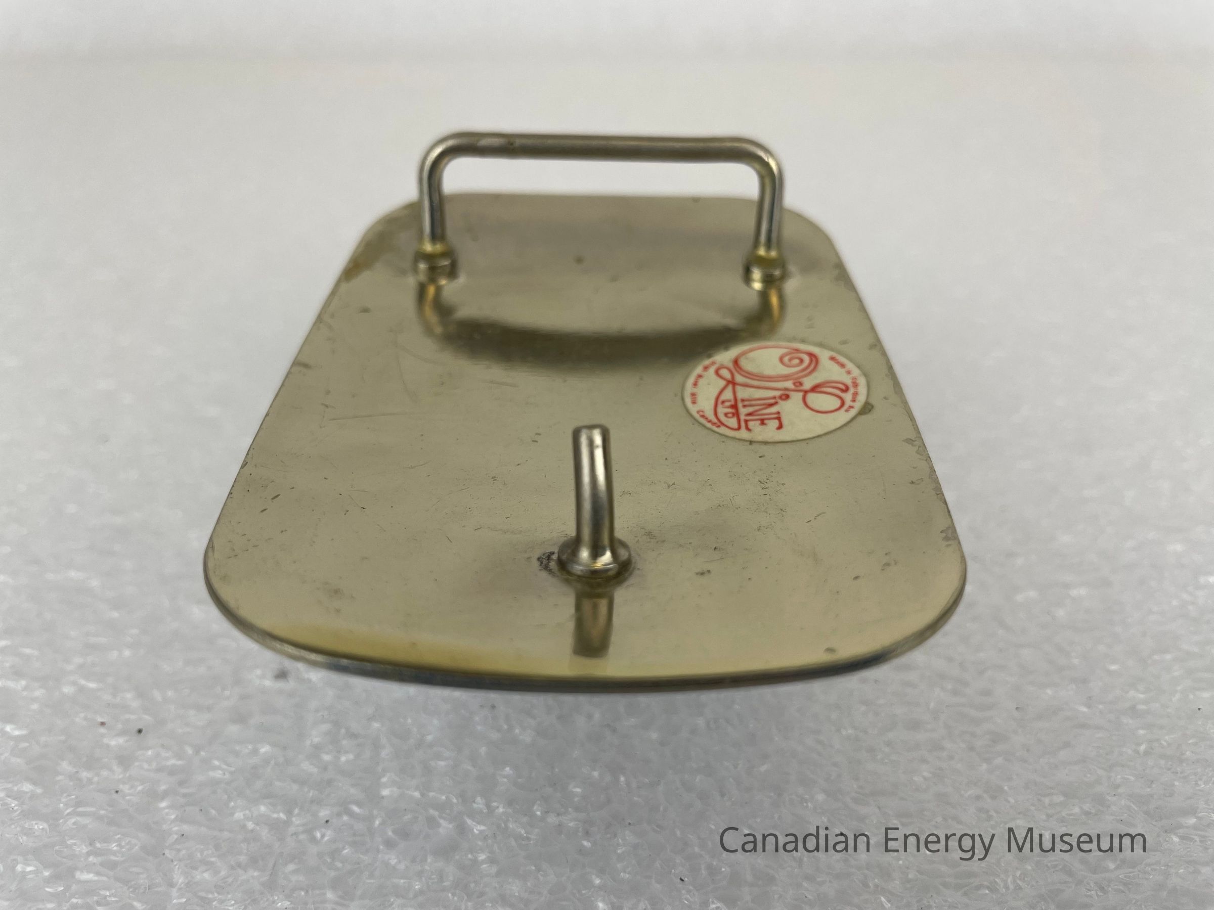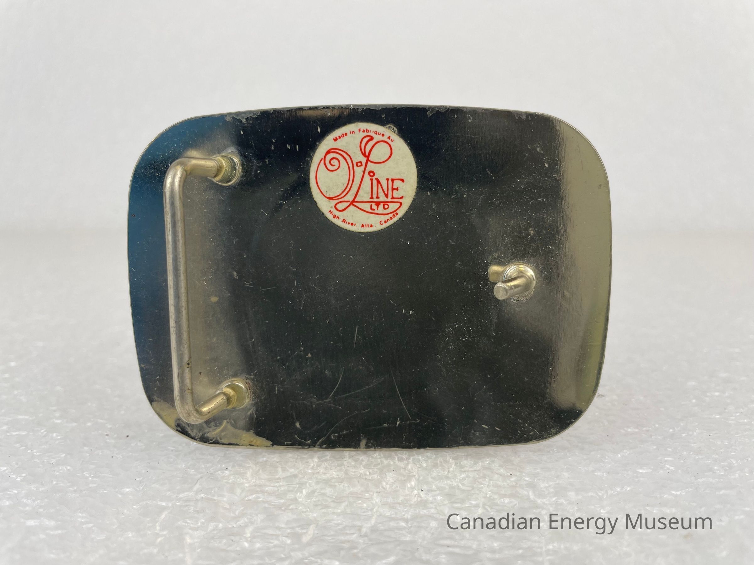 Back Elements: The back displays a smooth and blank surface. The hook is a plain, thin, curved cylinder body. The hinge is a rounded rectangle, sticking out and away from the buckle. A white sticker is placed at the top middle of the back. The sticker features bright red text reading, "Made in Fabrique AU / O Line LTD / High River, Alta, Canada".Collection