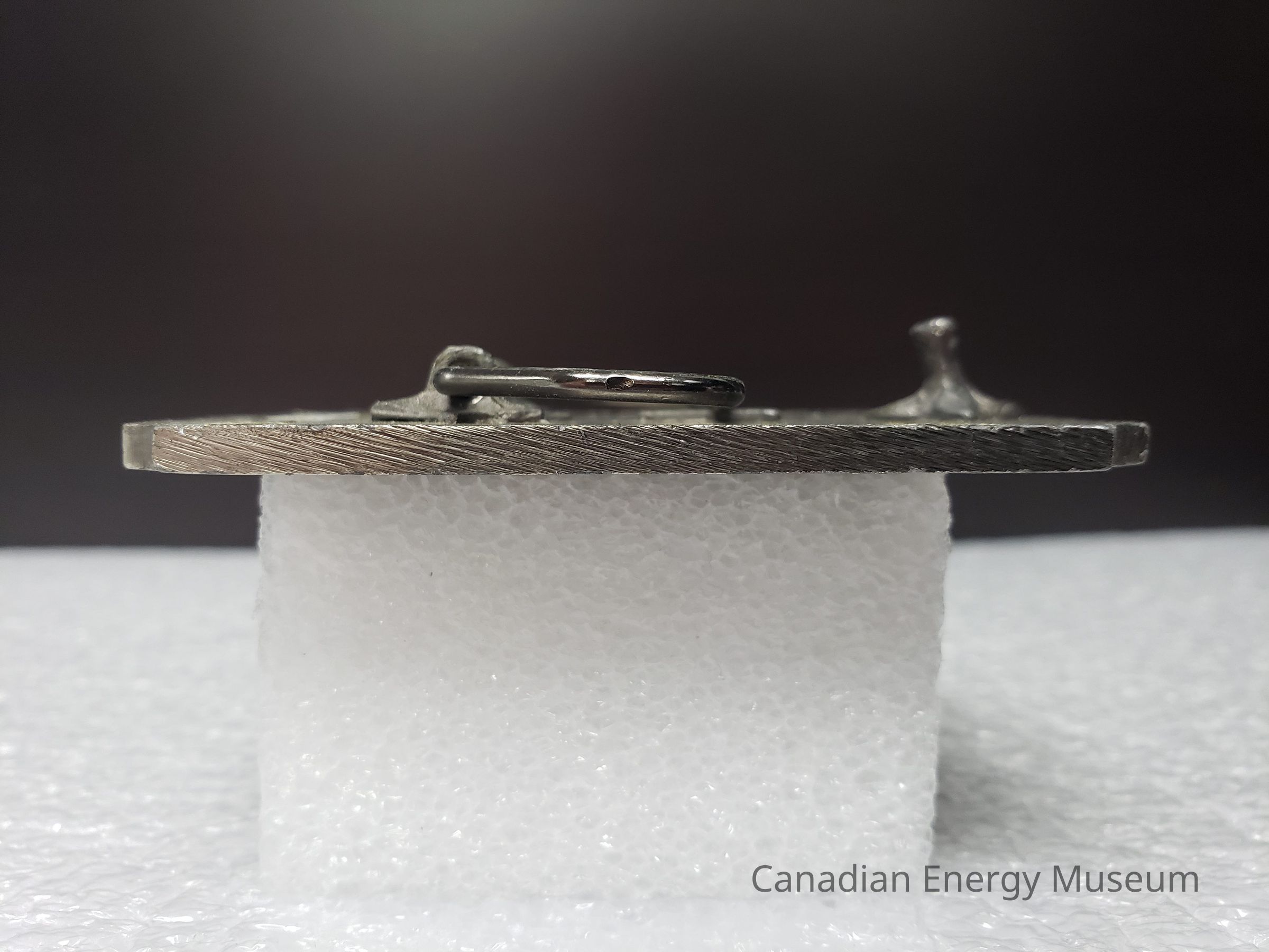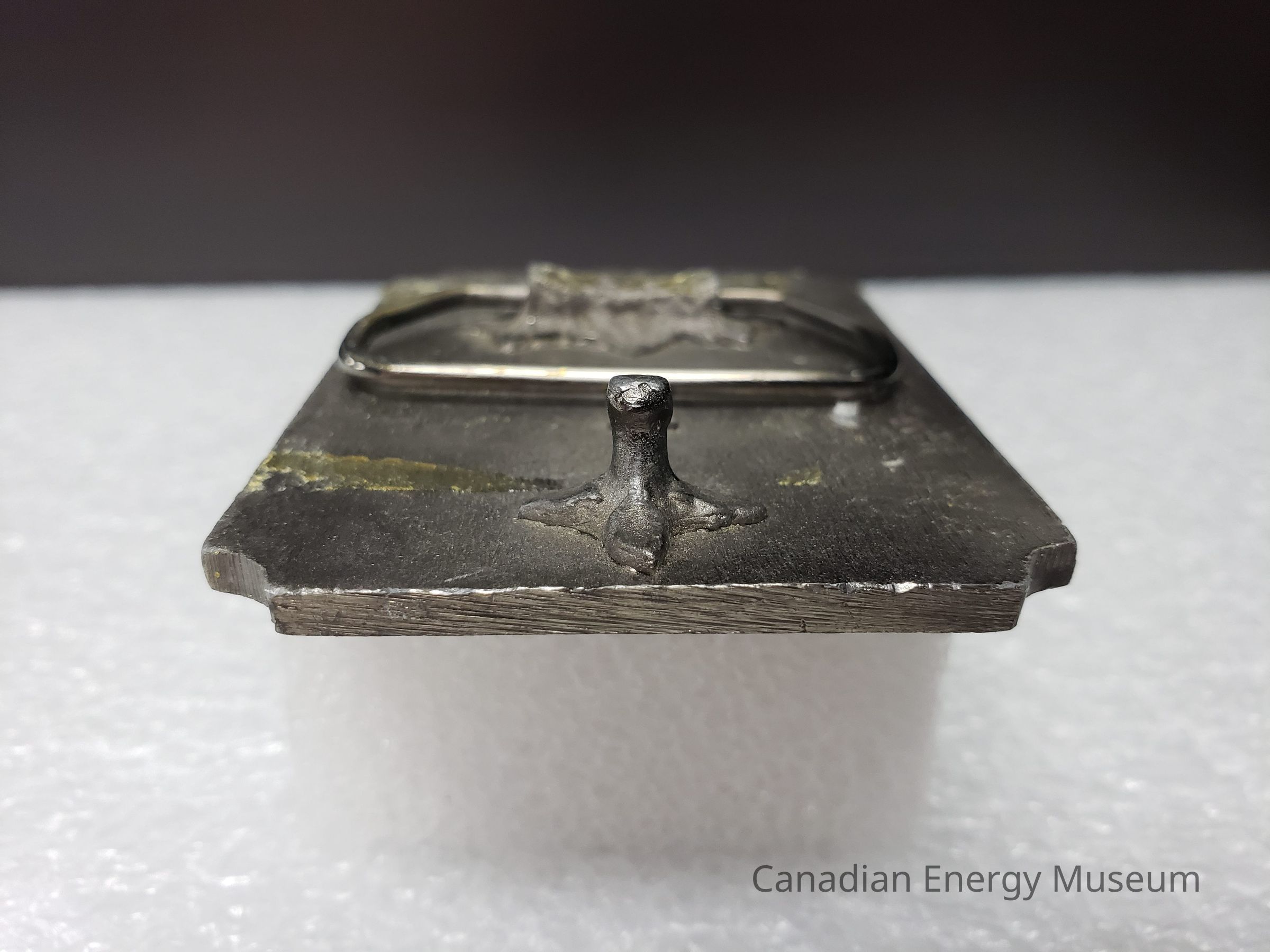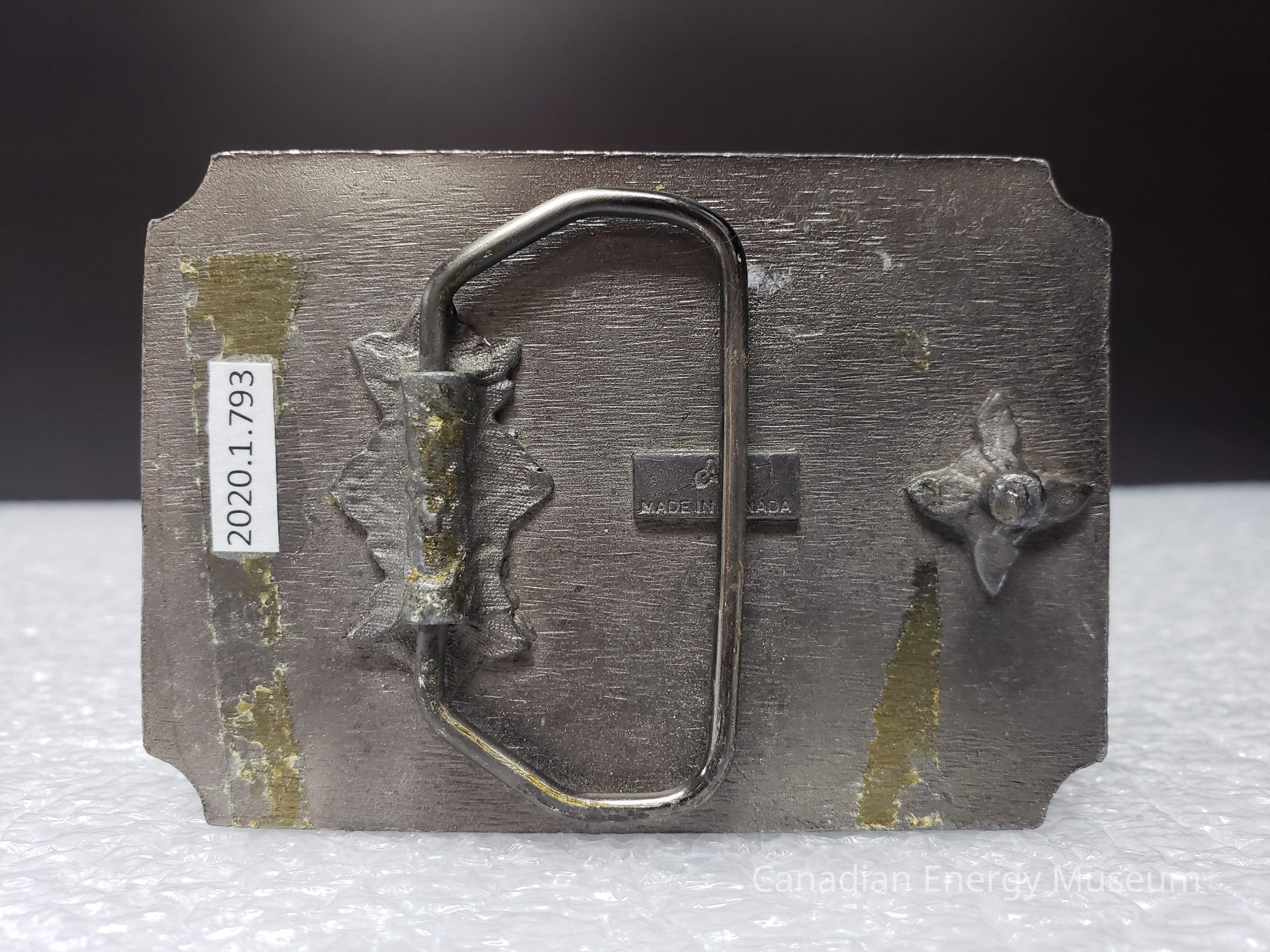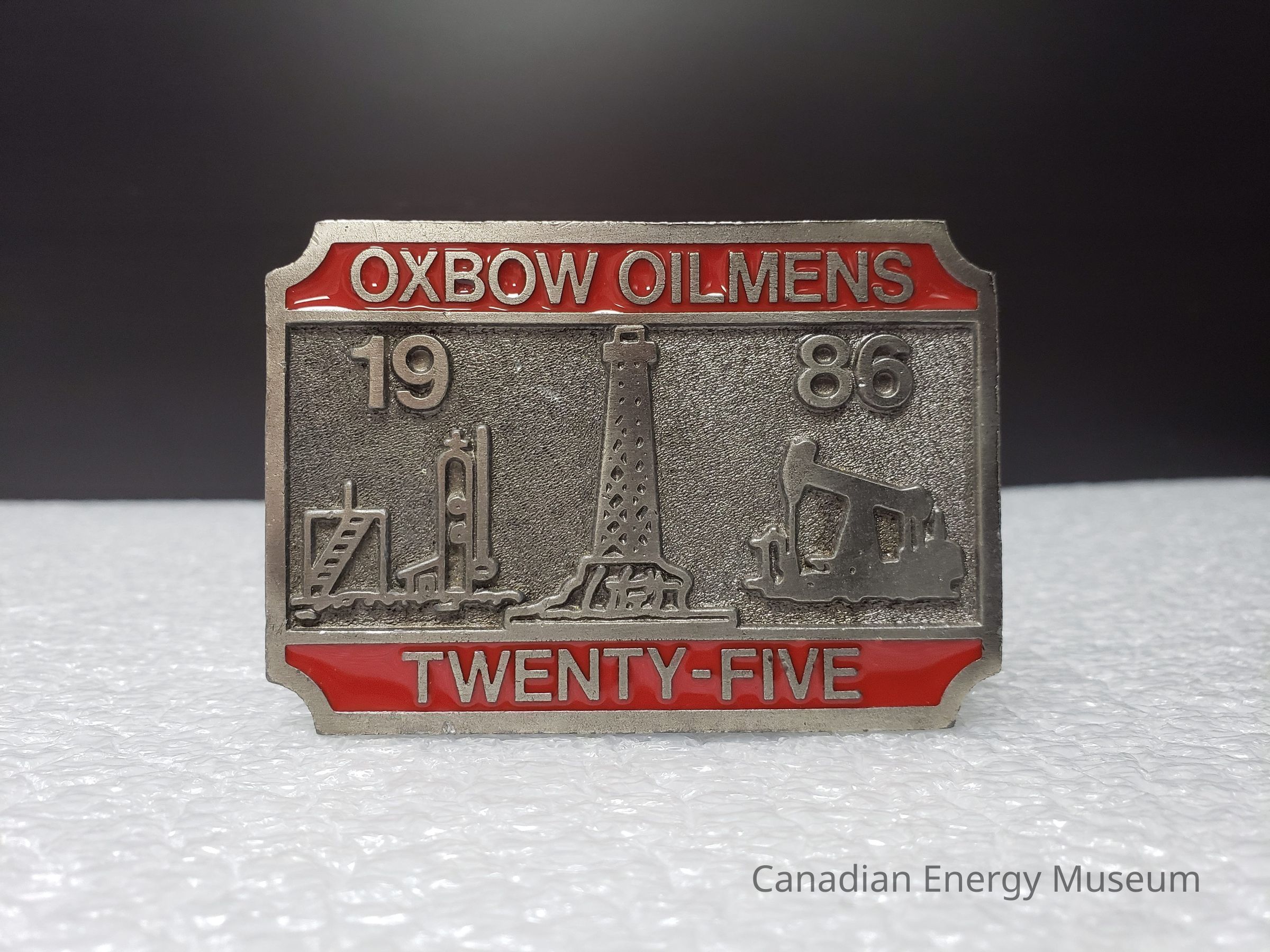 Old Description (Kelsey Dalrymple, 3 June 2020): Oxbow Oilmens Twenty-Five. Rectangular pewter belt buckle. Red enamel bar at top and bottom. Well battery on left, rig in center, pumpjack on right.Collection