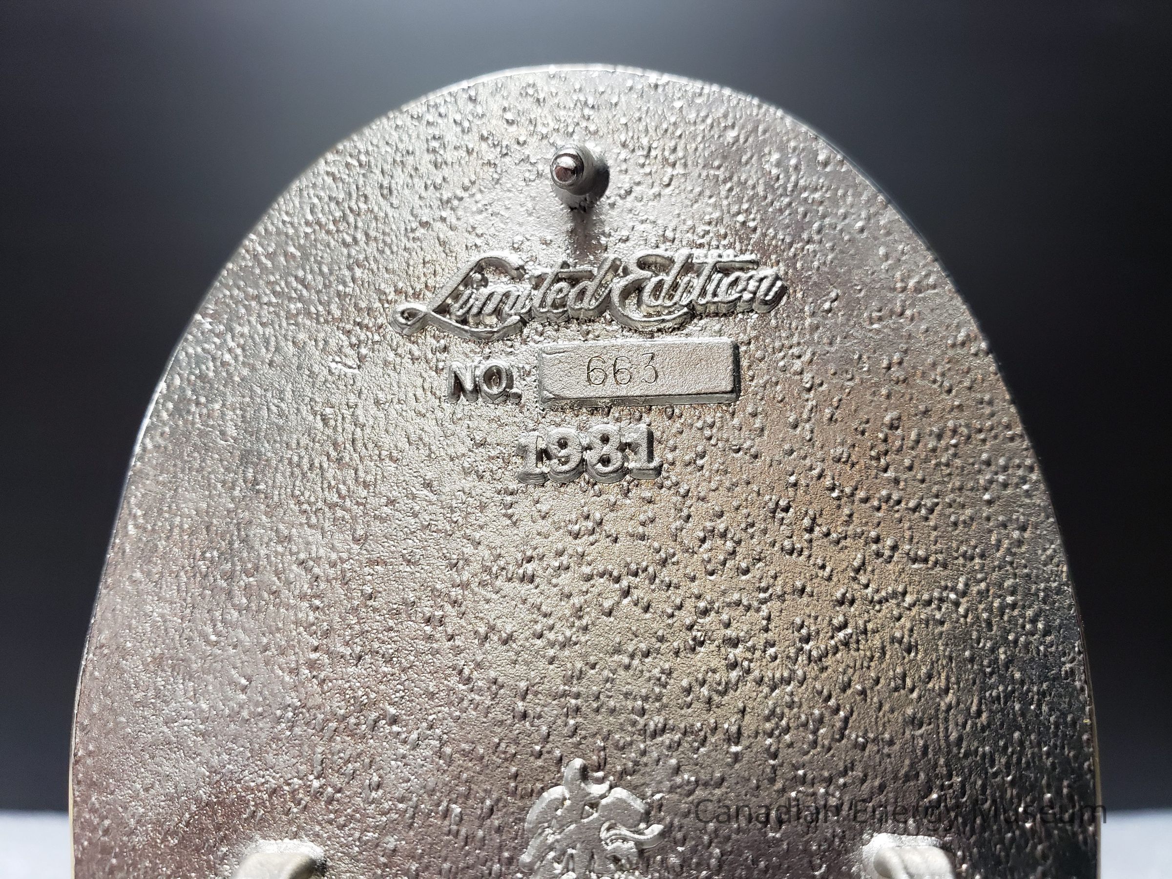 Below the hook, at the other end of the back, is the raised decorative cursive text "Limited Edition", with "NO." and a raised rectangle with the engraved limited edition number "663". Below this is the raised date "1981".