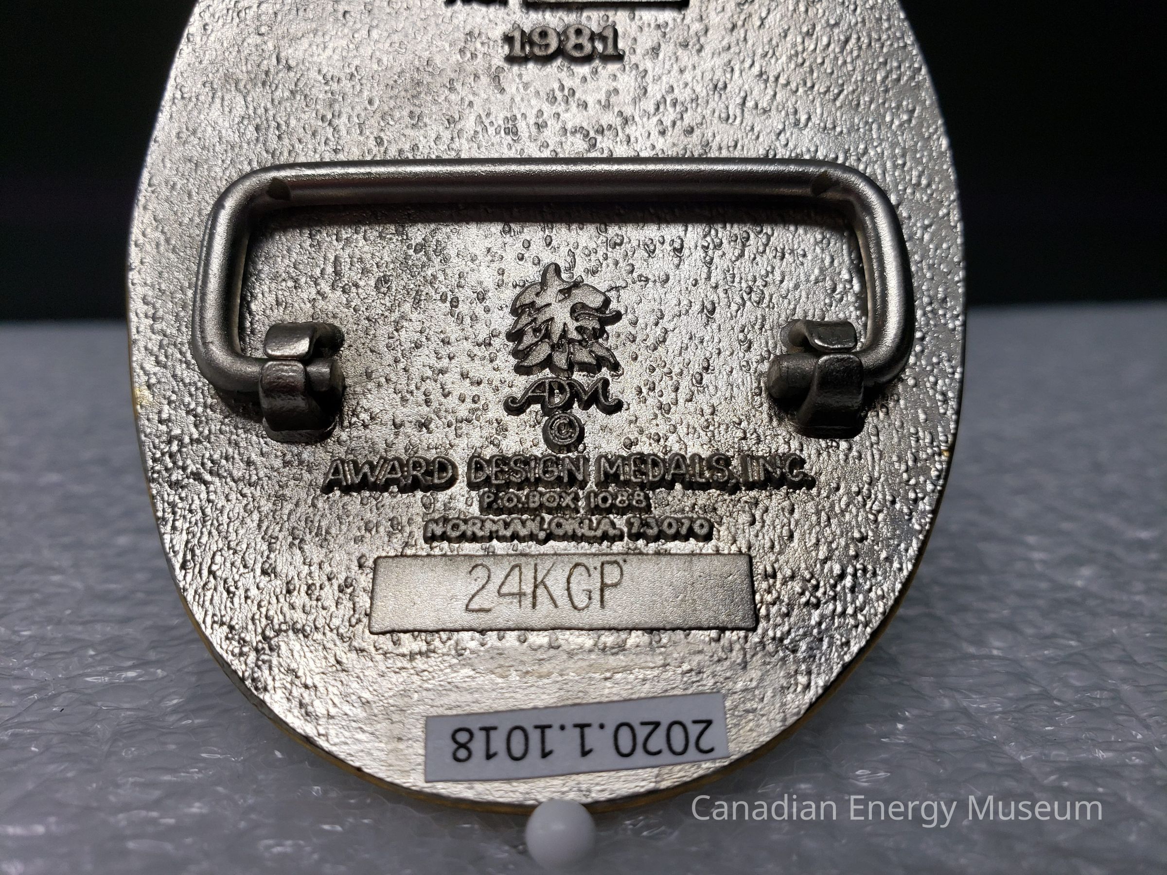 Back Elements: The back has a speckles texture, with an open-rectangular hinge, and an angled hook. The hinge is shaped into a narrow rectangle that meets the buckle at two points with open space between these points. In this open space is the maker's mark: A raised lion-head image and the stylized initials "ADM" underneath. Below this is the raised text "AWARD DESIGN MEDALS, INC.;P.O.BOX 1088; NORMAN, OKLA. 73070. Below this text is a raised bar of smooth metal with the engraved code "24KGP".