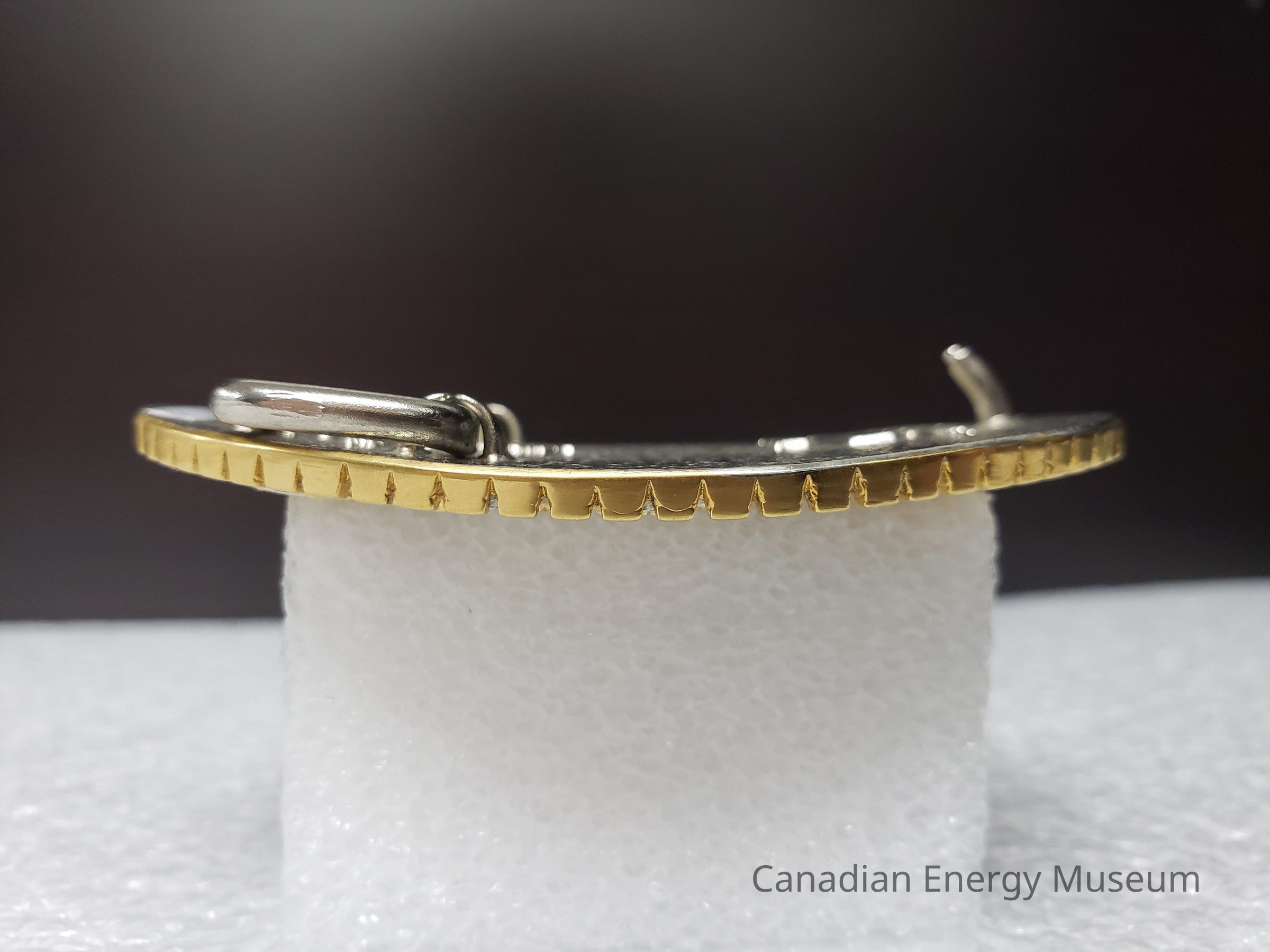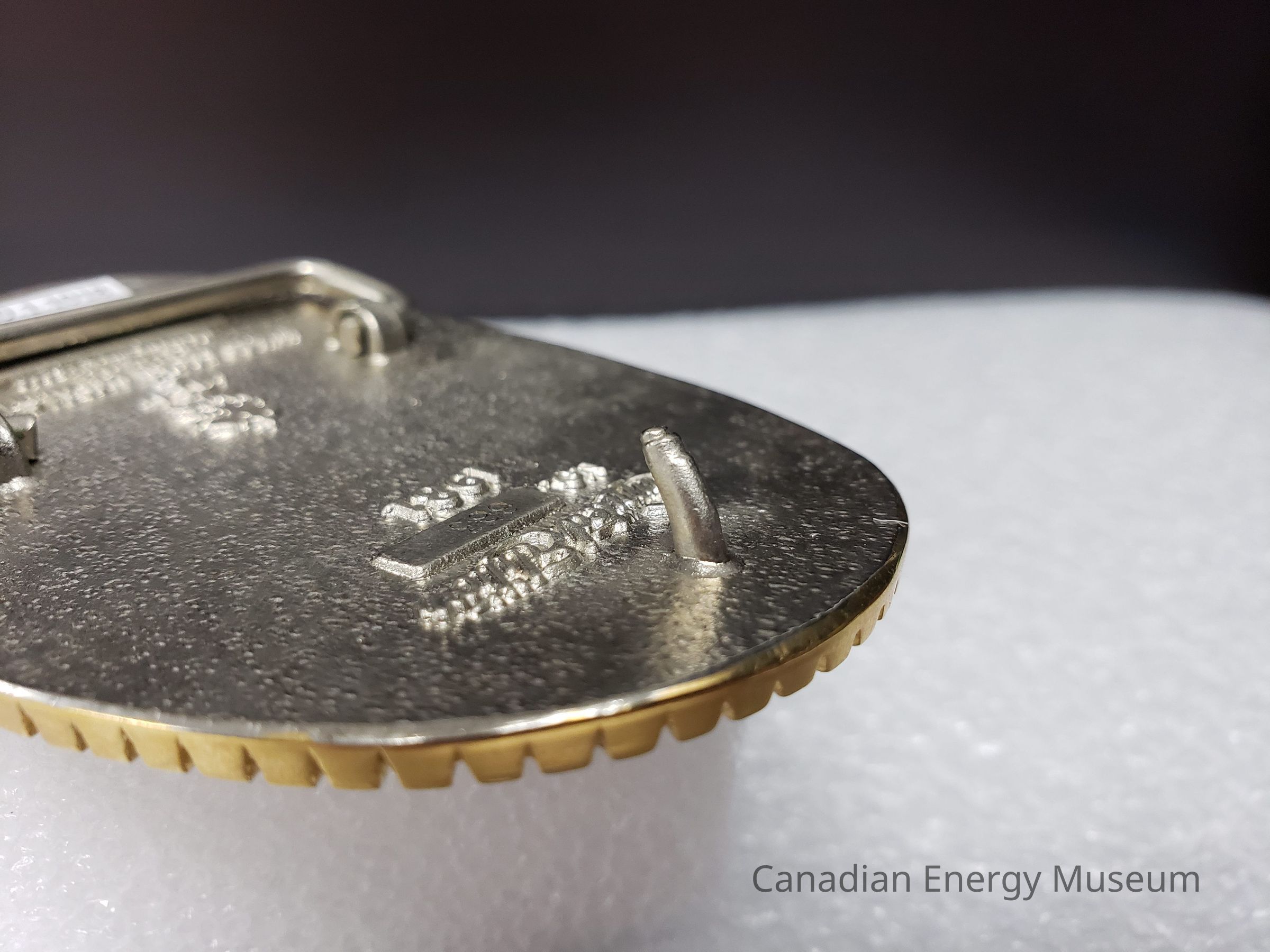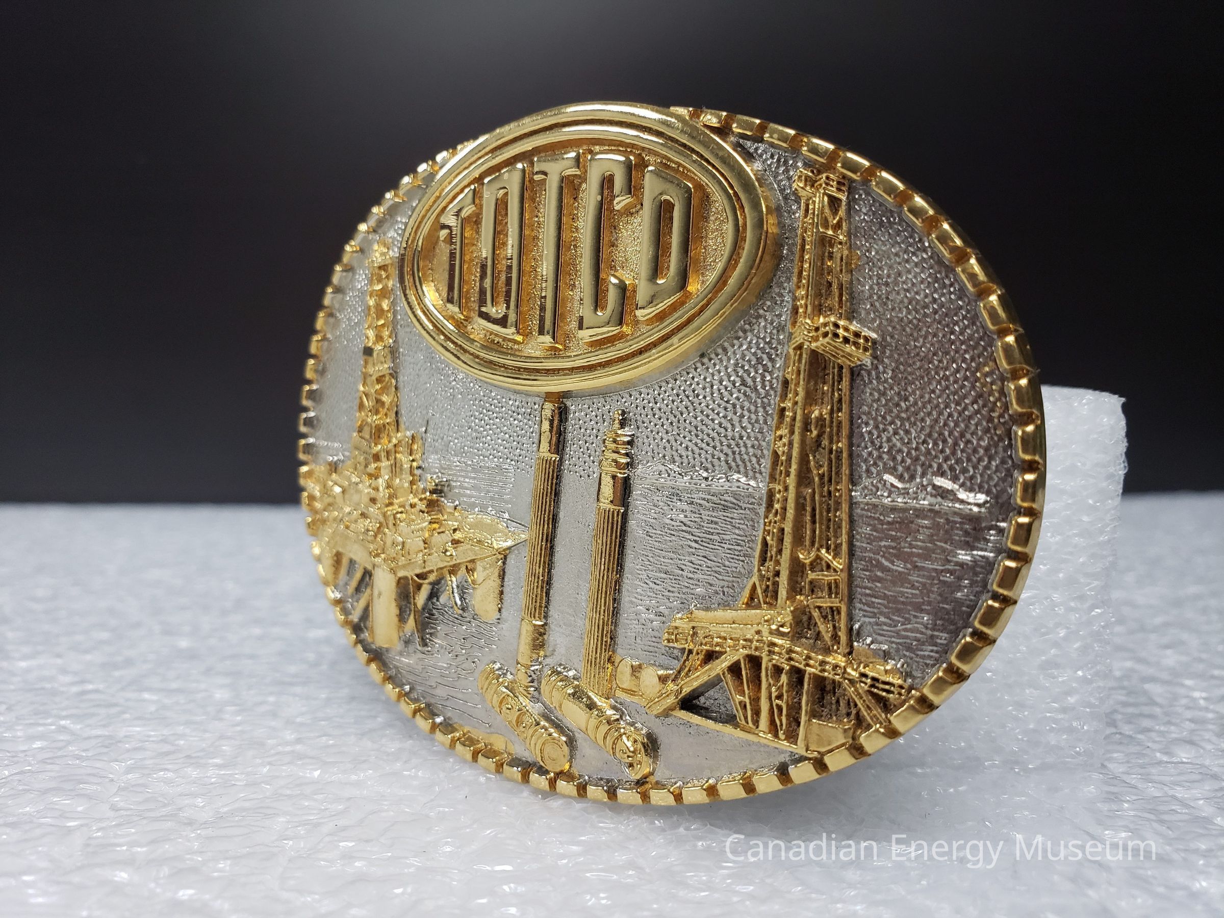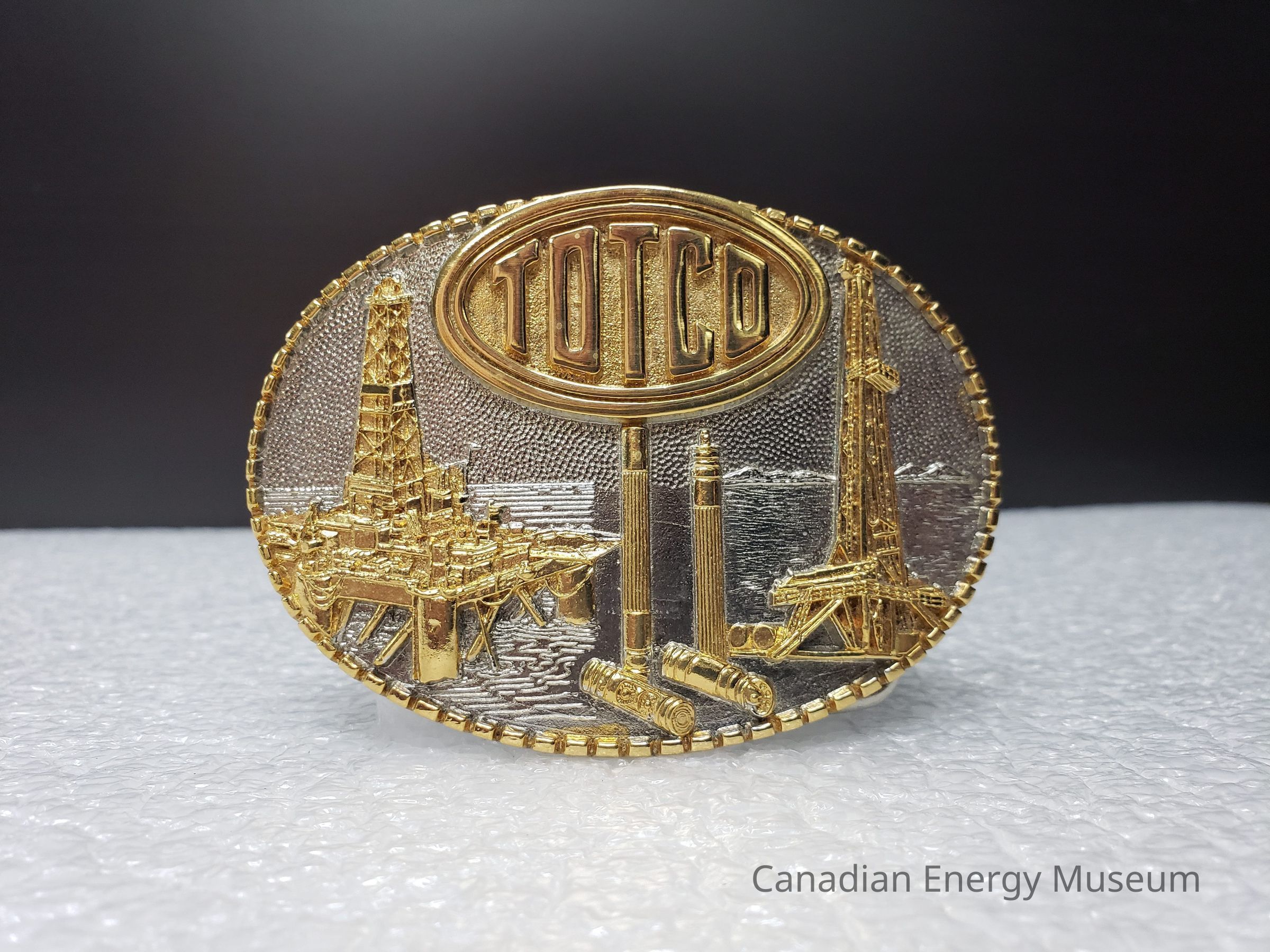 Old Description (Kelsey Dalrymple, 23 July 2020): Totco. Silver and gold oval brass belt buckle with rig and offshore rig on face. Limited edition number 663. 24 karat gold plated. (Donated by Diane Naismith)Collection