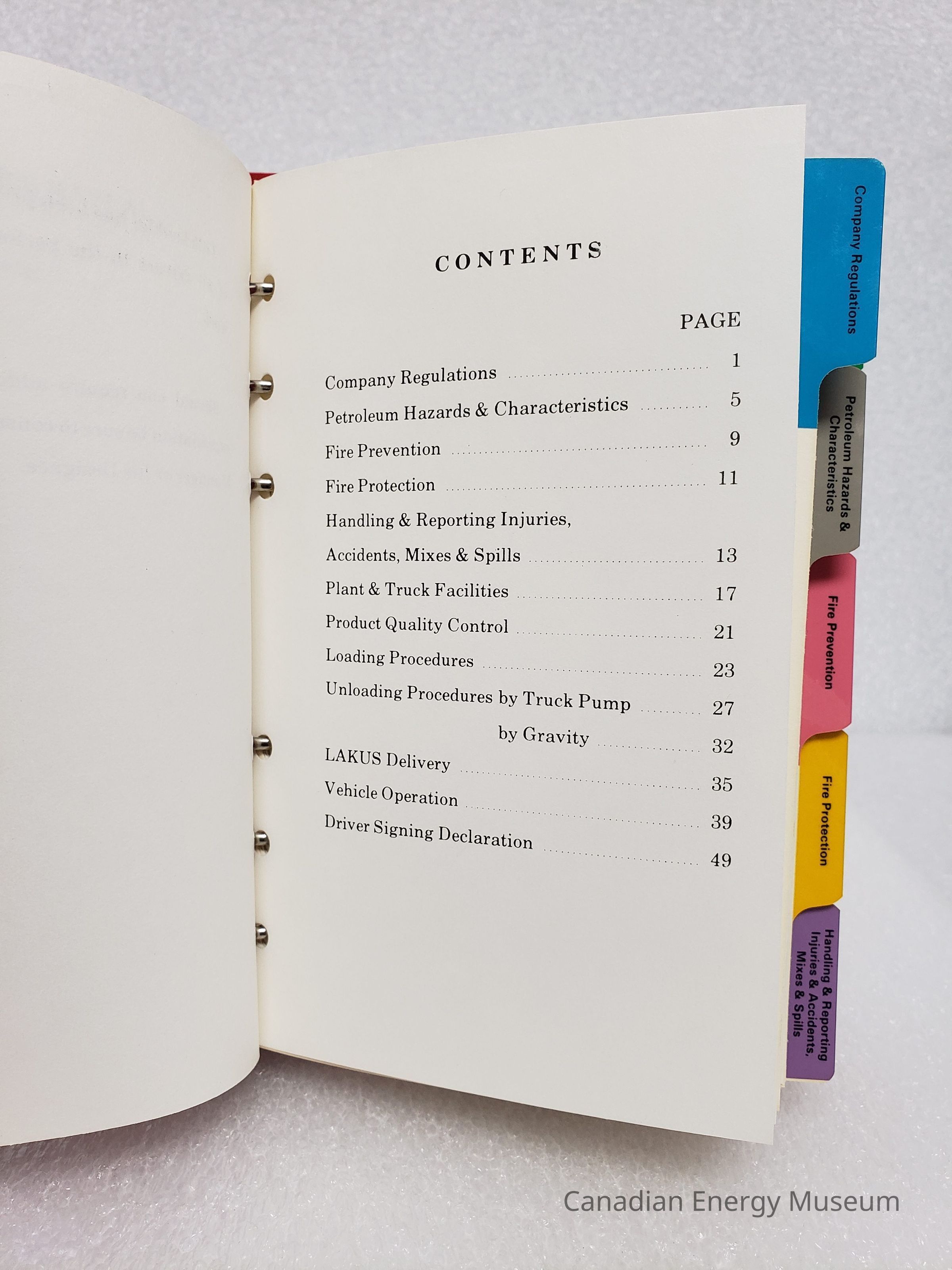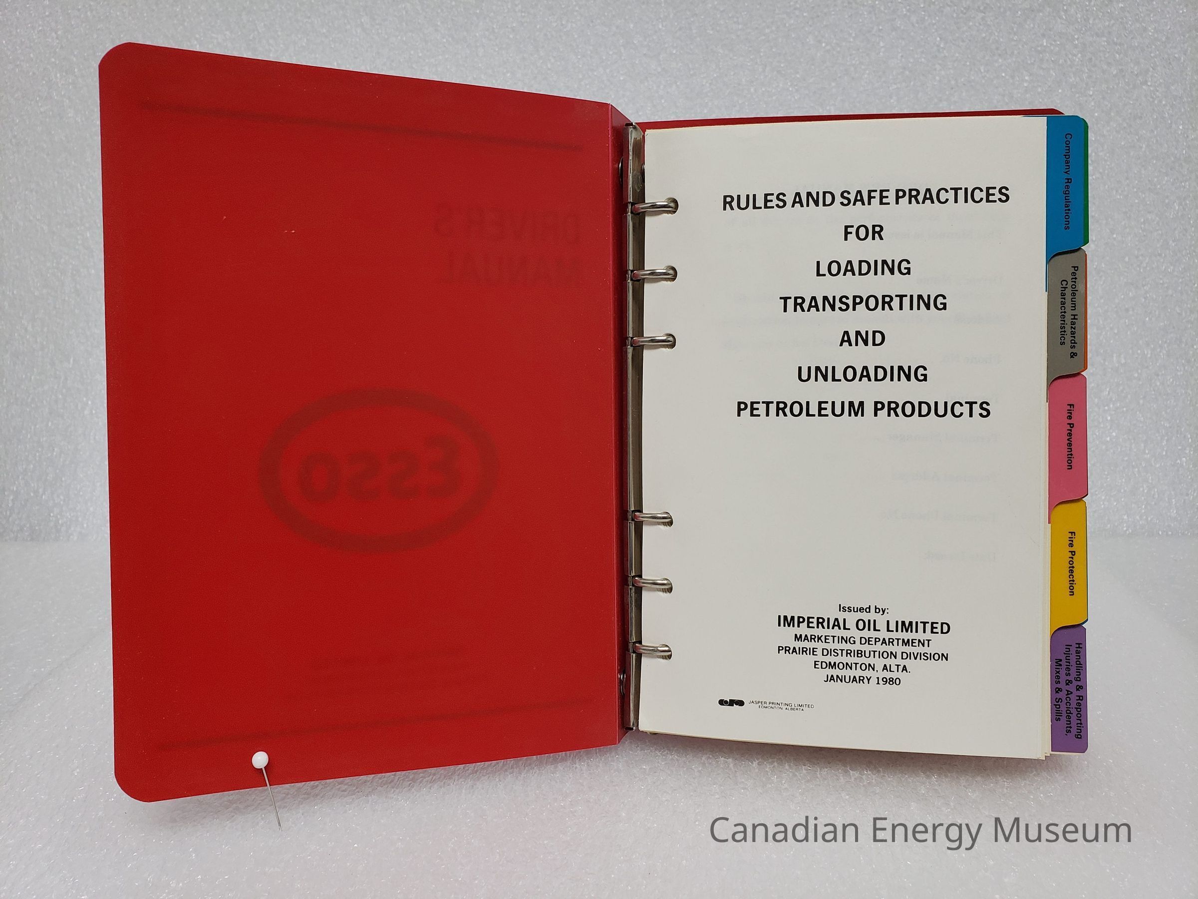 A small plastic binder, containing the Esso driver's manual, outlining the "Rules and Safety Practices for Loading, Transporting, and Unloading Petroleum Products". The small binder has ELEVEN tabbed section, with and additional pocket-sized copy of the texts in the back of the binder (assumedly meant to fit into a smaller pocket binder), for 1969 and and un-specified year.