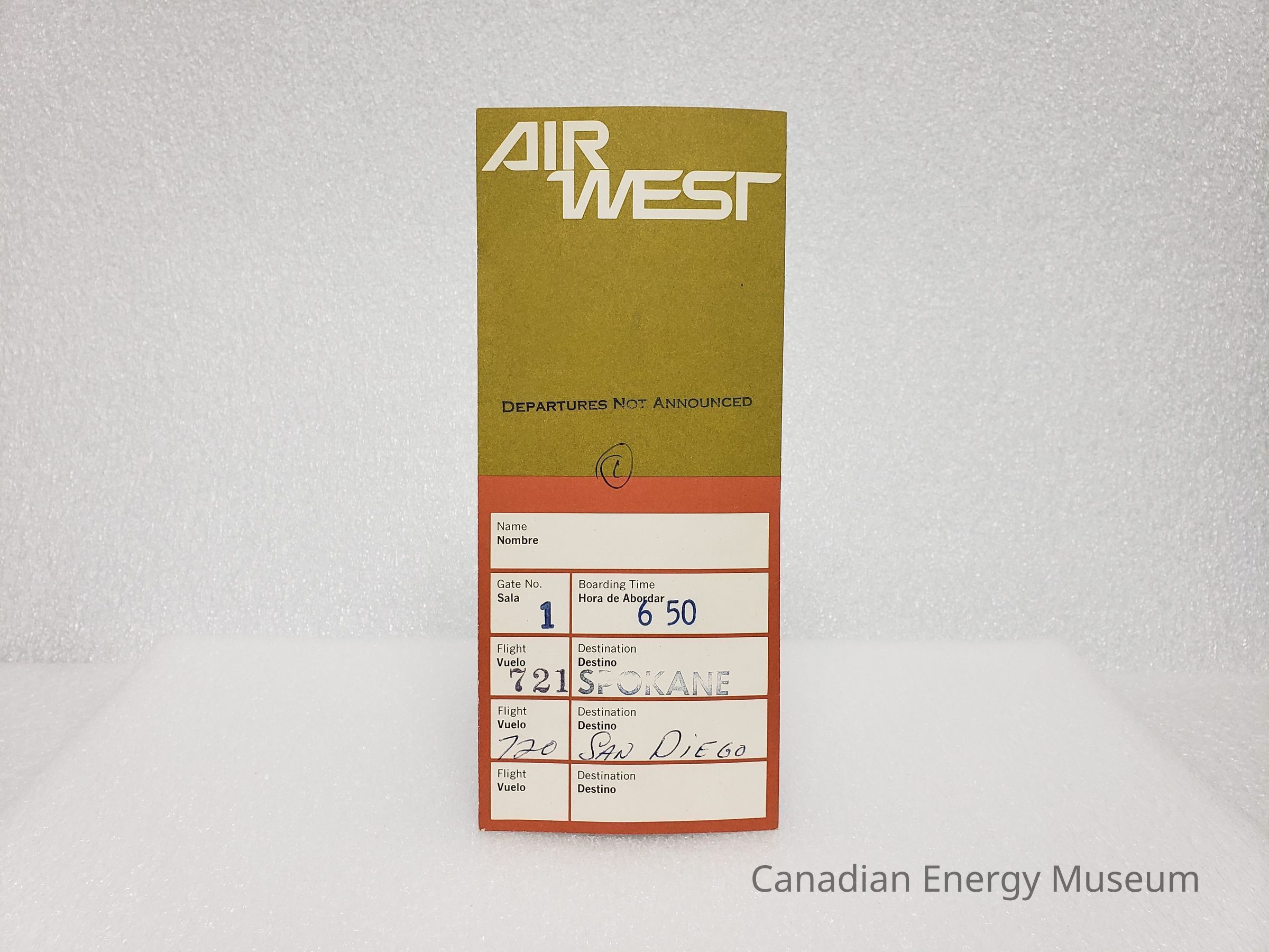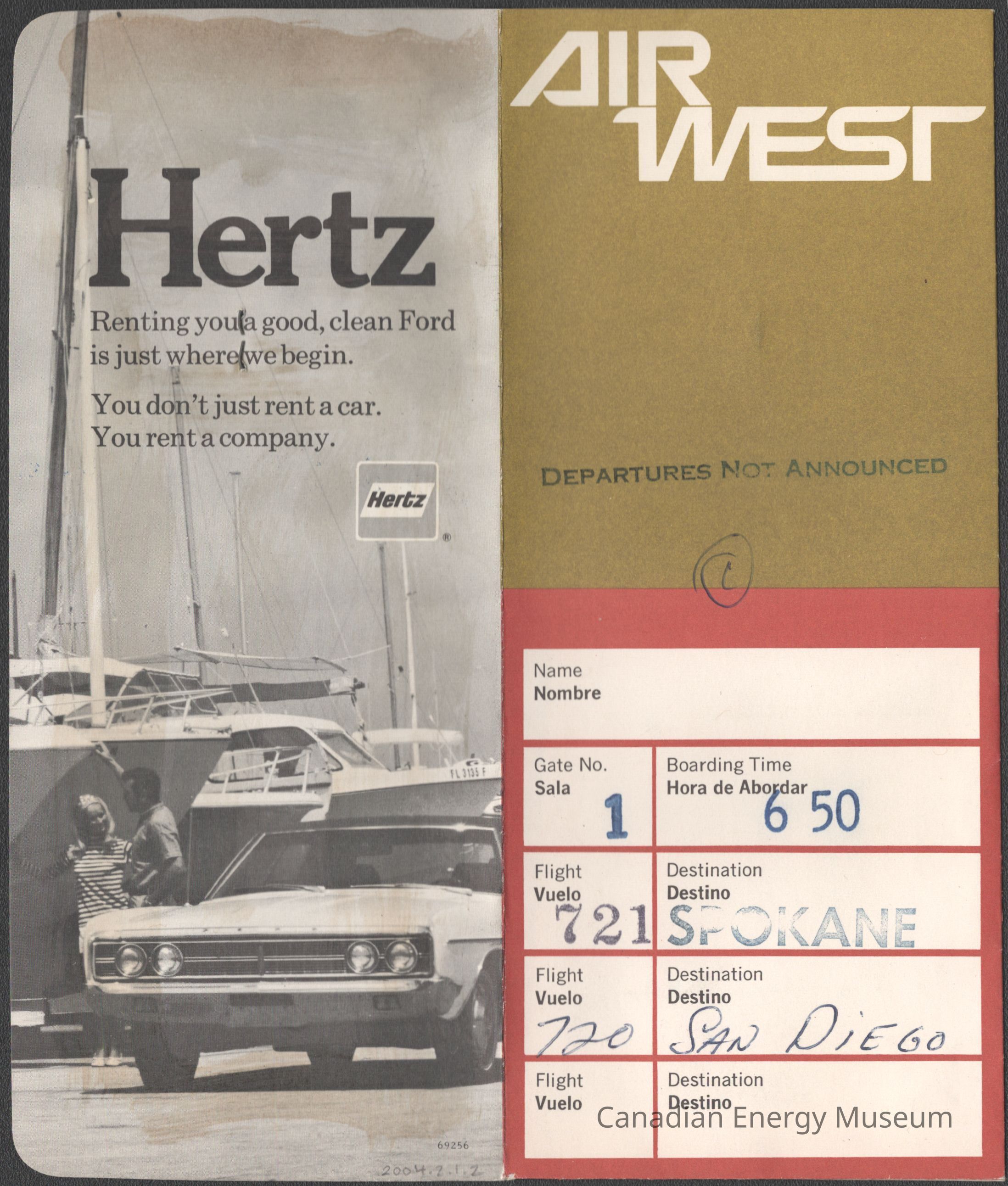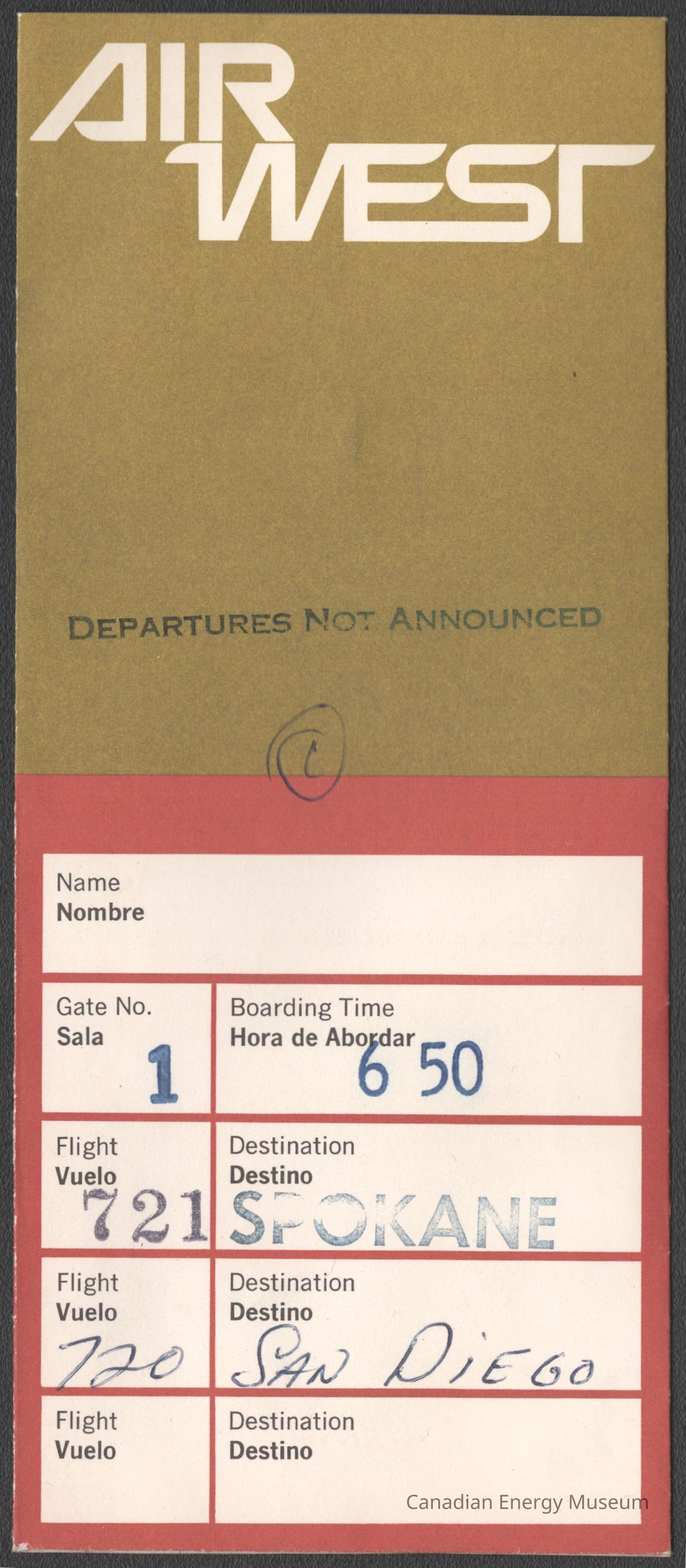 [Boarding Pass] Air West, Spokane-San Diego, c.1971Entry/Object ID