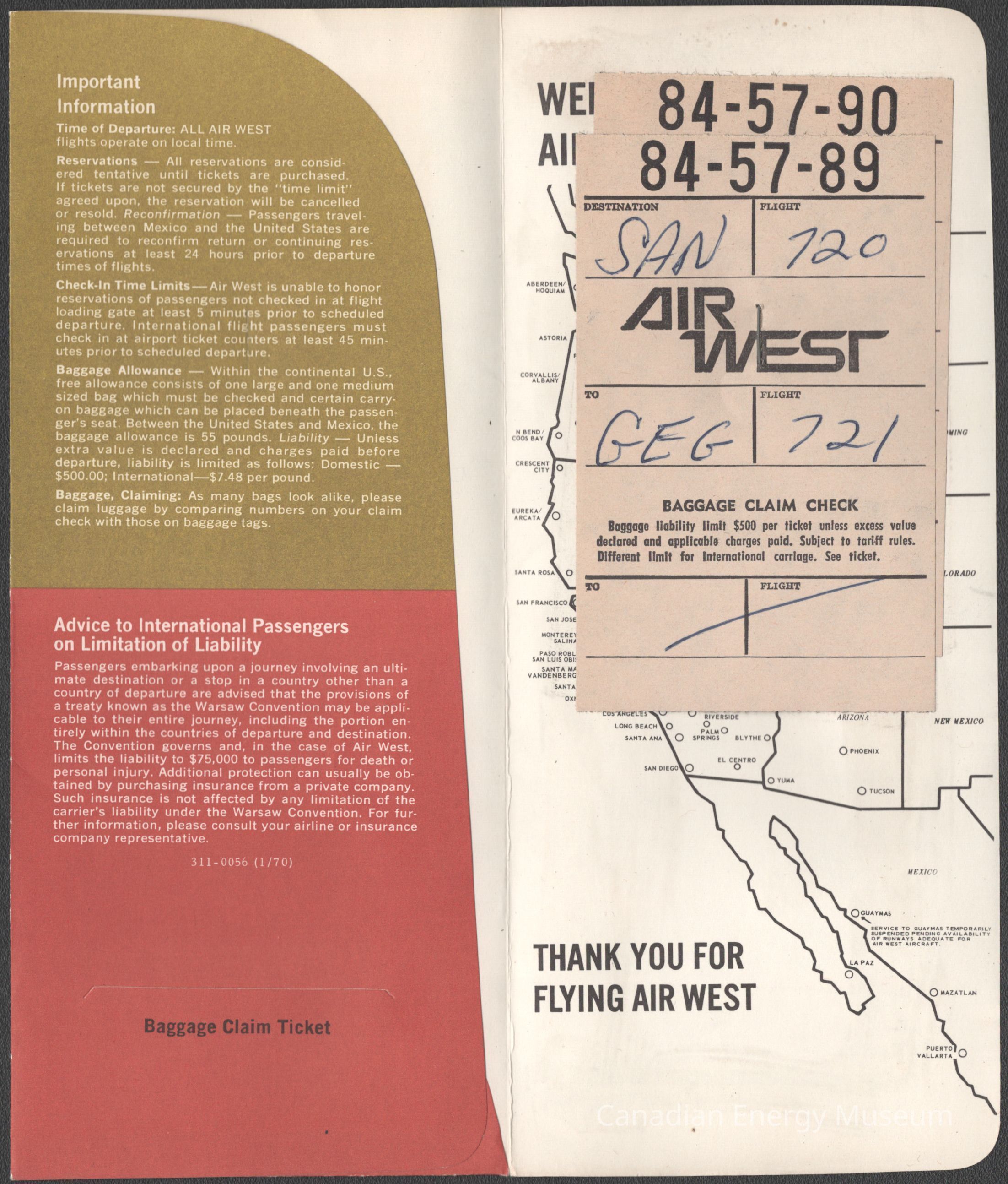A pamphlet-sized folder for an airline's boarding pass, branded to Air West with advertising for Hertz car rentals. The interior has text on flight information (reservations, check-in, baggage, etc), advice for international passengers, a pocket for baggage claim ticket(s), and a map of the western US with airports. Staples to the inside fo the back page are two small tickets (no.84-57-90 and no. 84-57-89) with handwritten flight details.