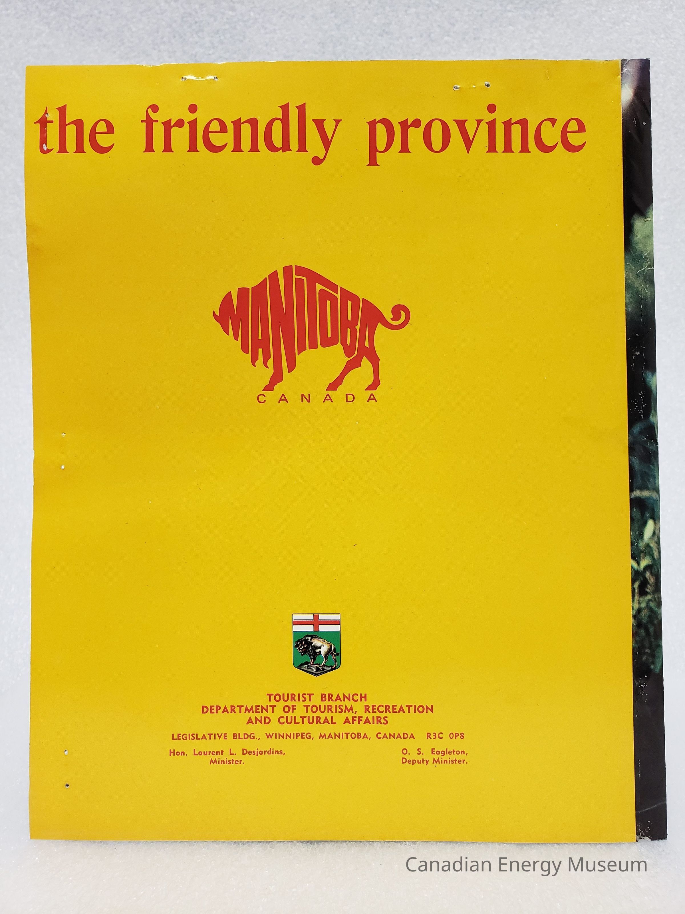 The back cover is yellow, with the red serif text "the friendly province" across the top; the Manitoba logo of a bison made of text in the centre; and centred a the bottom is the Manitoba coat of arms with the red sanserif text "TOURIST BRANCH; DEPARTMENT OF TOURISM, RECREATION AND CULTURAL AFFAIRS; LEGISLATIVE BLDG., WINNIPEG, MANITOBA, CANADA R3C 0P8; Hon. Laurent L. Desjardins, Minister.; O.S. Eagleton, Deputy Minister.".