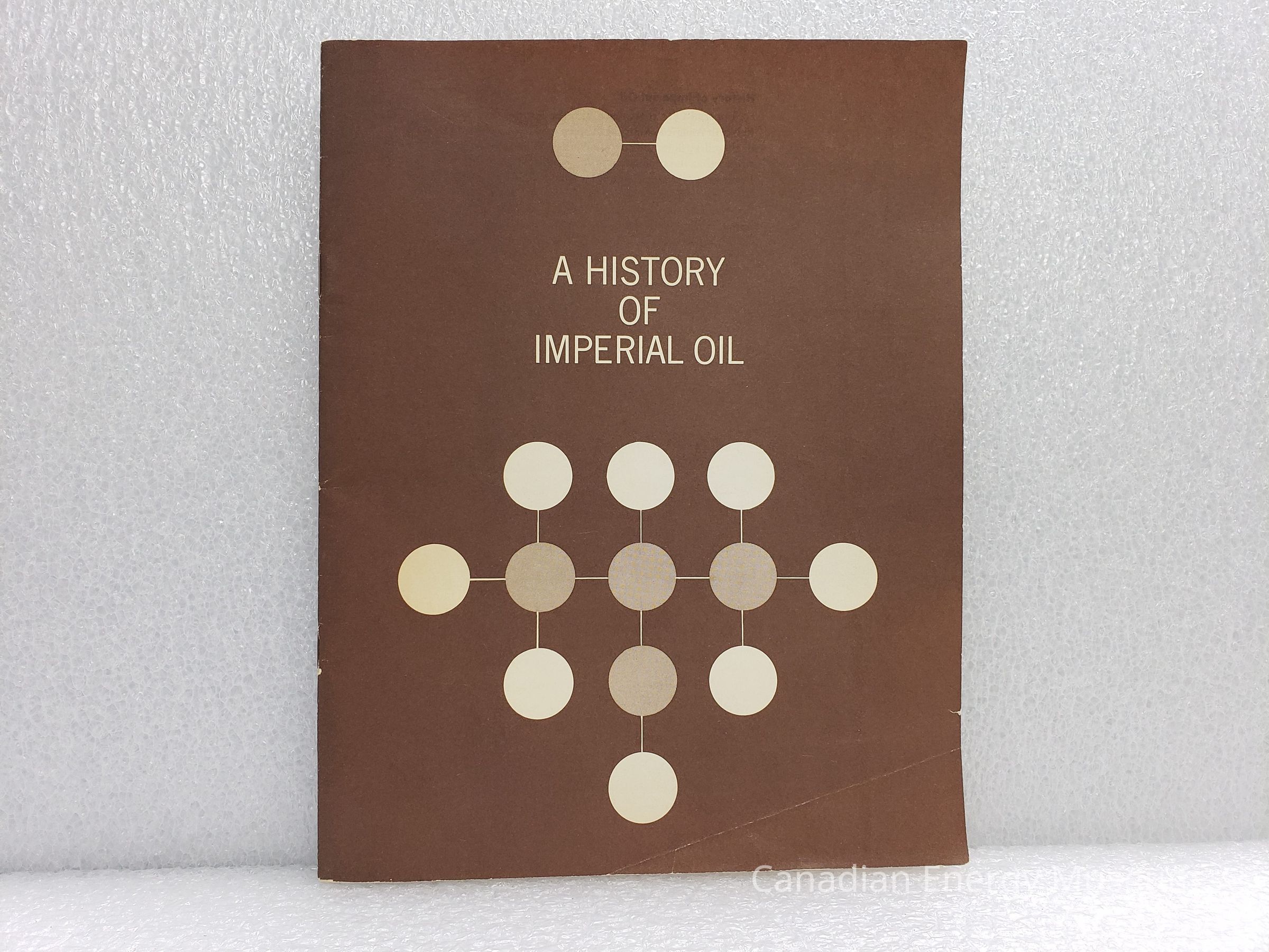 A 31-page booklet titled "A History of Imperial Oil". Contains text adapted from the book "Petroleum—Prehistoric to Petrochemicals", by G.A. Purdy. The booklet is dated to the late 1960s, based on the dates in the text. The cover features a molecule-like circle and line design on white/cream on a brown background. Saddle-stitch binding (stapled).Collection