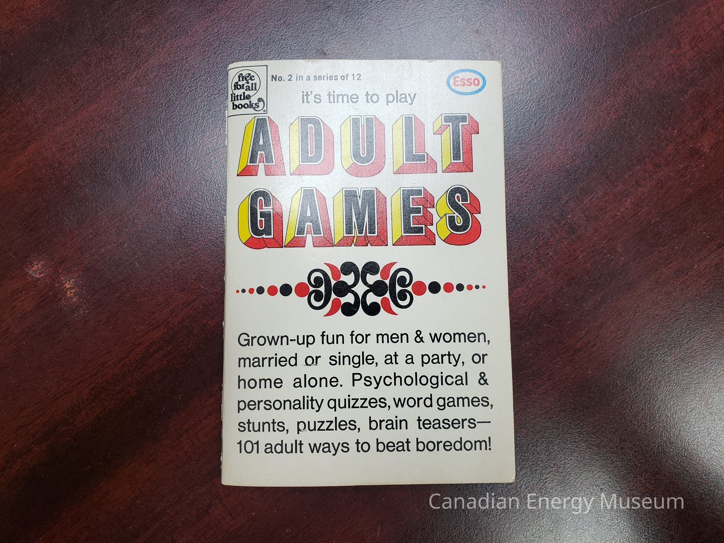 An entertainment booklet, featuring various games and activities for adults. Produced as part of Esso's series of pocket booklets on assorted topics.
