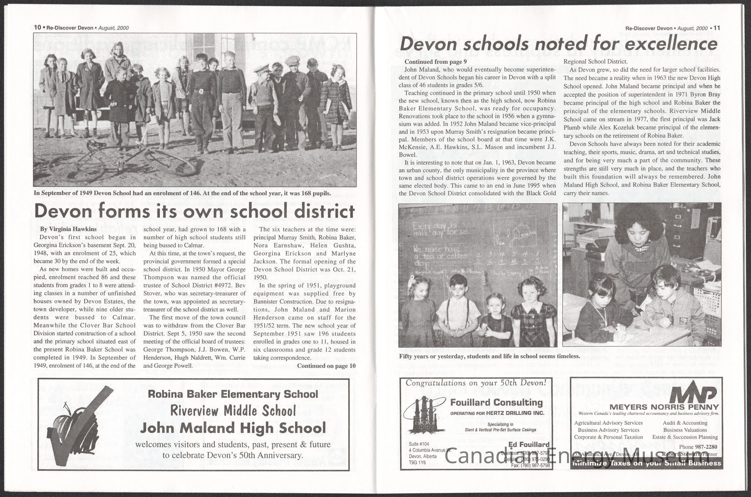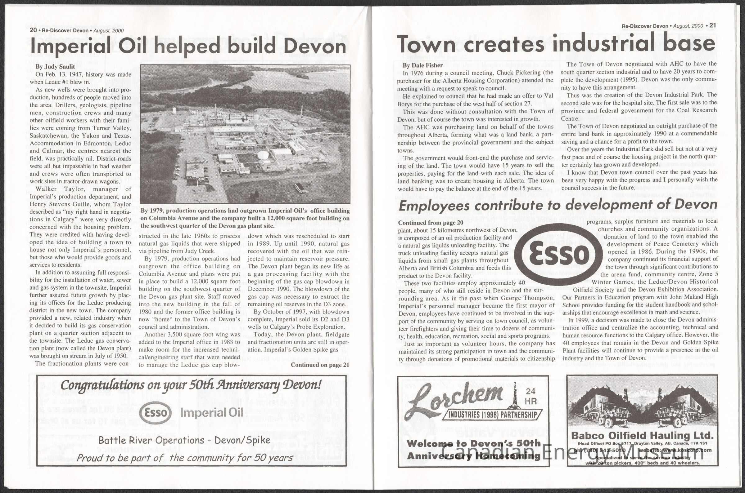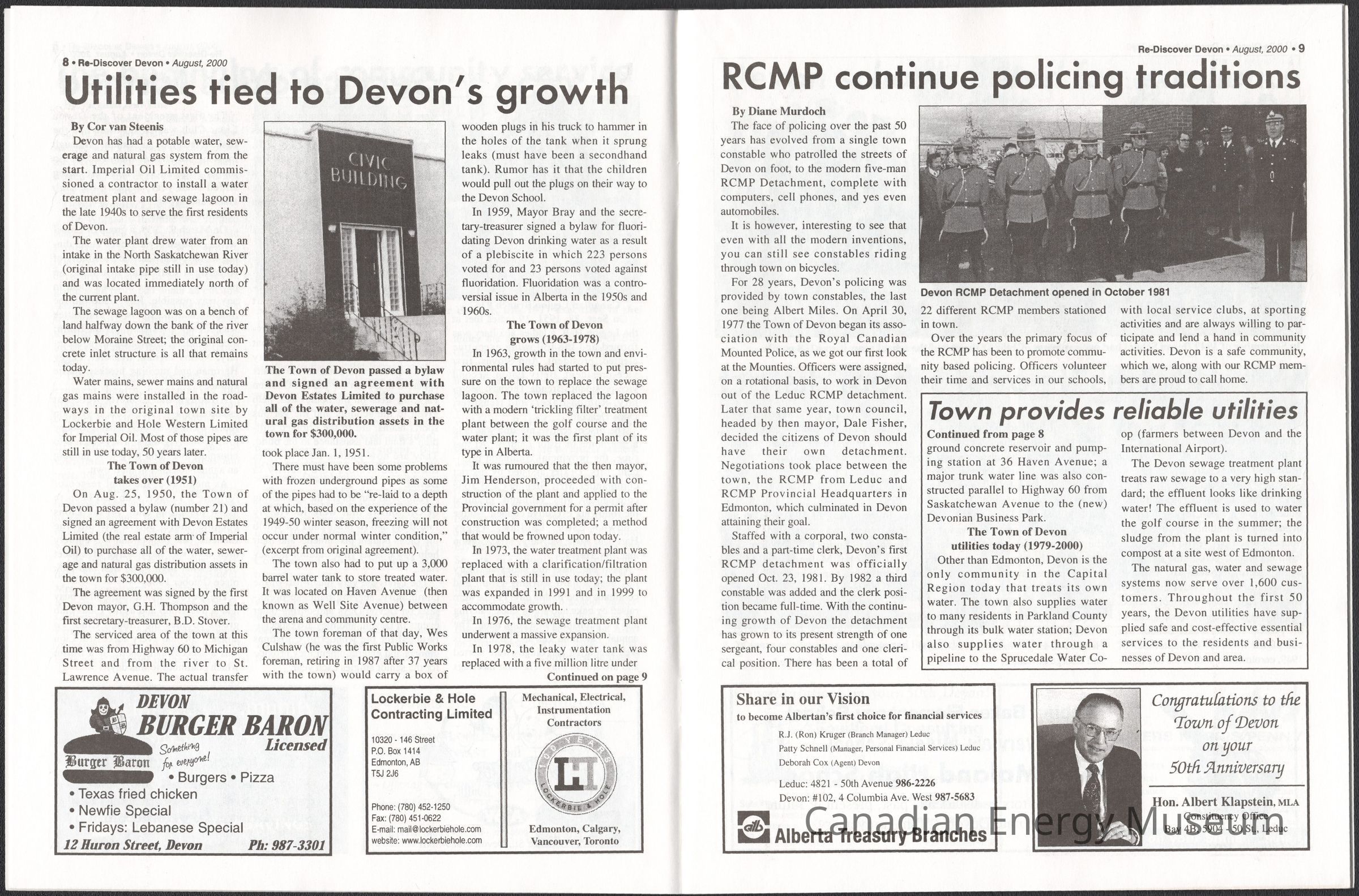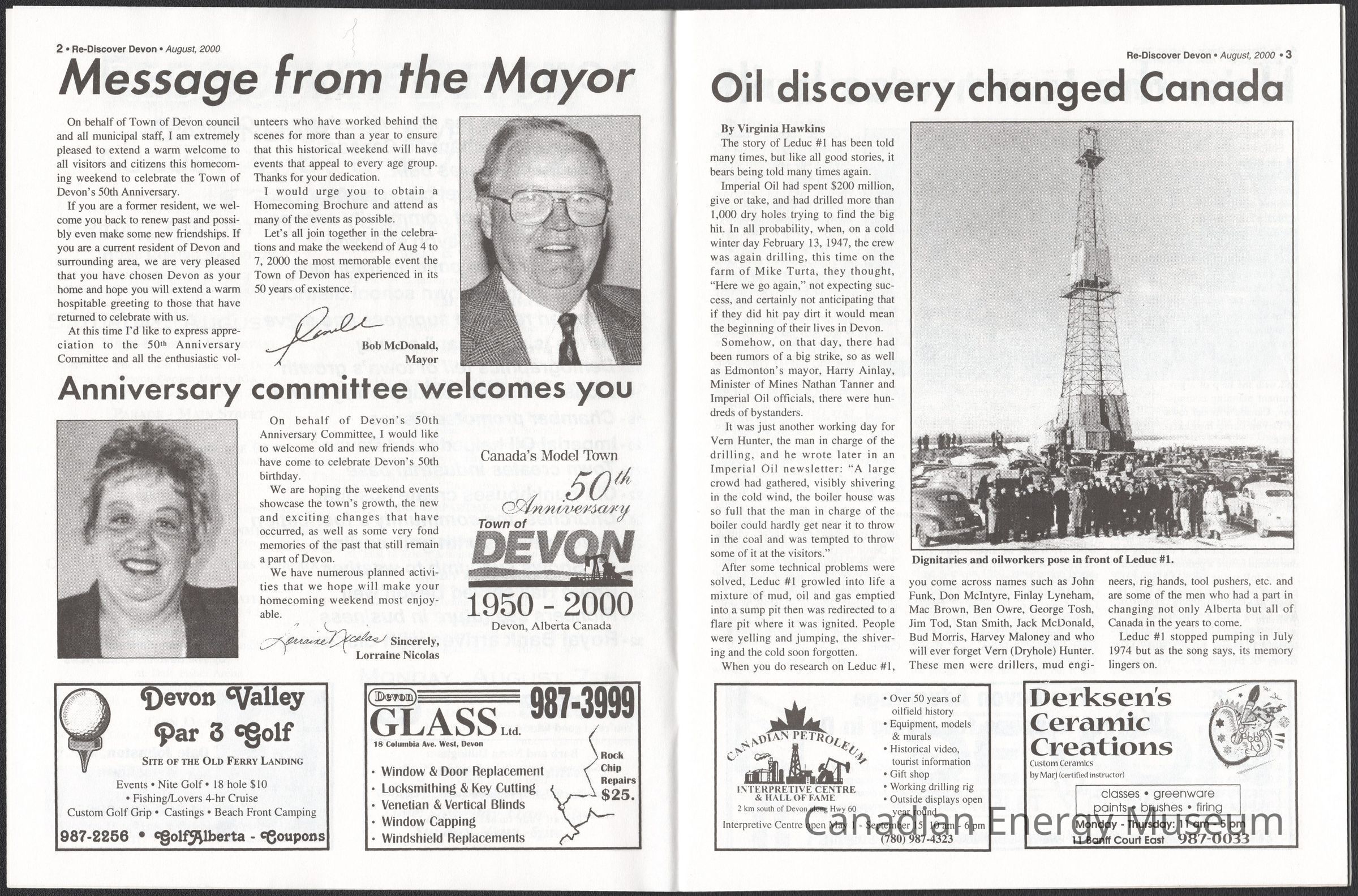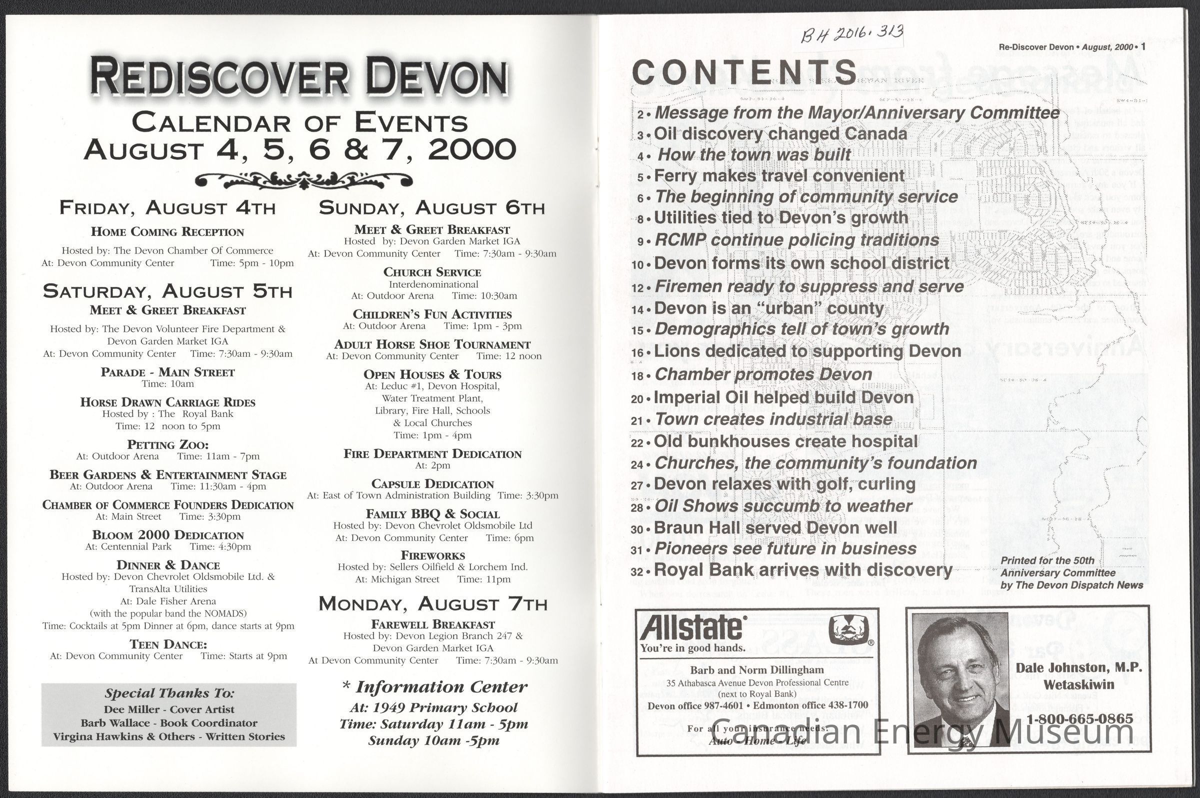 A large-format booklet produced by the Town of Devon for its 50th anniversary. The publication contains brief articles on the town's history and key events/developments.