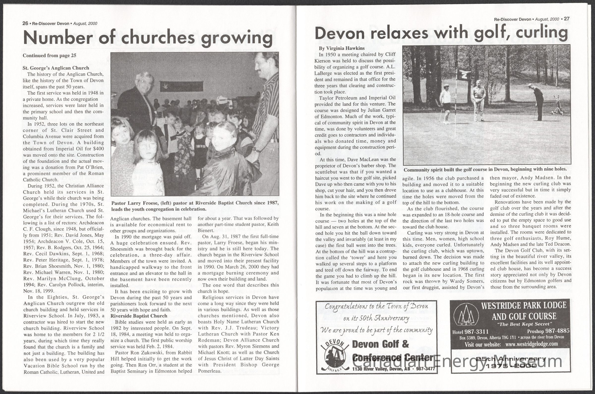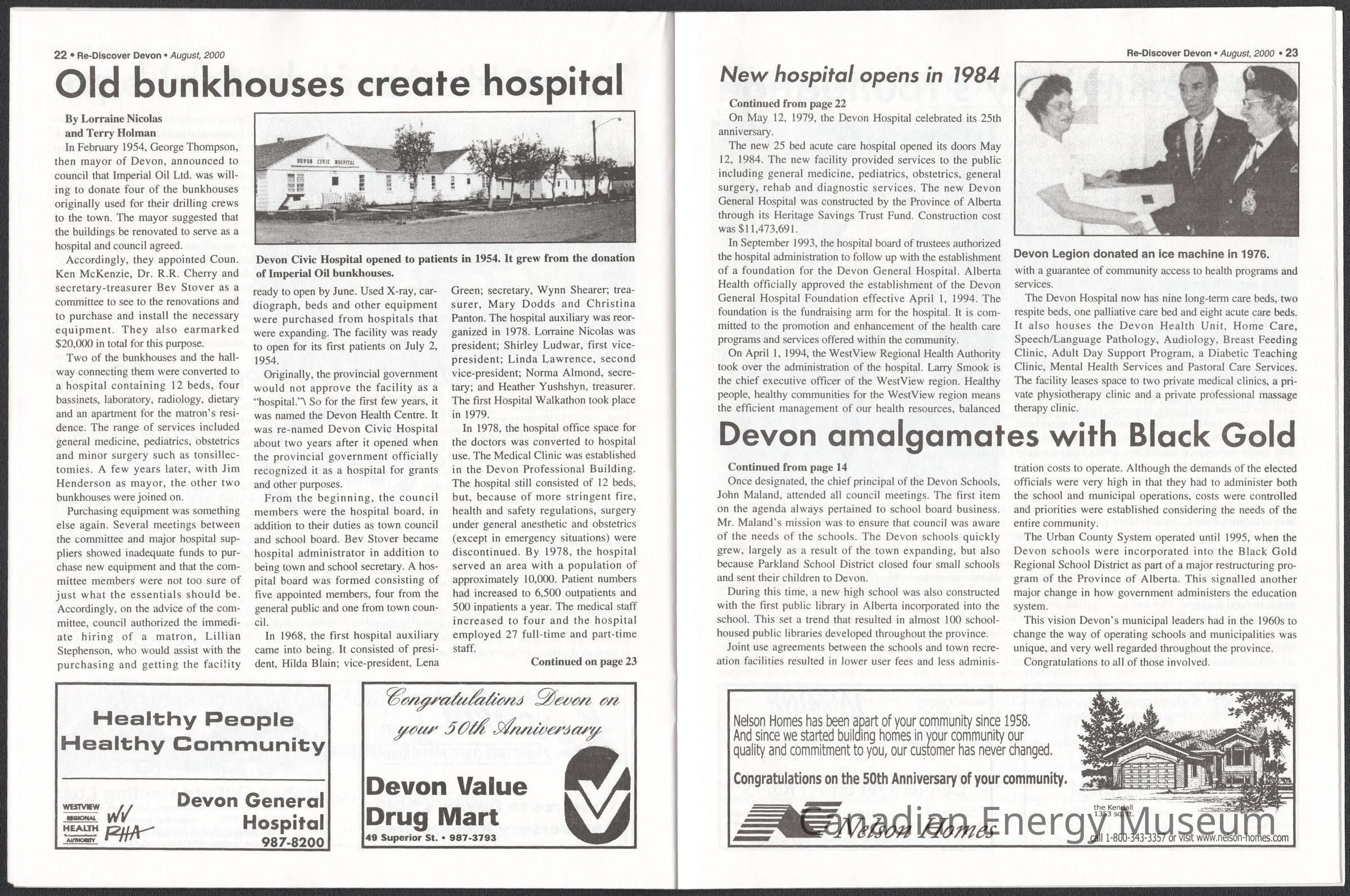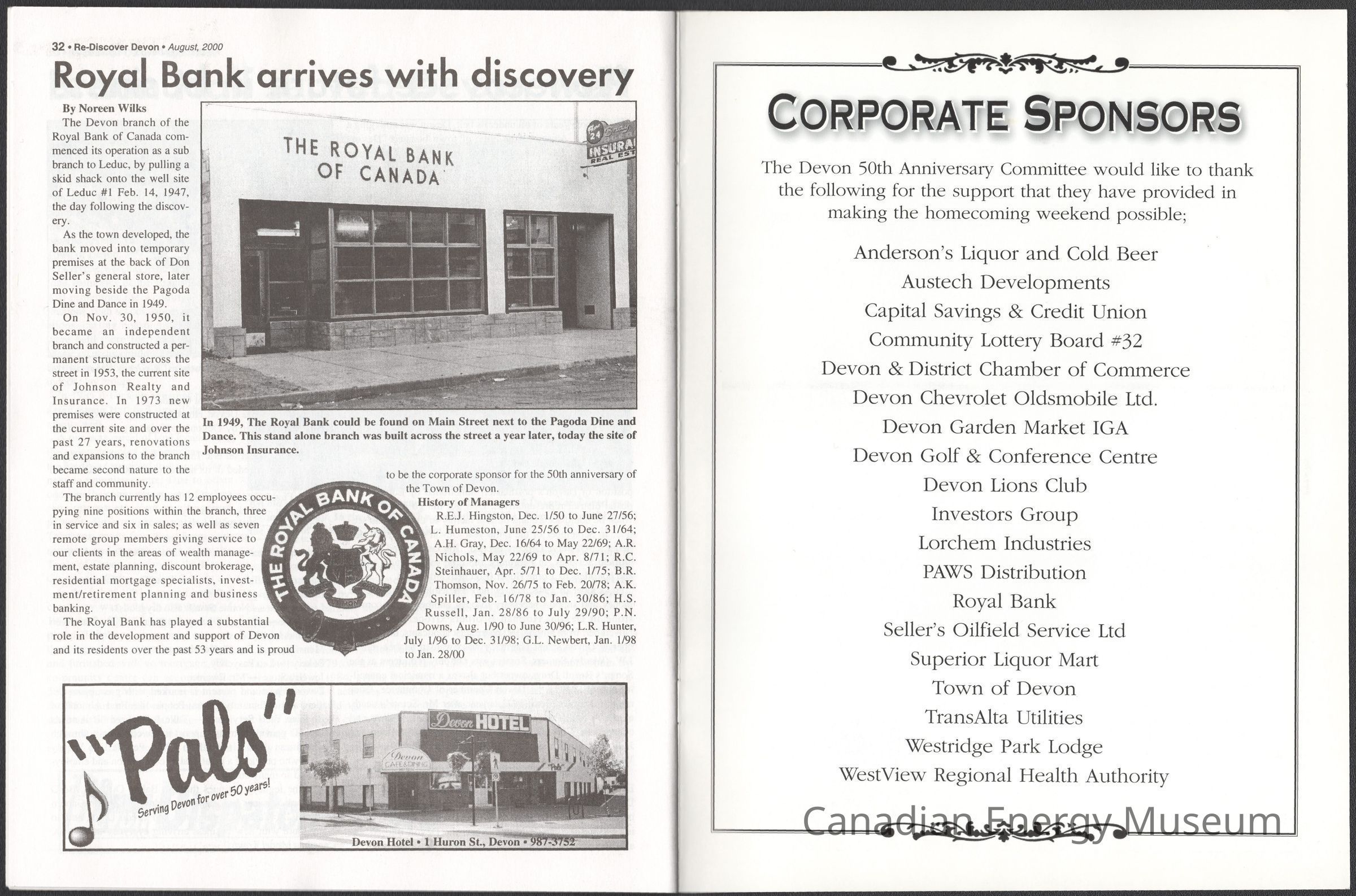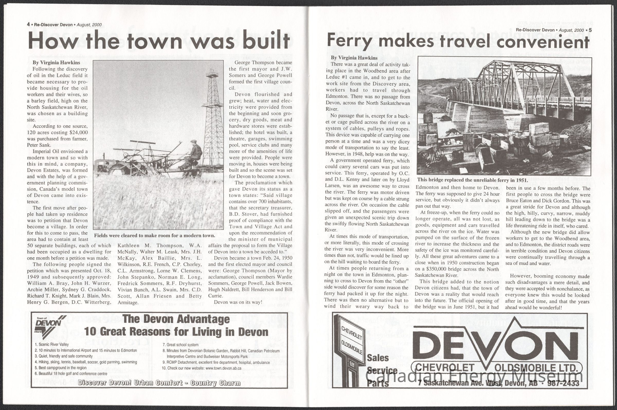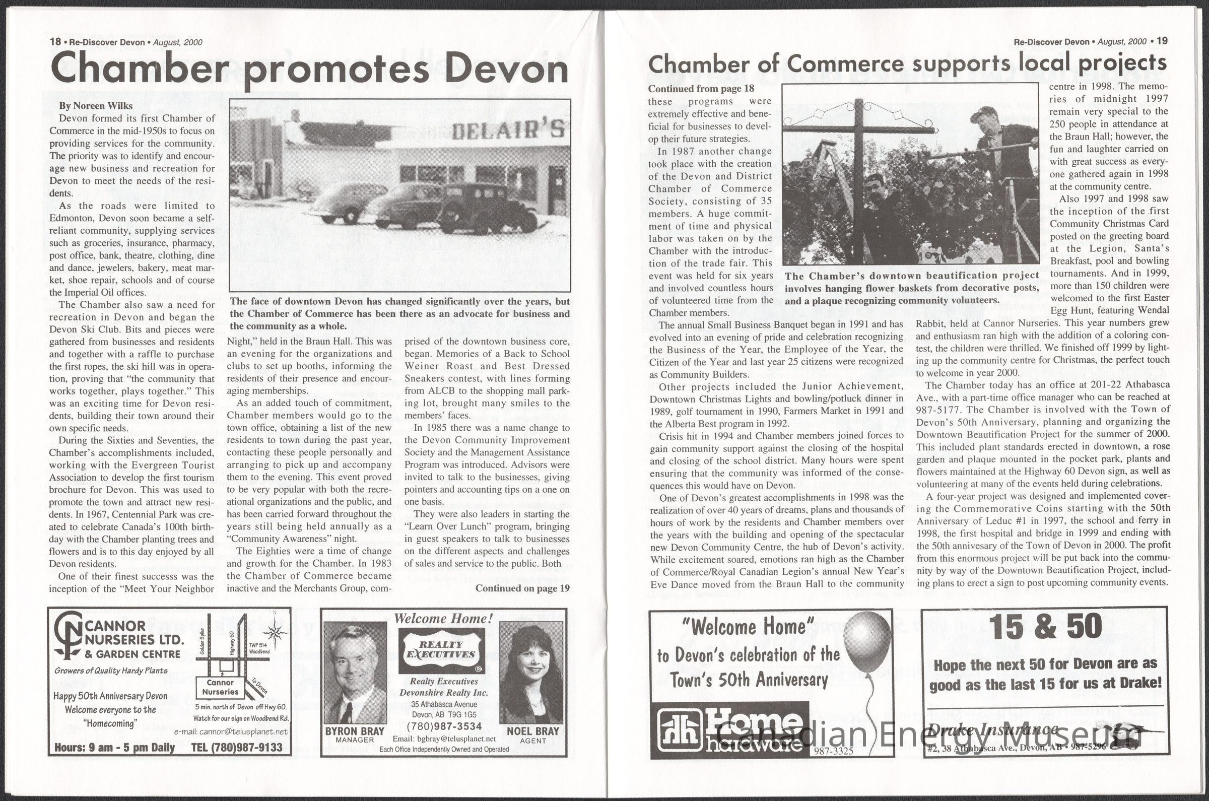 A large-format booklet produced by the Town of Devon for its 50th anniversary. The publication contains brief articles on the town's history and key events/developments.