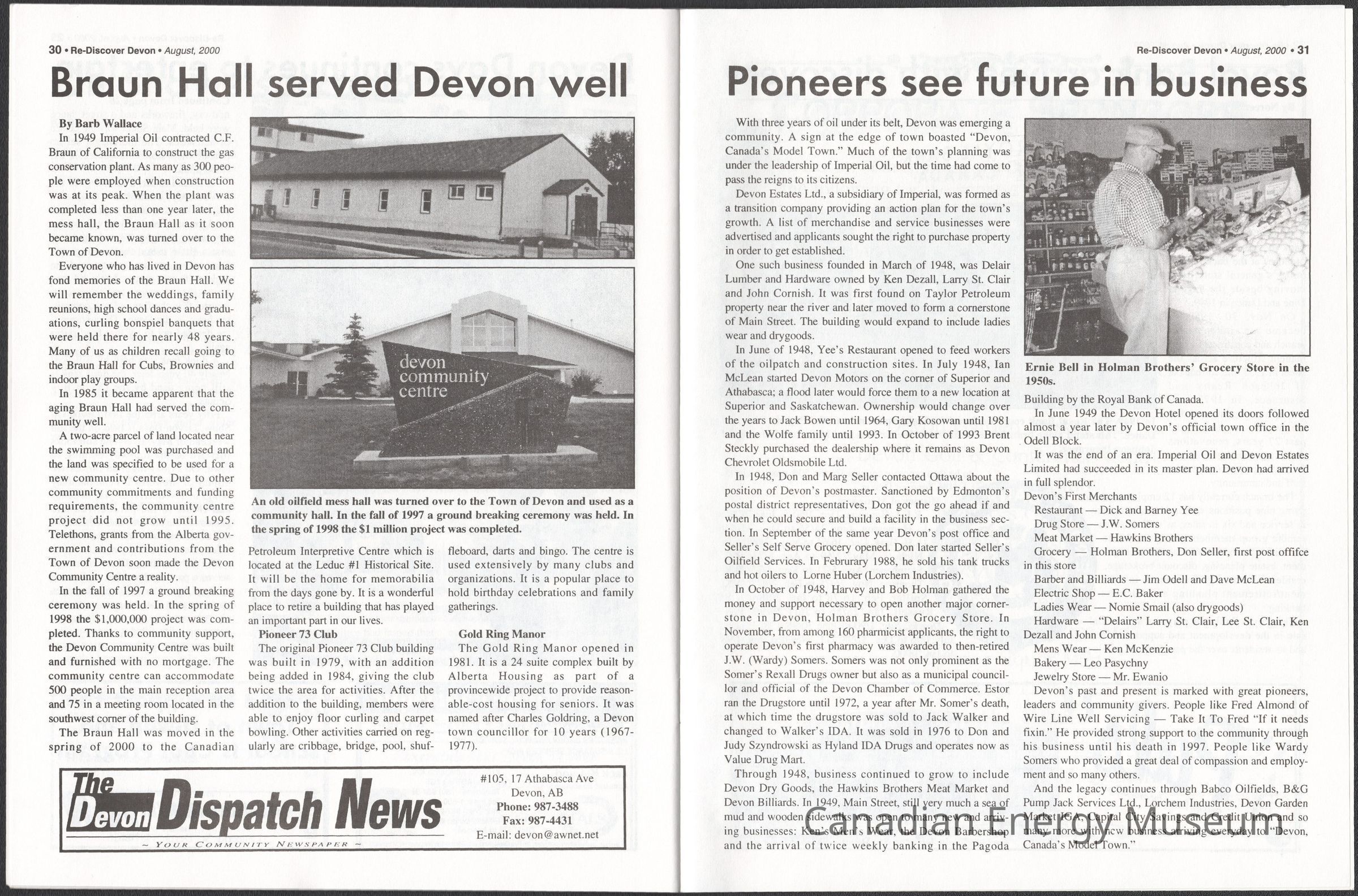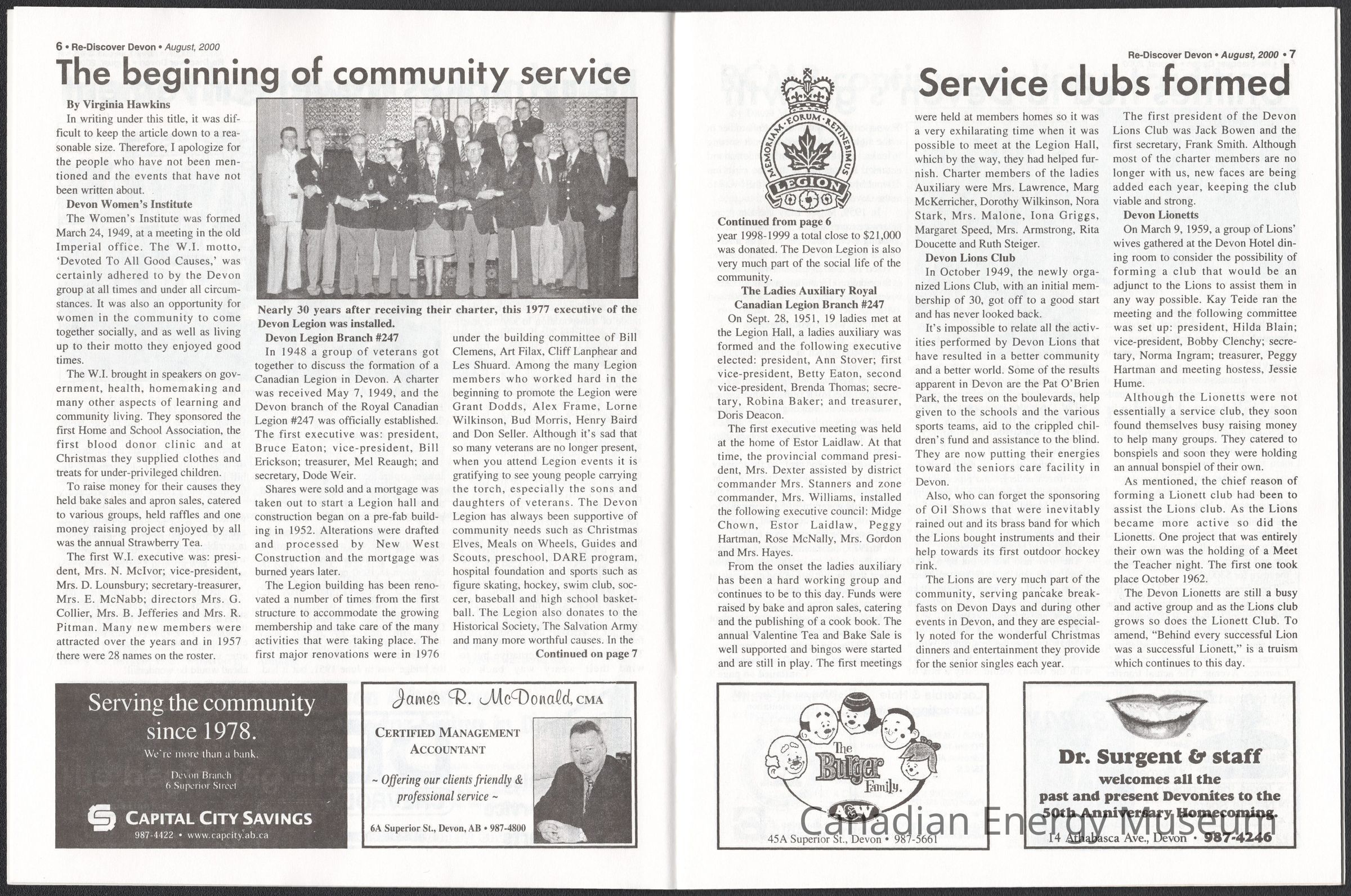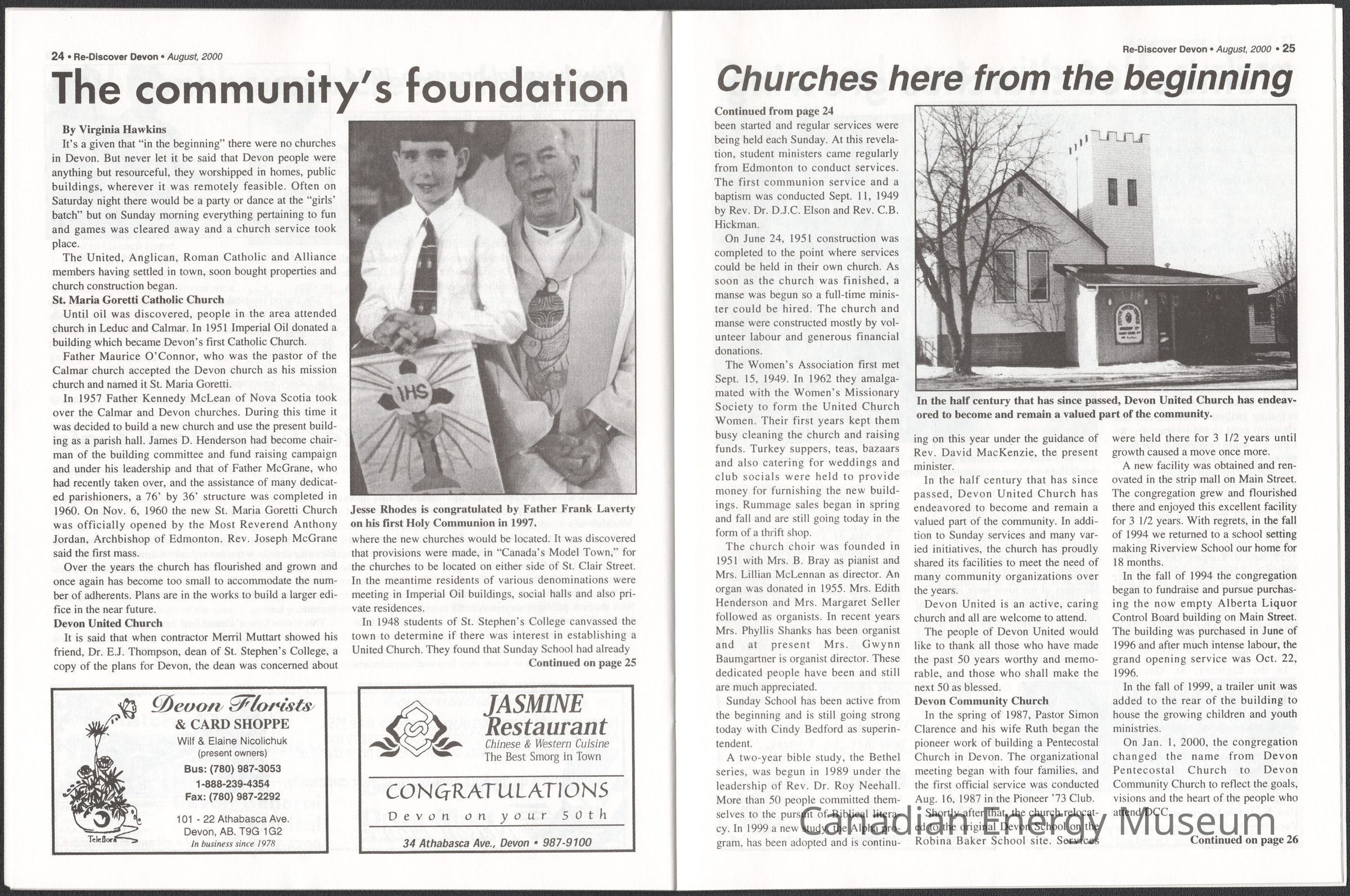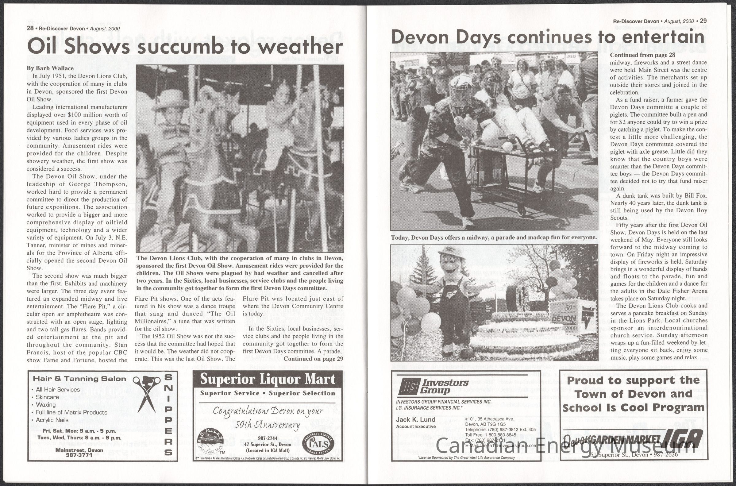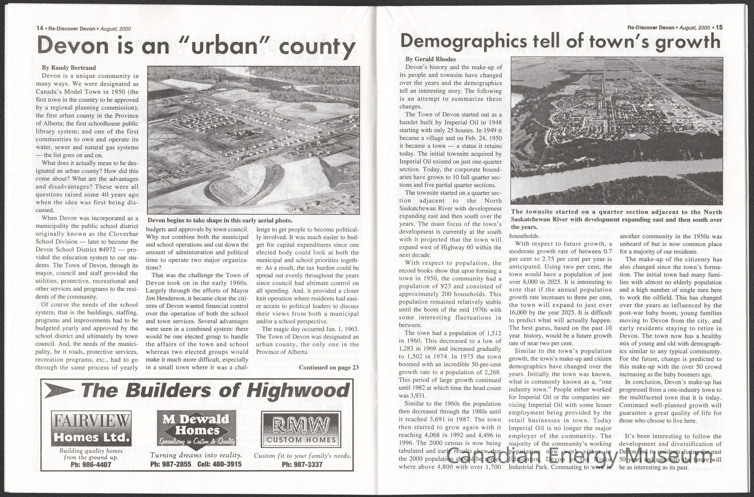 A large-format booklet produced by the Town of Devon for its 50th anniversary. The publication contains brief articles on the town's history and key events/developments.