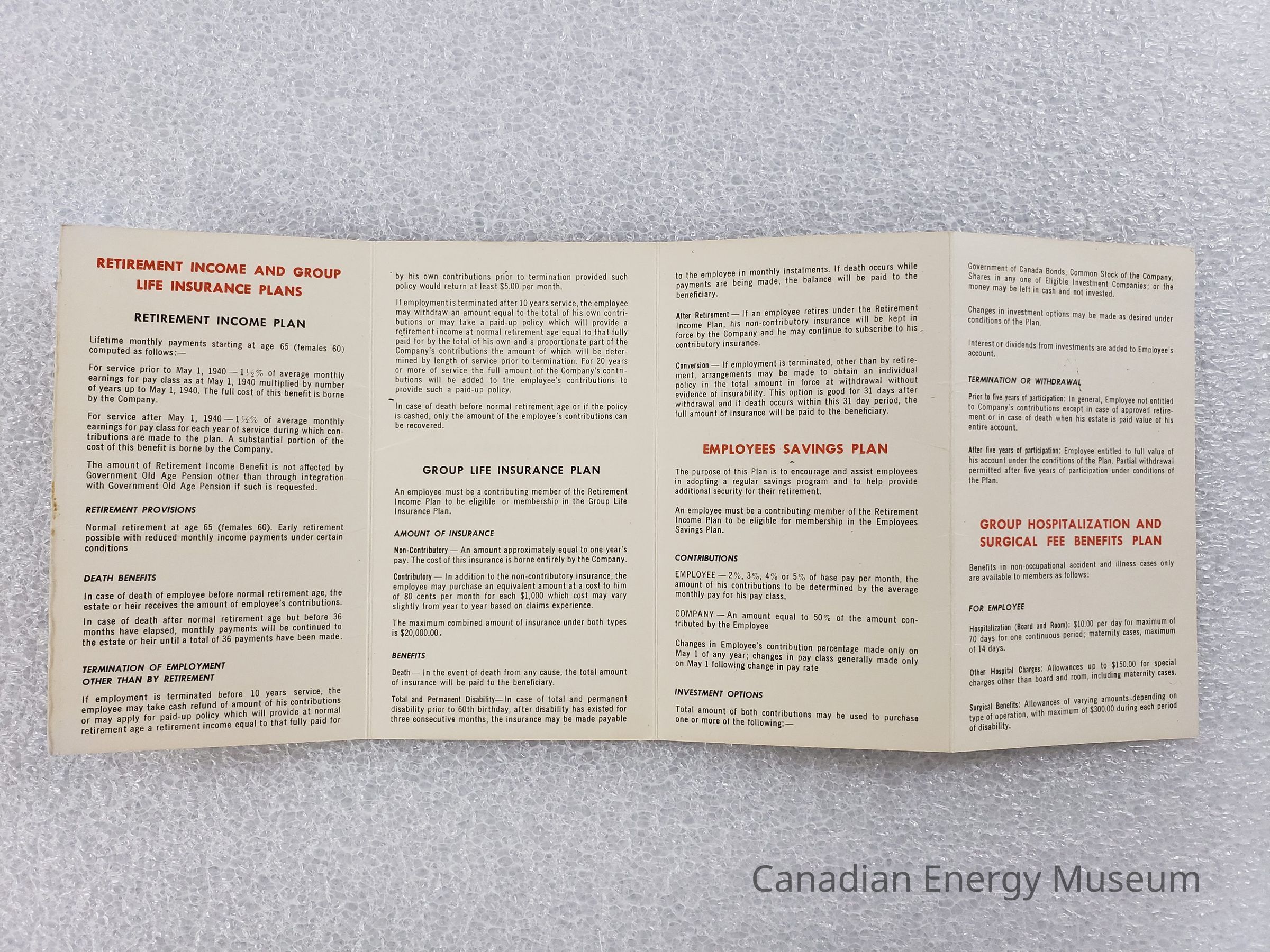 The content of the booklet covers retirement, life insurance, a savings plan, medical benefits, and accident and sickness benefit plan.Collection
