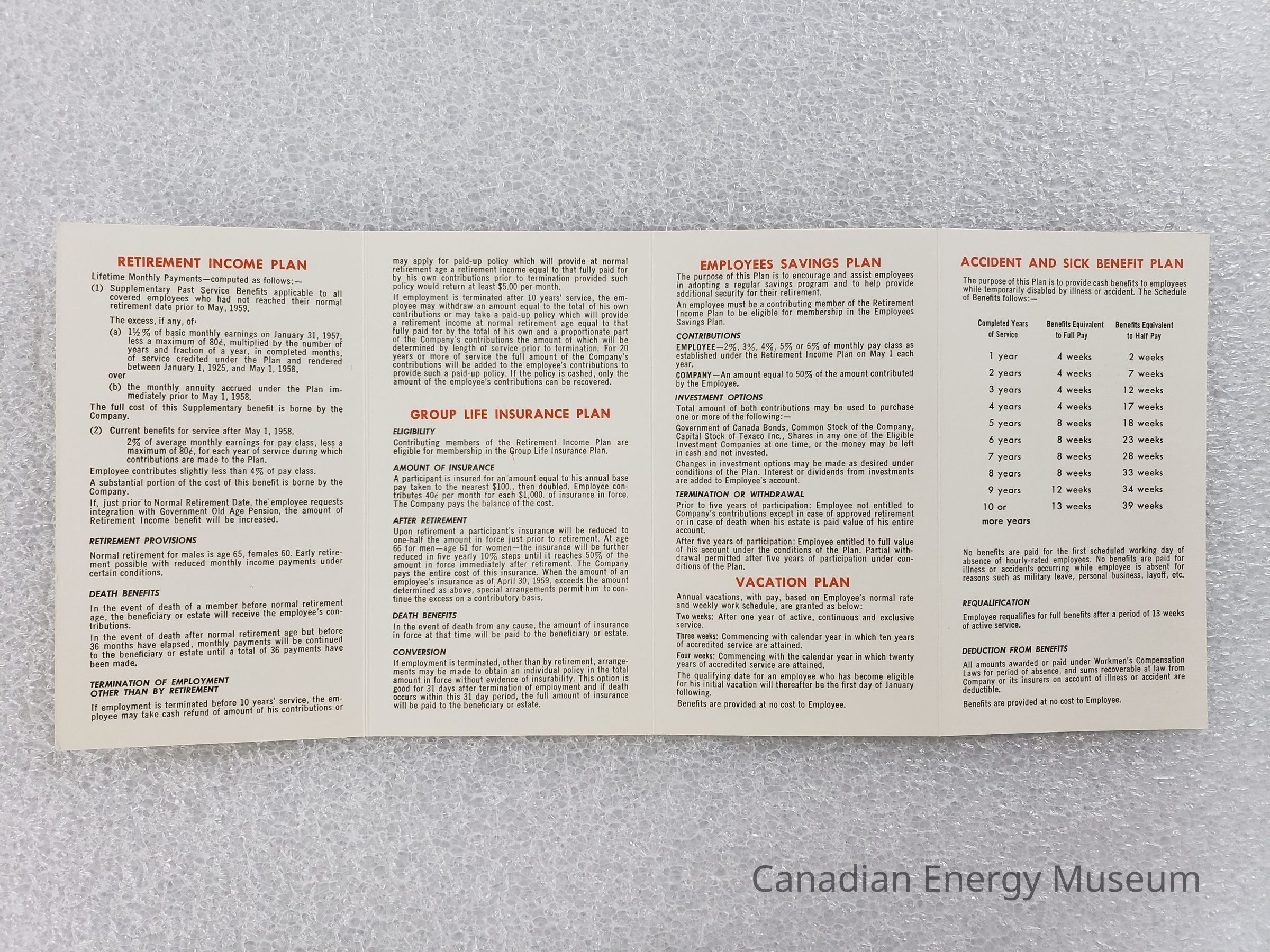 The content of the booklet covers retirement, life insurance, a savings plan, medical benefits, and accident and sickness benefit plan.Collection