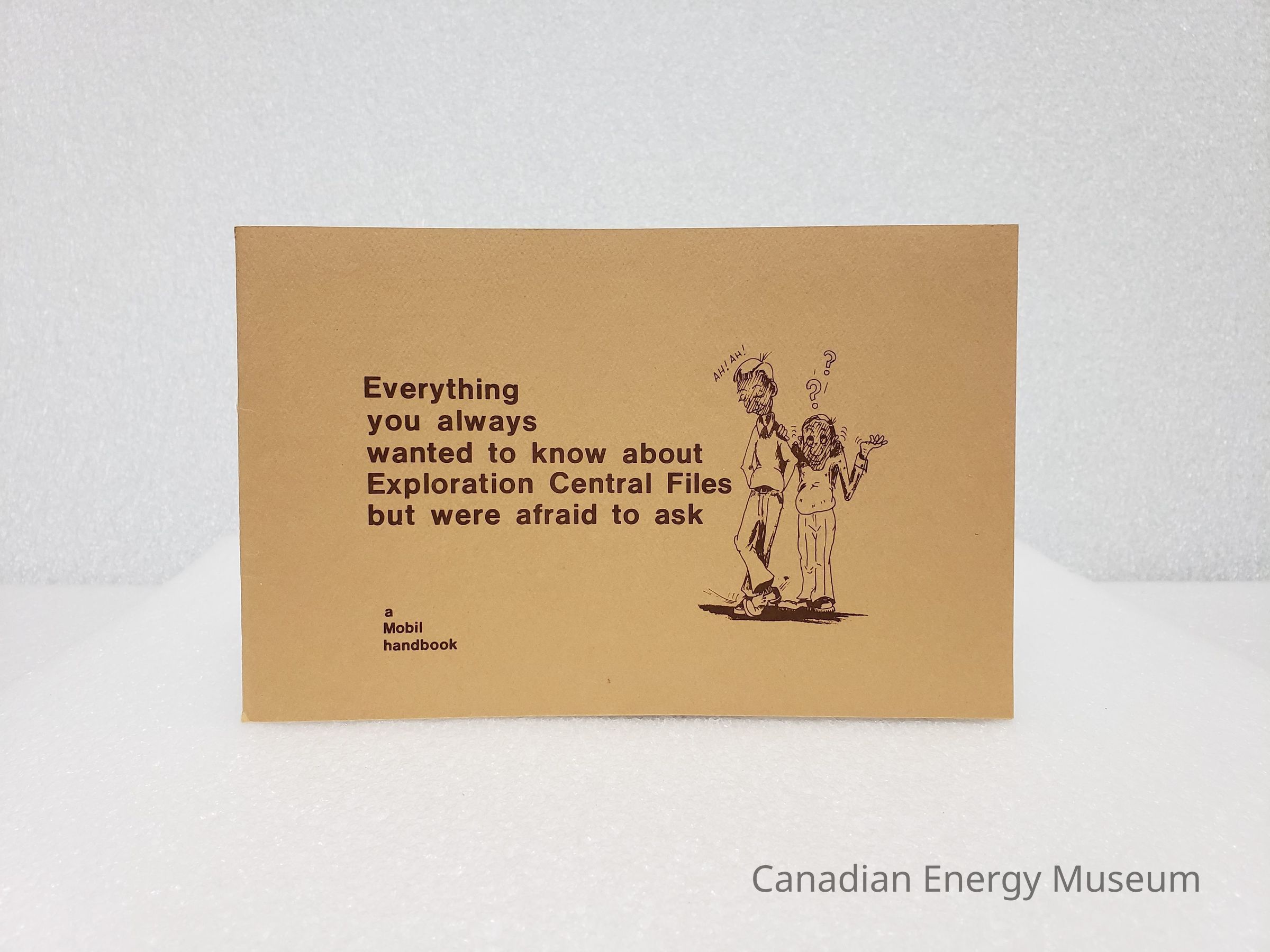 An elongated booklet addressing the use of Mobil's Exploration Central Files. Includes comical illustrations.
