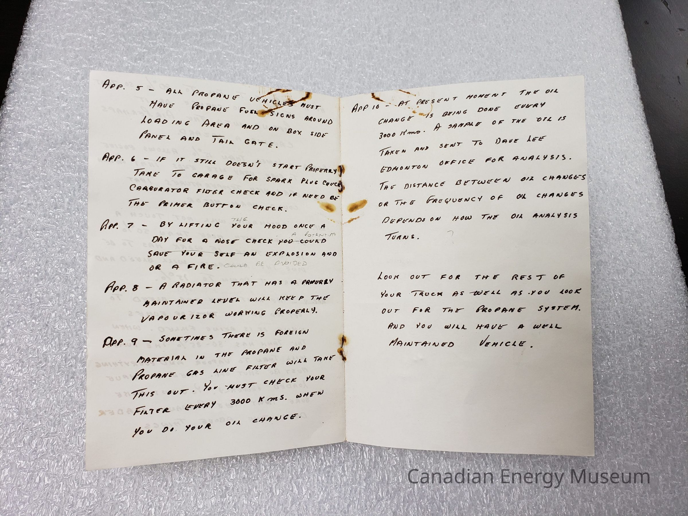 Features: Printer paper stock (with some printed material), stapled together roughly. Made of 3 folded sheets to make 6-pages. Front page bears a Texaco glossy sticker reading: "TEXACO; CAUTION; THIS VEHICLE SHALL NOT BE PARKED IN ANY PUBLIC UNDERGROUND OR ENCLOSED PARKING FACILITY; 1. Shut off tank and close valve while being serviced or under repair in a repair garage except when required for engine operation; 2. Do not park near source of heat or open flame; 3. Do not park near any source of ignition or an open pit or drain; 4. Do not fill to more than 85% of total capacity". The inside cover has a photocopied and enlarged version of the sticker on the cover. The remaining pages are filled with handwritten notes on working with propane vehicles.Collection