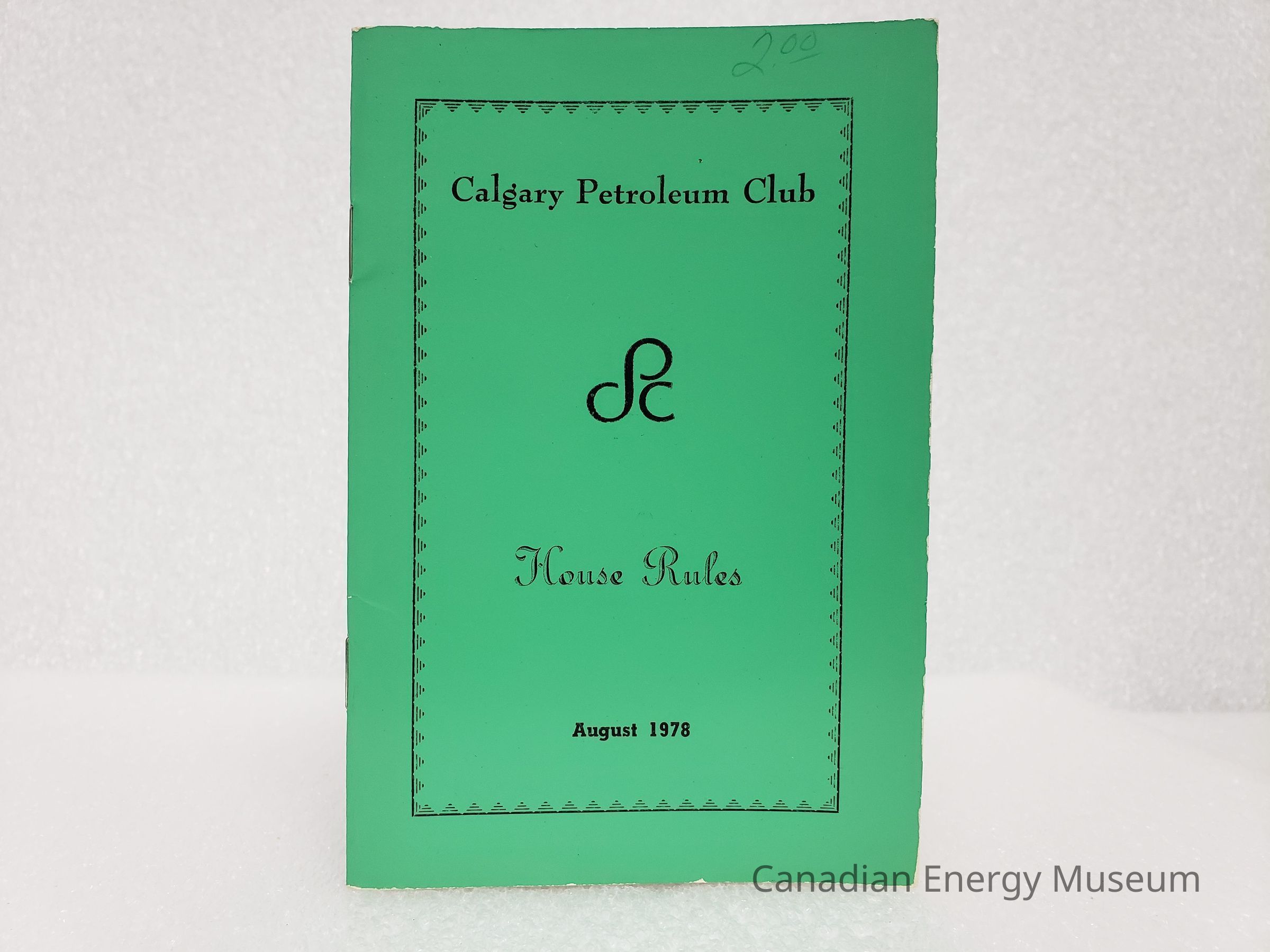 A small booklet produced by Calgary Petroleum Club. The cover had a simple triangular patterned border, with the text "Calgary Petroleum Club House Rules; August 1978".