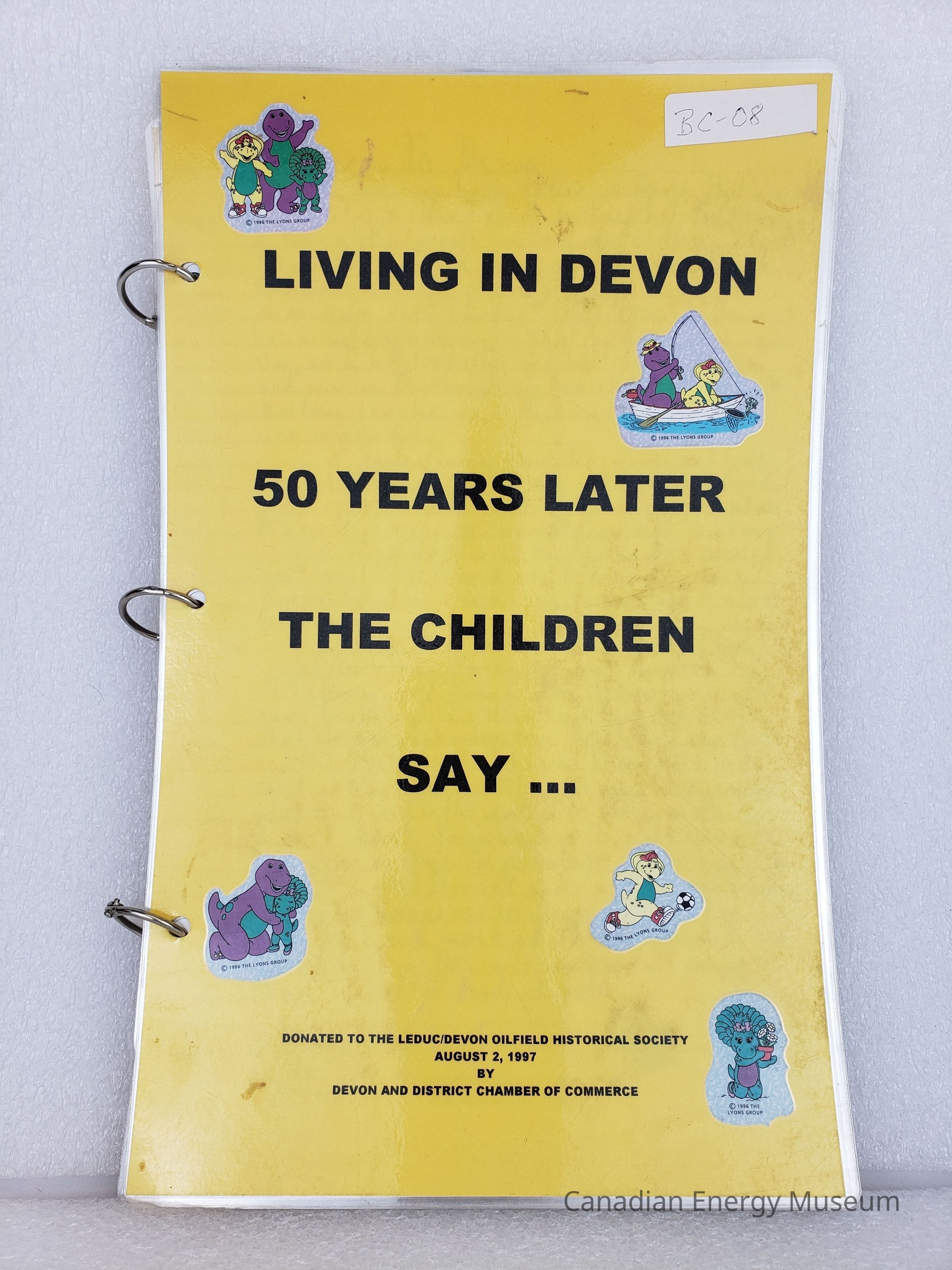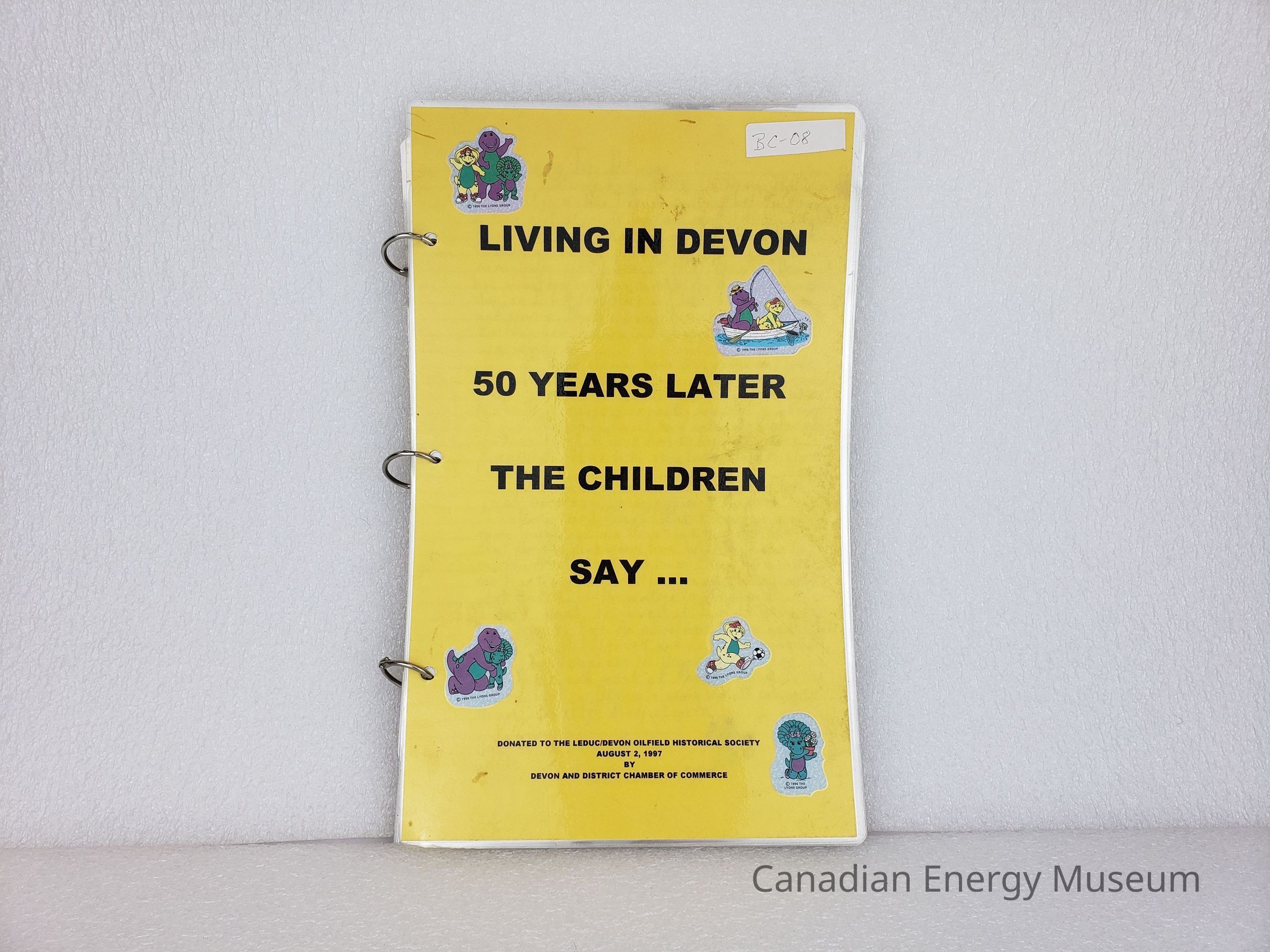 A booklet of laminated copies of children's writings and drawing (copies, not originals), bound with three loose spring rings. Pages vary is size from legal to letter sized. Front cover is a sheet of yellow paper (laminated) with the title text "LIVING IN DEVON; 50 YEARS LATER THE CHILDREN SAY ...", beneath which is also printed "DONATED TO THE LEDUC/DEVON OILFIELD HISTORICAL SOCIETY; AUGUST 2, 1997; BY DEVON AND DISTRICT CHAMBER OF COMMERCE". Stickers have been adhered throughout the cover and internal pages as decorations.