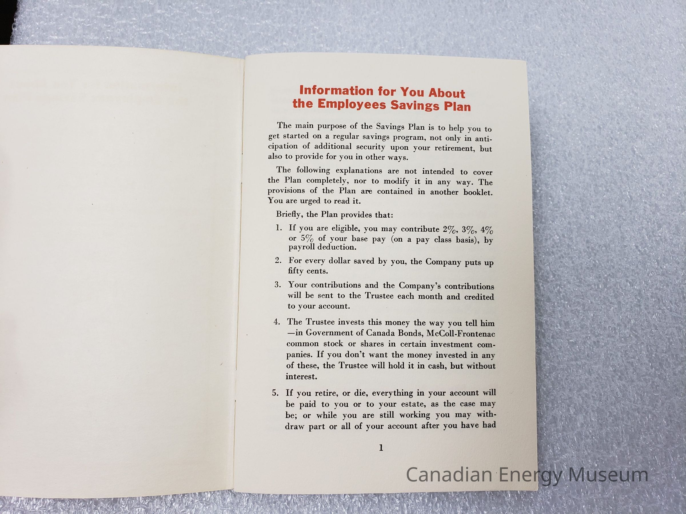 Informational booklet on the Savings Plan for McColl-Frontenac employees, dates to c.1950s.