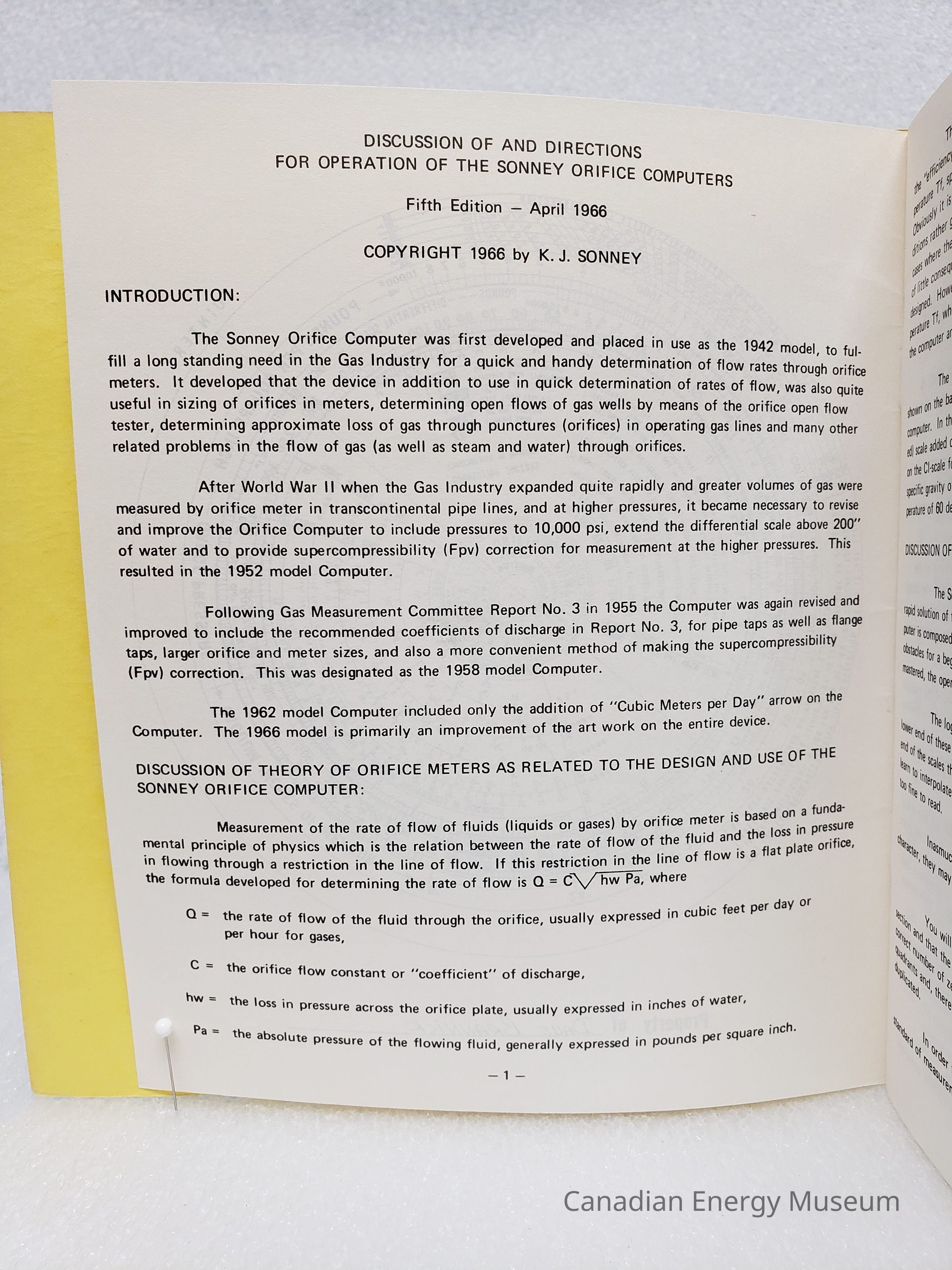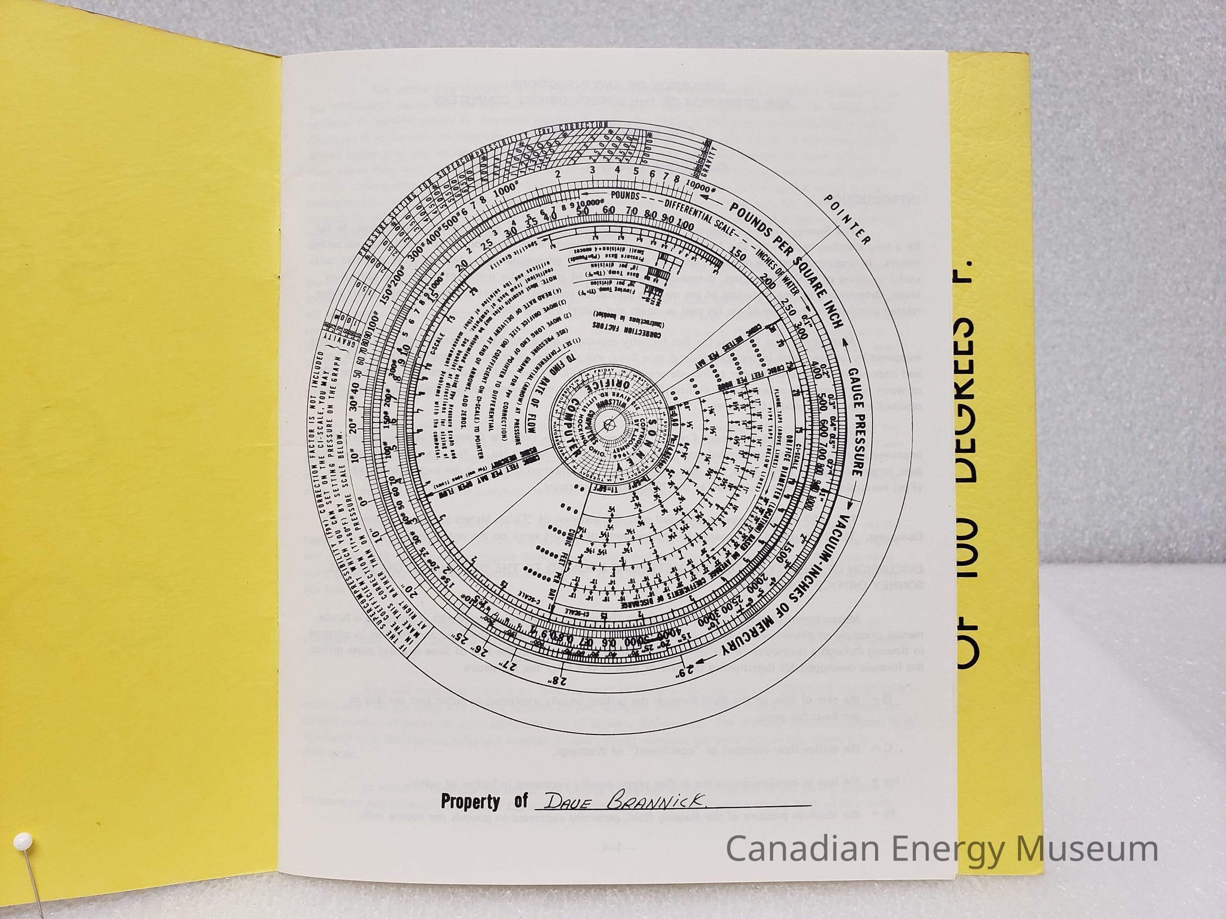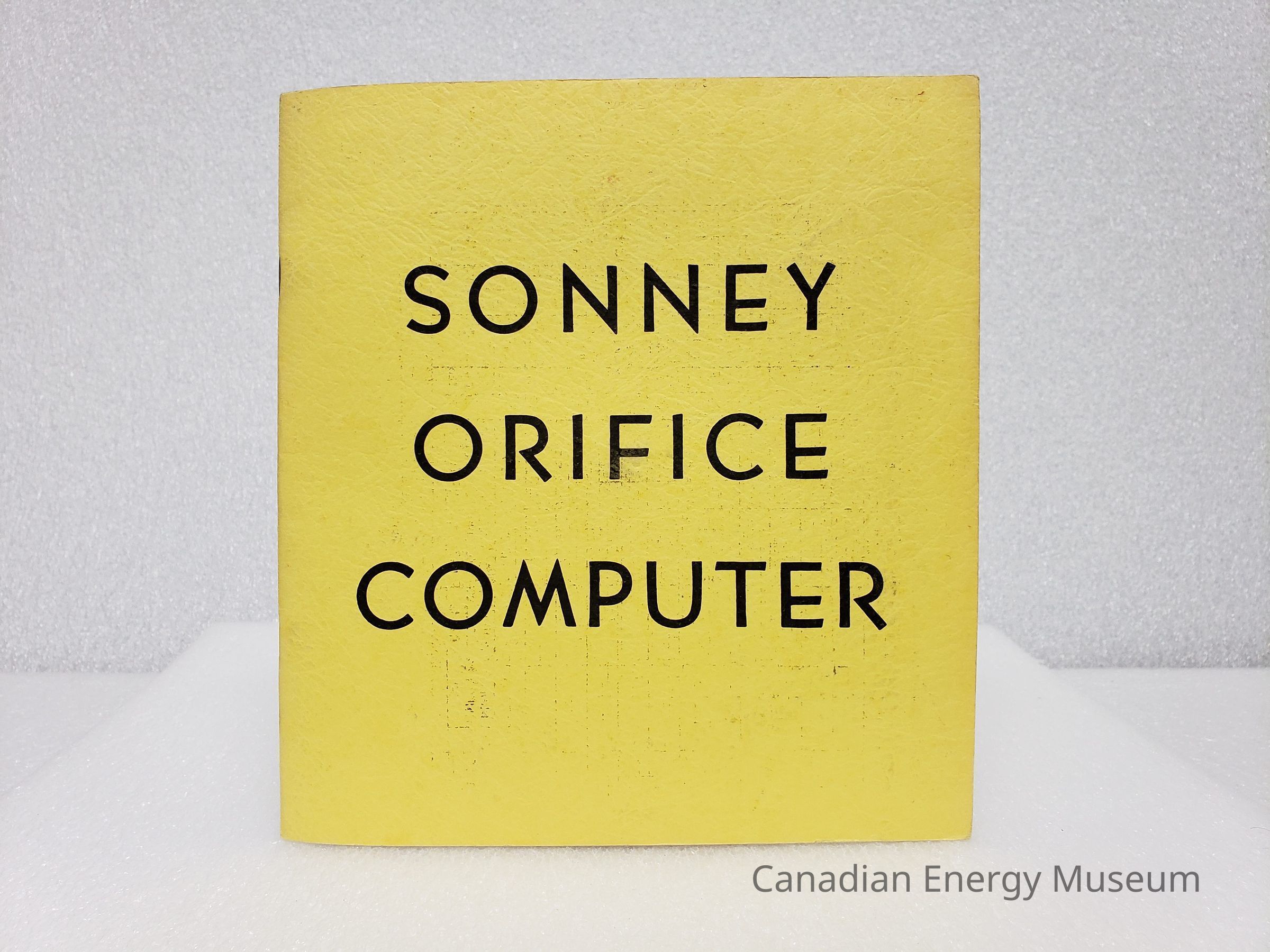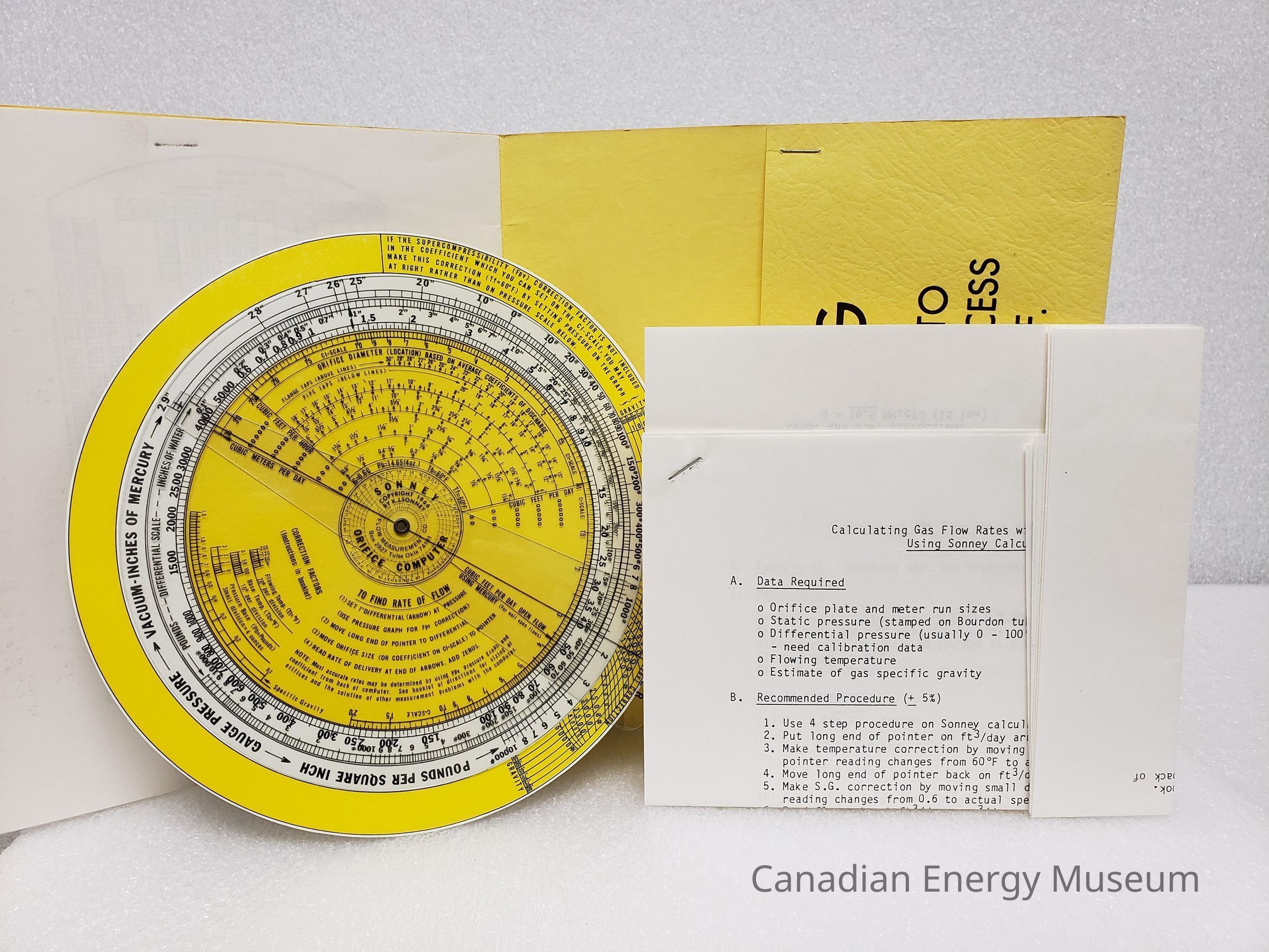 A square booklet outline the operation of the Sonney Orifice Computers. Includes a plastic analog calculator and 3-page stapled printout stored in a staples pocket at the back of the booklet.