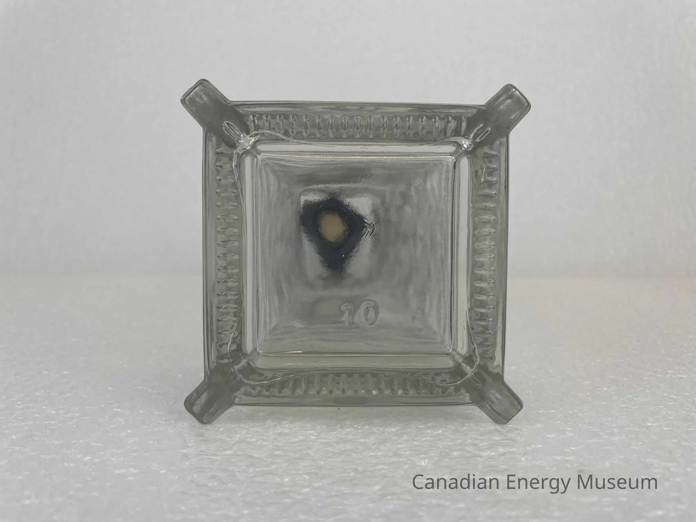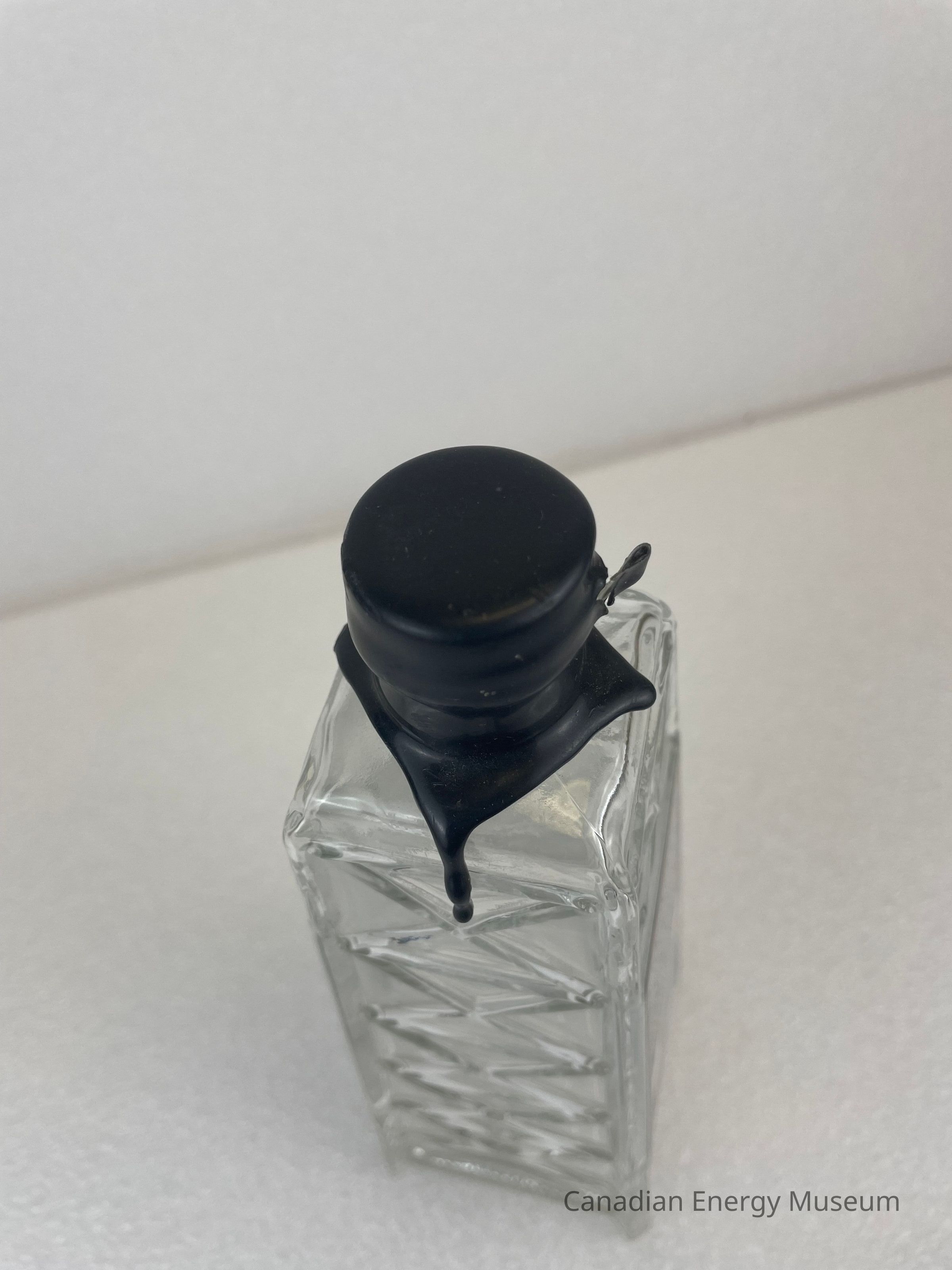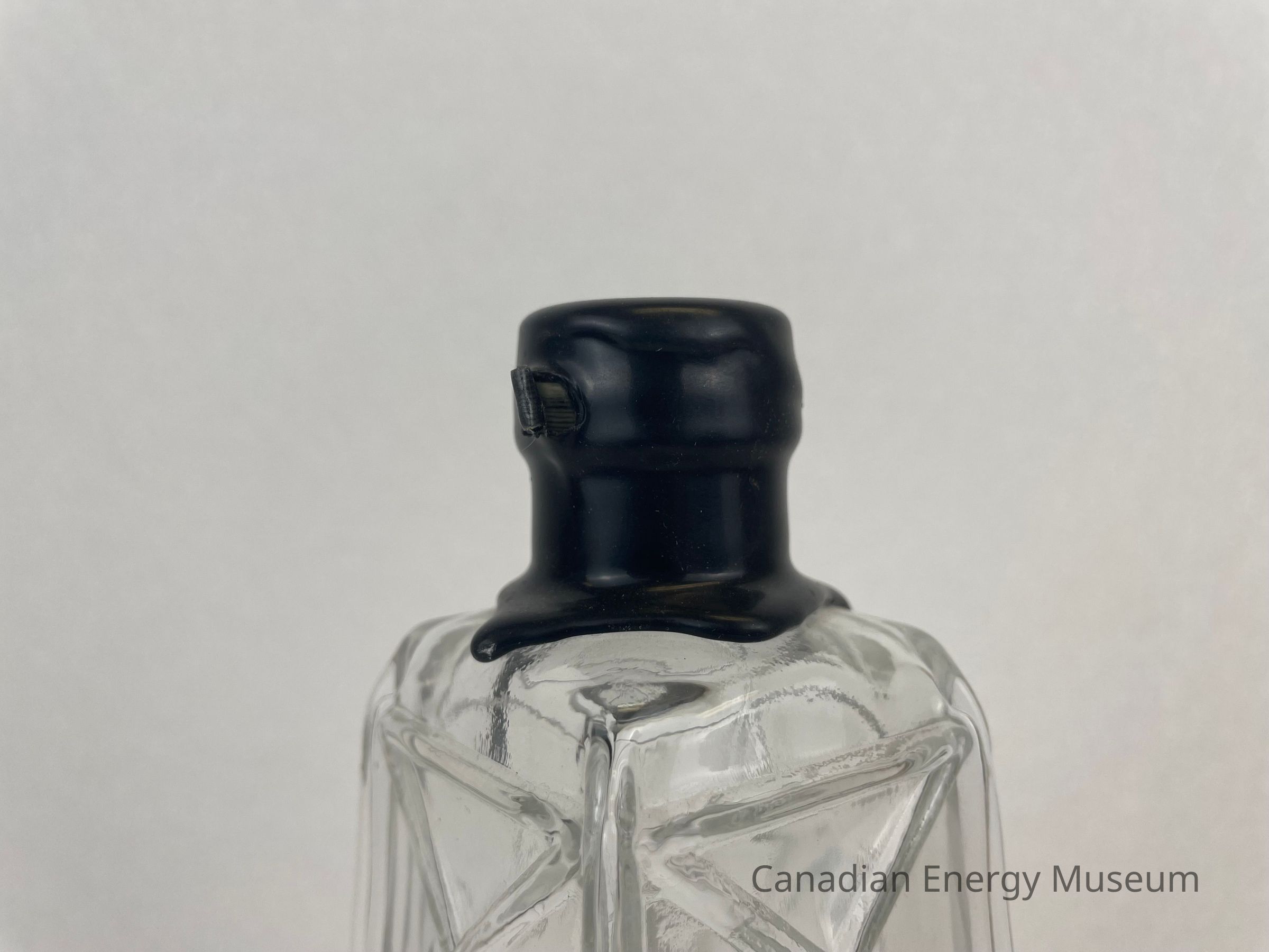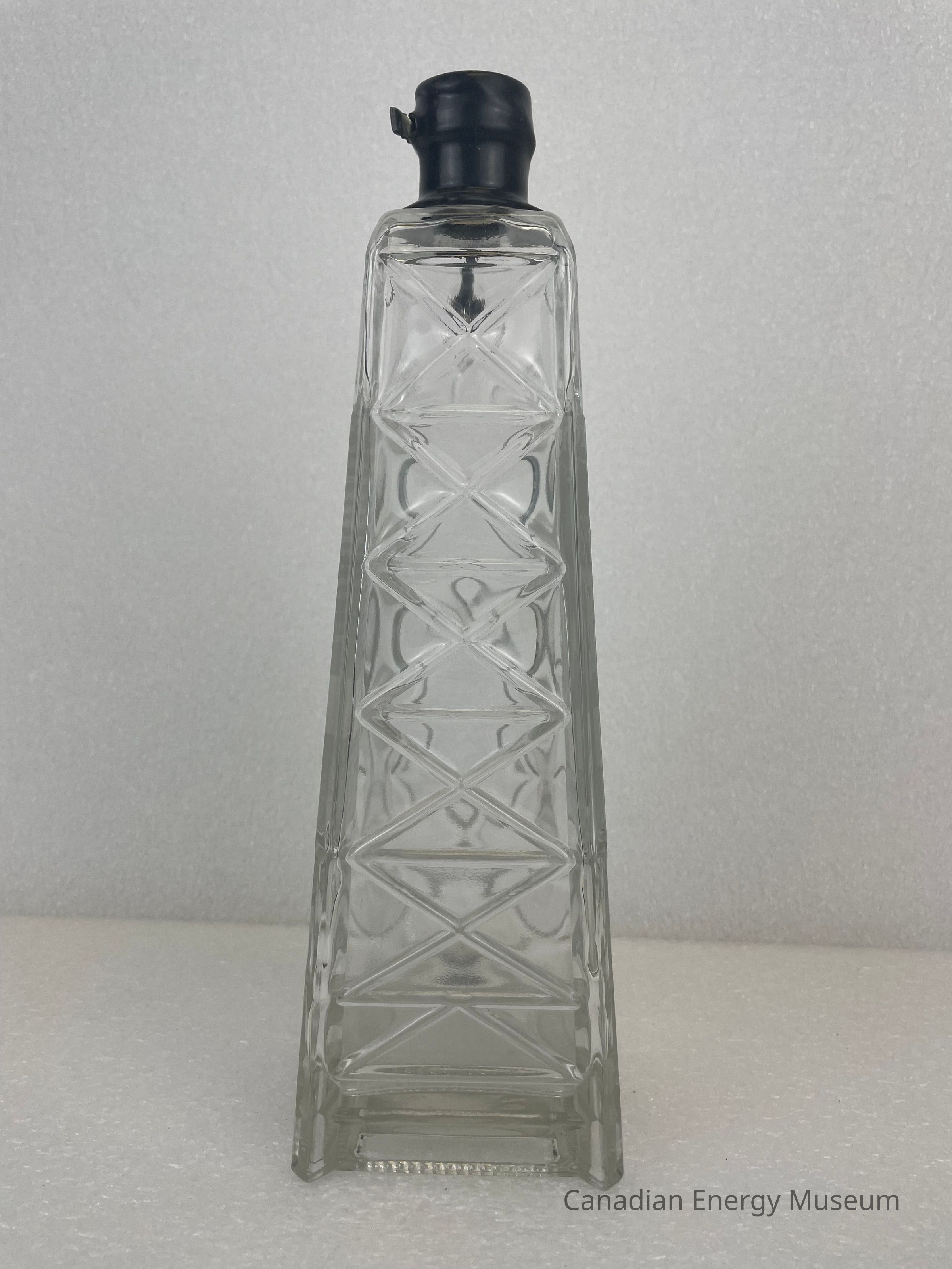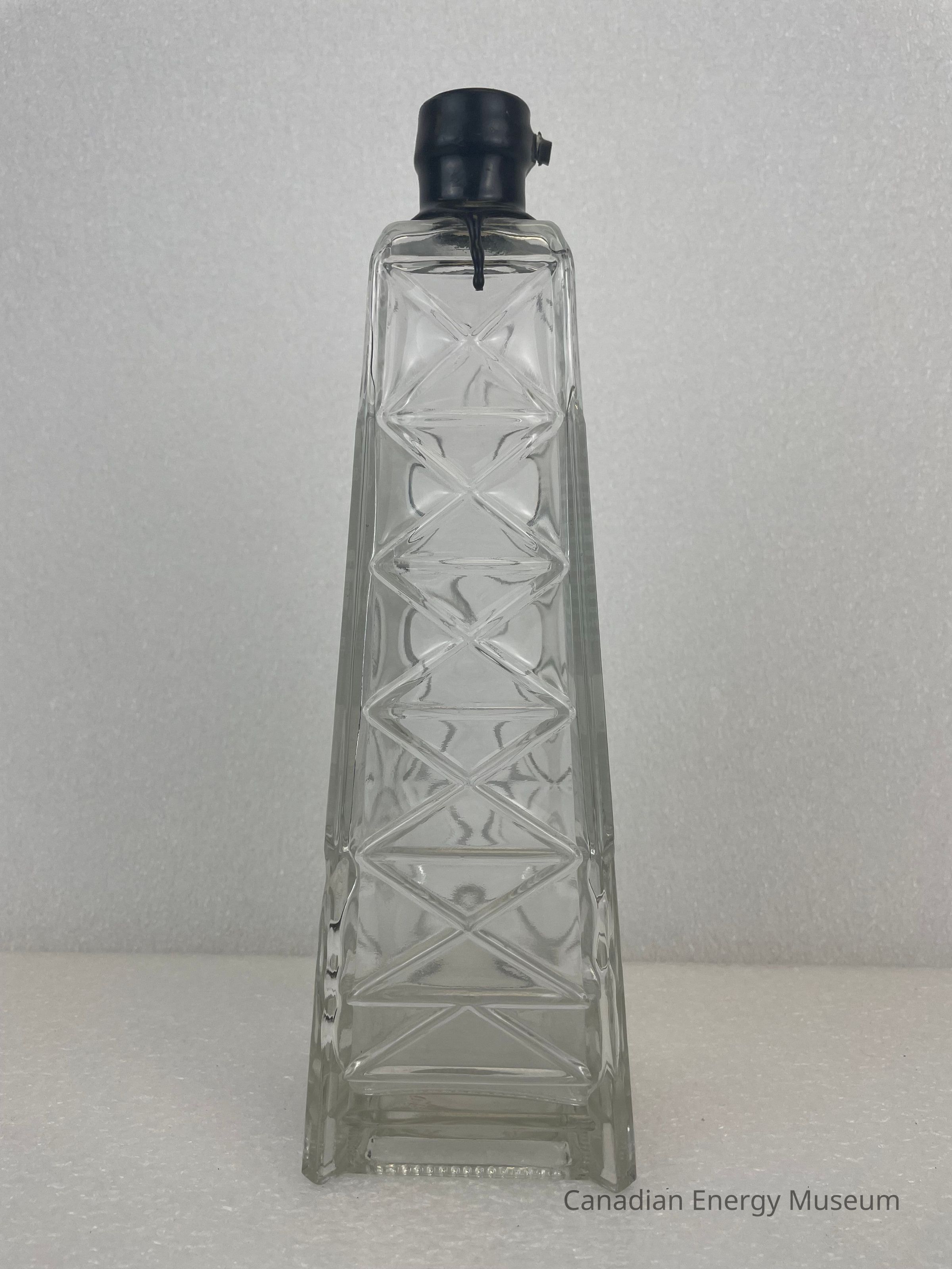 A clear glass vodka bottle in the shape of an oil derrick, made by Big Rig Craft Distillery.