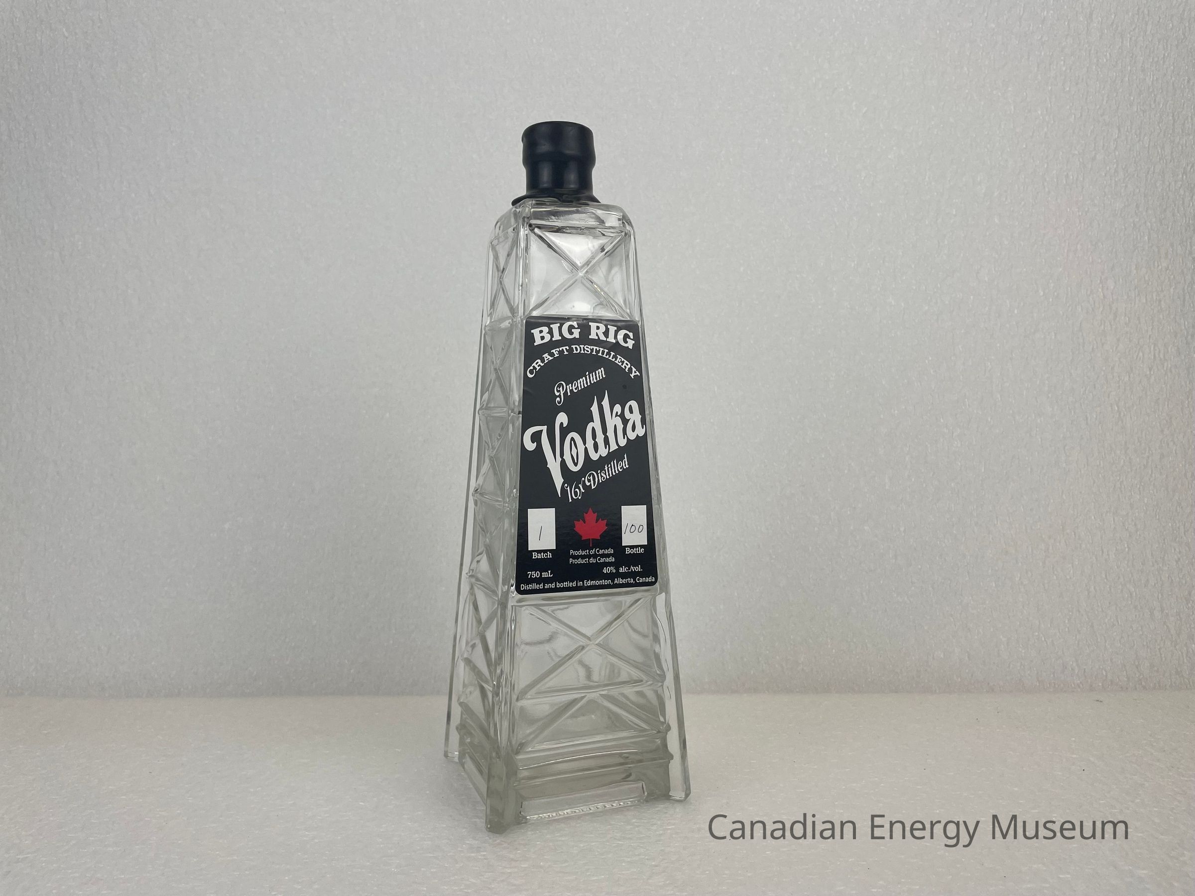The bottle is large with a square base that narrows at the top. Lines along the surface of the glass create a pattern similar to that of an oil derrick. The top of the bottle is sealed with a black wax material. The front of the bottle displays a large rectangular label with a black background and white text. From top to bottom, the text reads, "BIG RIG CRAFT DISTILLERY Premium Vodka 16x Distilled". Below the text is a red maple leaf in between two white rectangles. The left rectangle displays a handwritten "1", and the right displays "100". The bottom of the label states that it is 750 mL and that it was distilled and bottled in Edmonton.