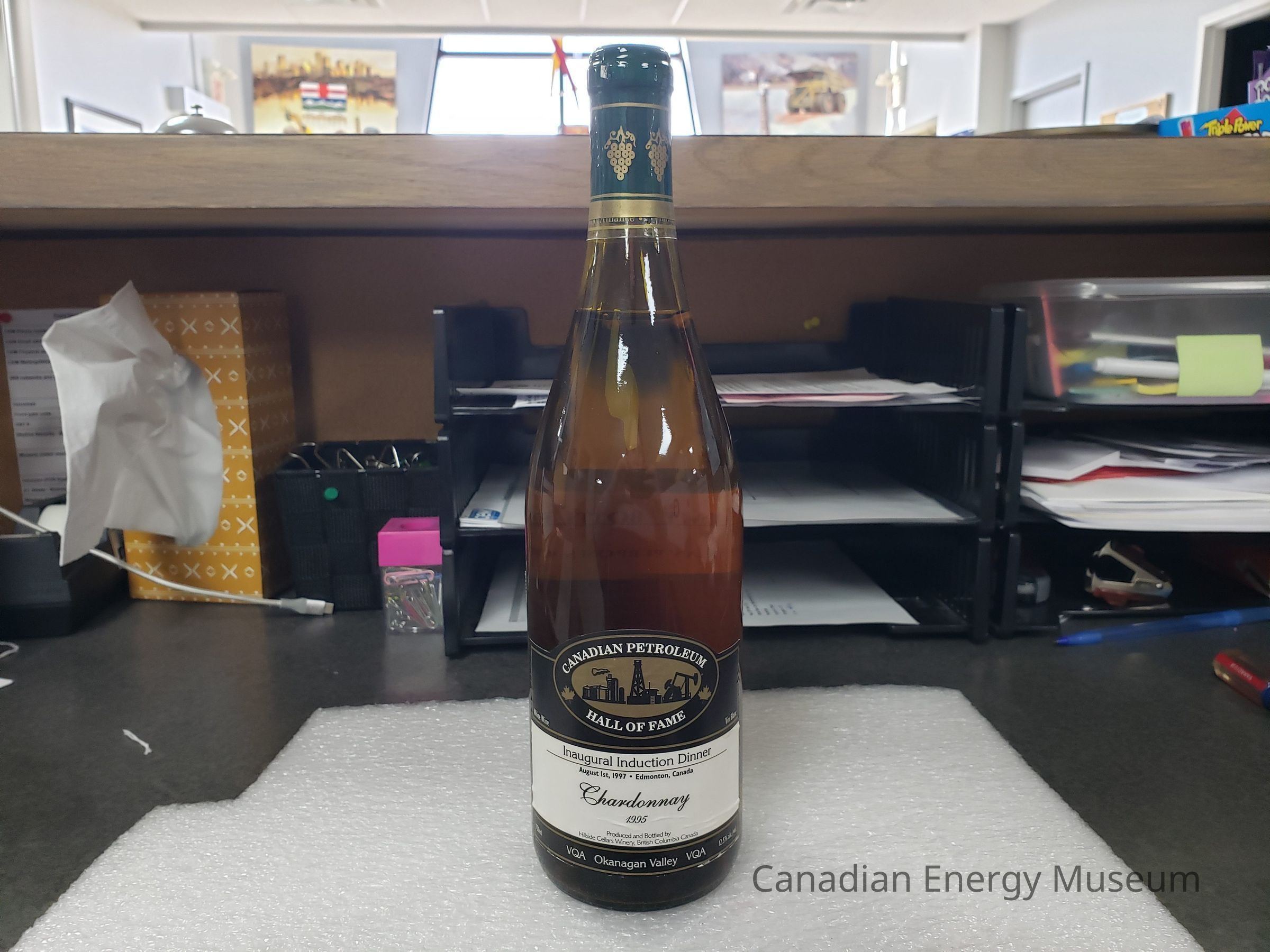 A commemorative bottle of chardonnay from the Canadian Petroleum Hall of Fame inaugural induction dinner, 1 August 1997.Collection
