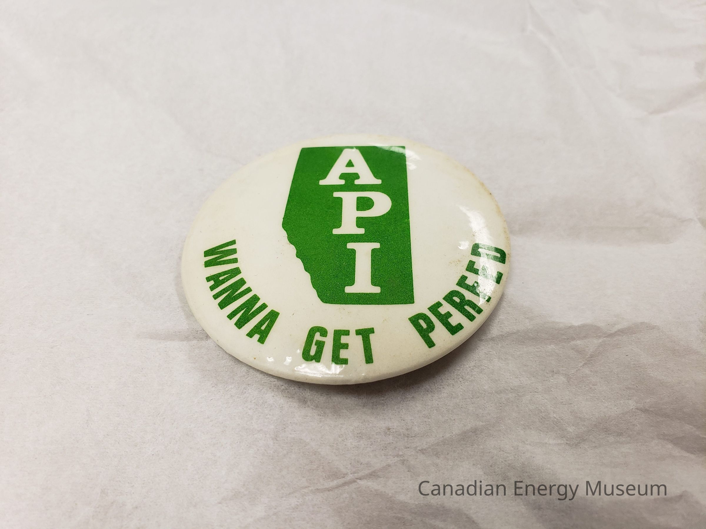 A pinback button, branded to API (initials inside green Alberta map silhouette), reading "WANNA GET PERFED". Green on white print.Collection