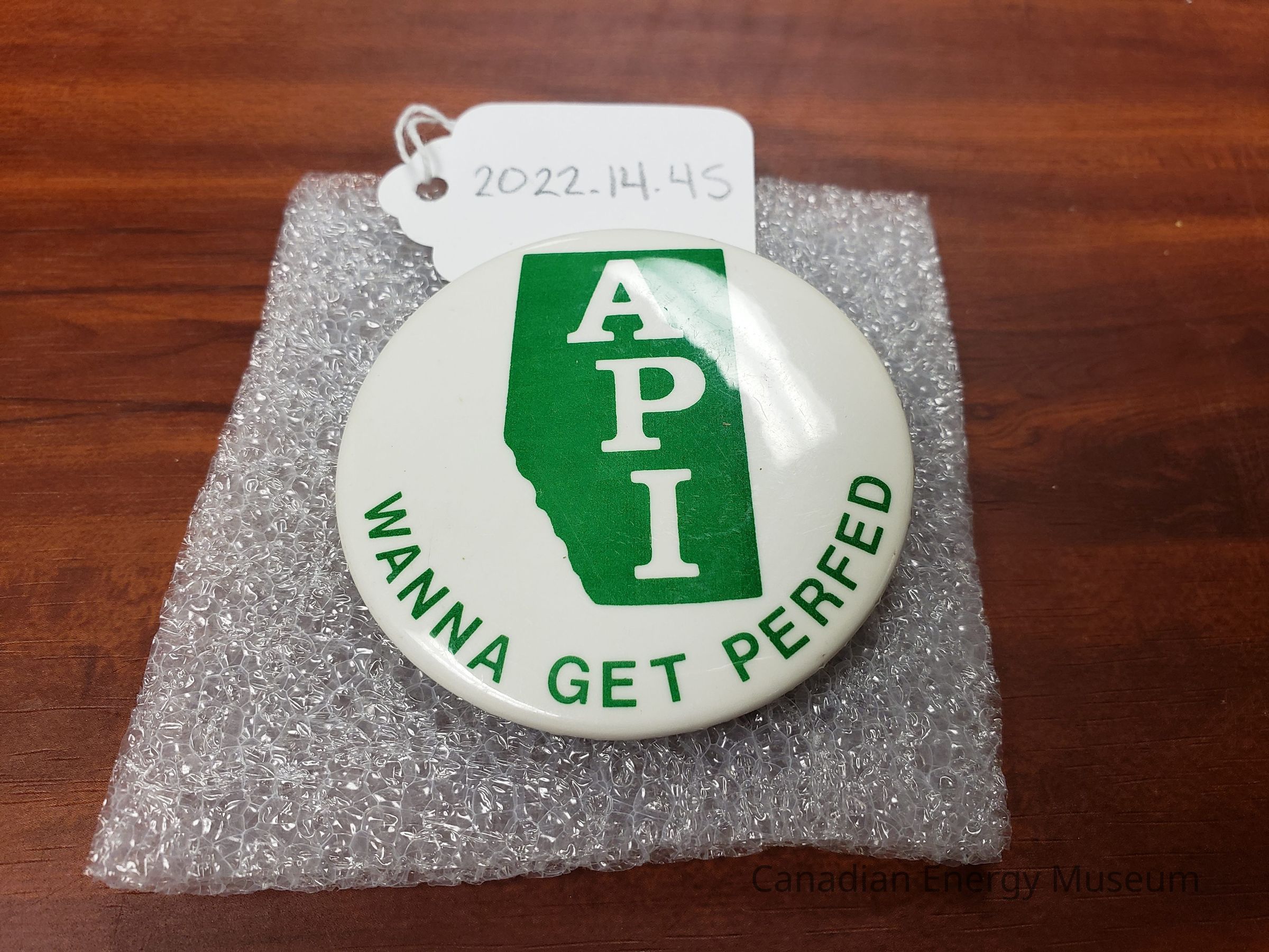 A pinback button, branded to API, with the initials inside a green silhouette on Alberta. Along the bottom reads "WANNA GET PERFED". Green print on white.Collection