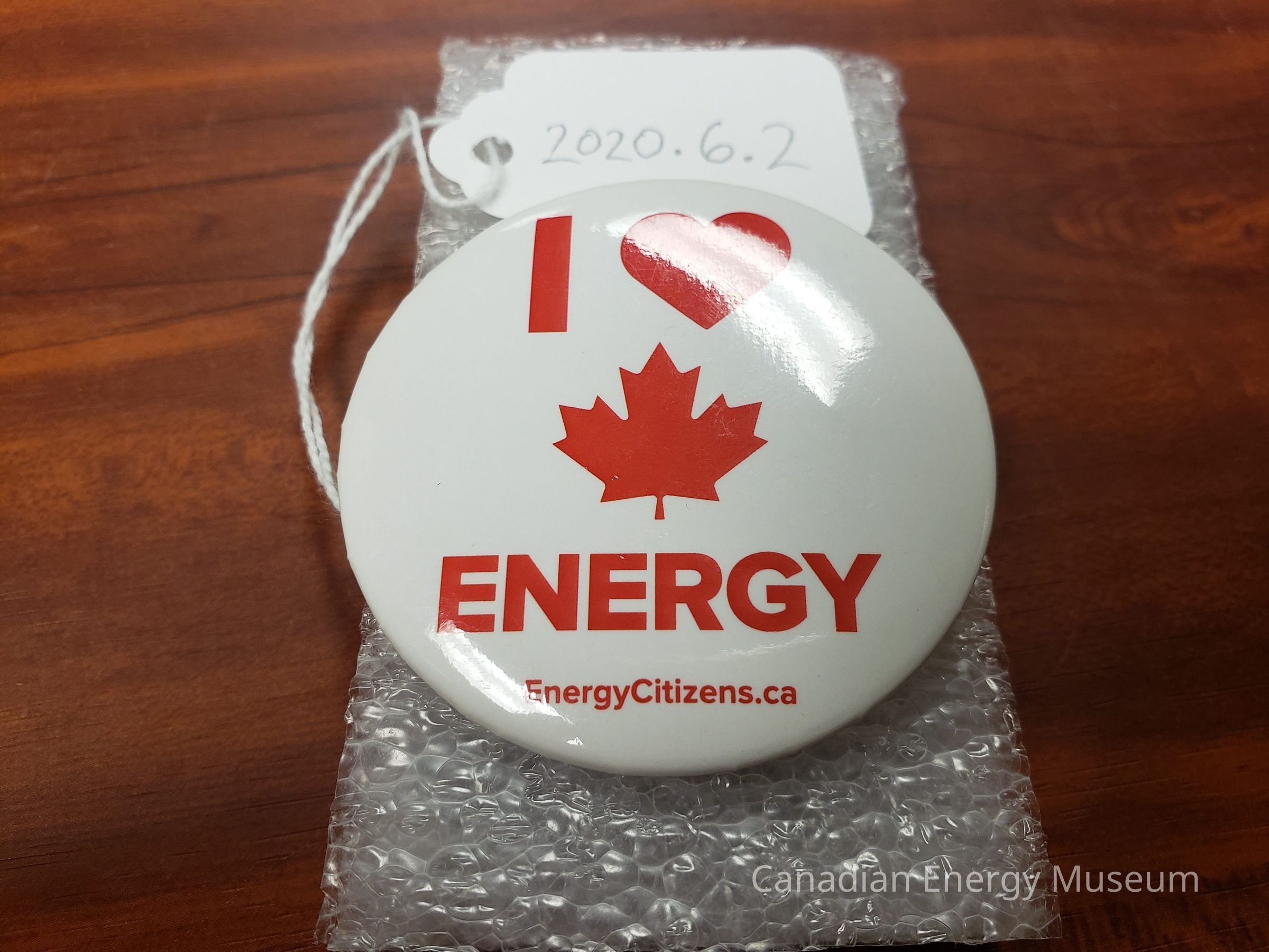 A pinback button, reading "I <3 [LEAF] ENERGY; EnergyCitizens.ca". Red print on white.Collection