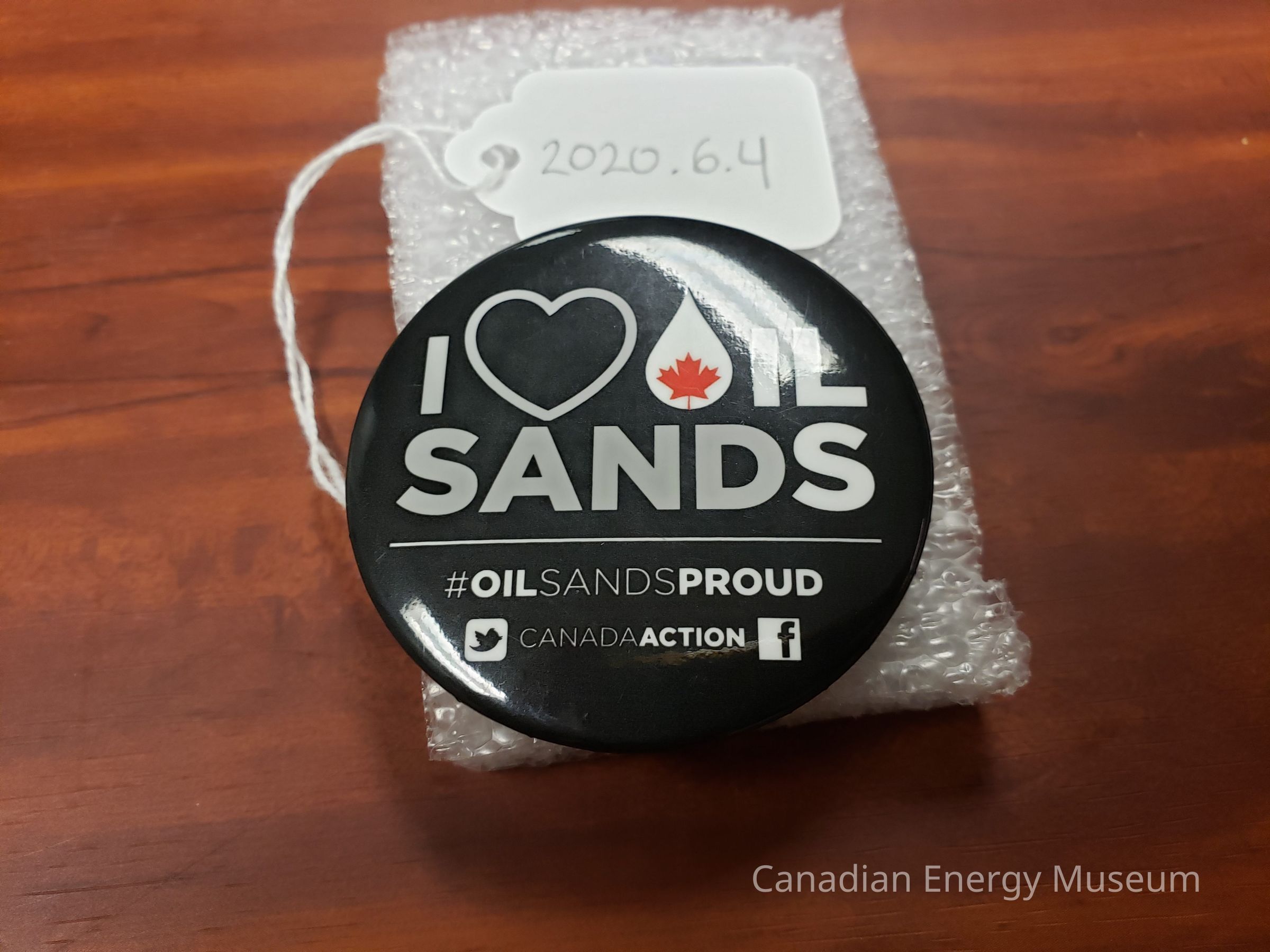 Pinbakc button reading "I <3 OIL SANDS ("O" is a drop shape with leaf inside); #OILSANDSPROUD; CANADAACTION." With icons for Twitter (left) and Facebook (right). White and red print on black.Collection