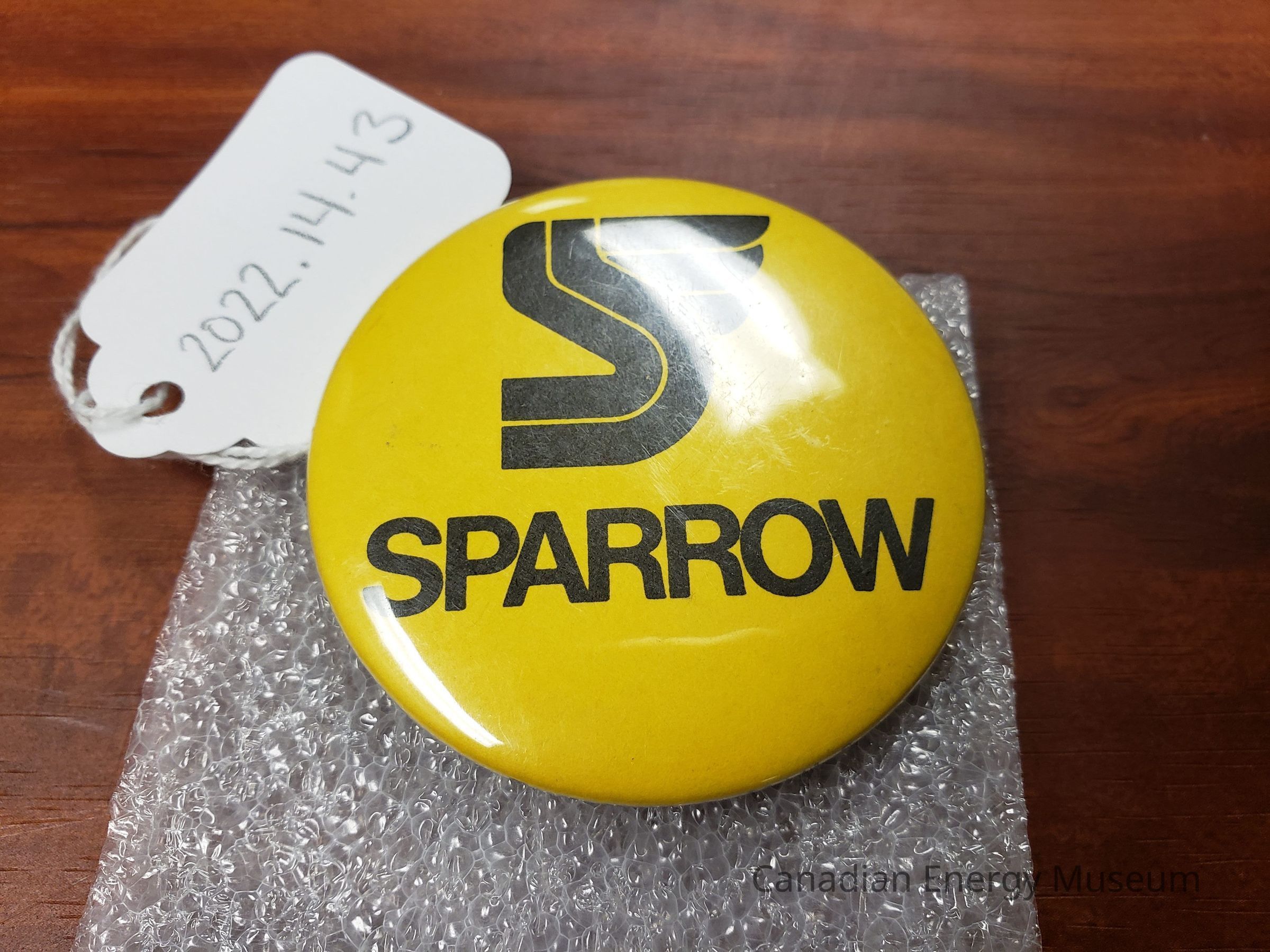 A pinback button branded to Sparrow with a stylised wing-shaped "S" logo. Black print on yellow.Collection