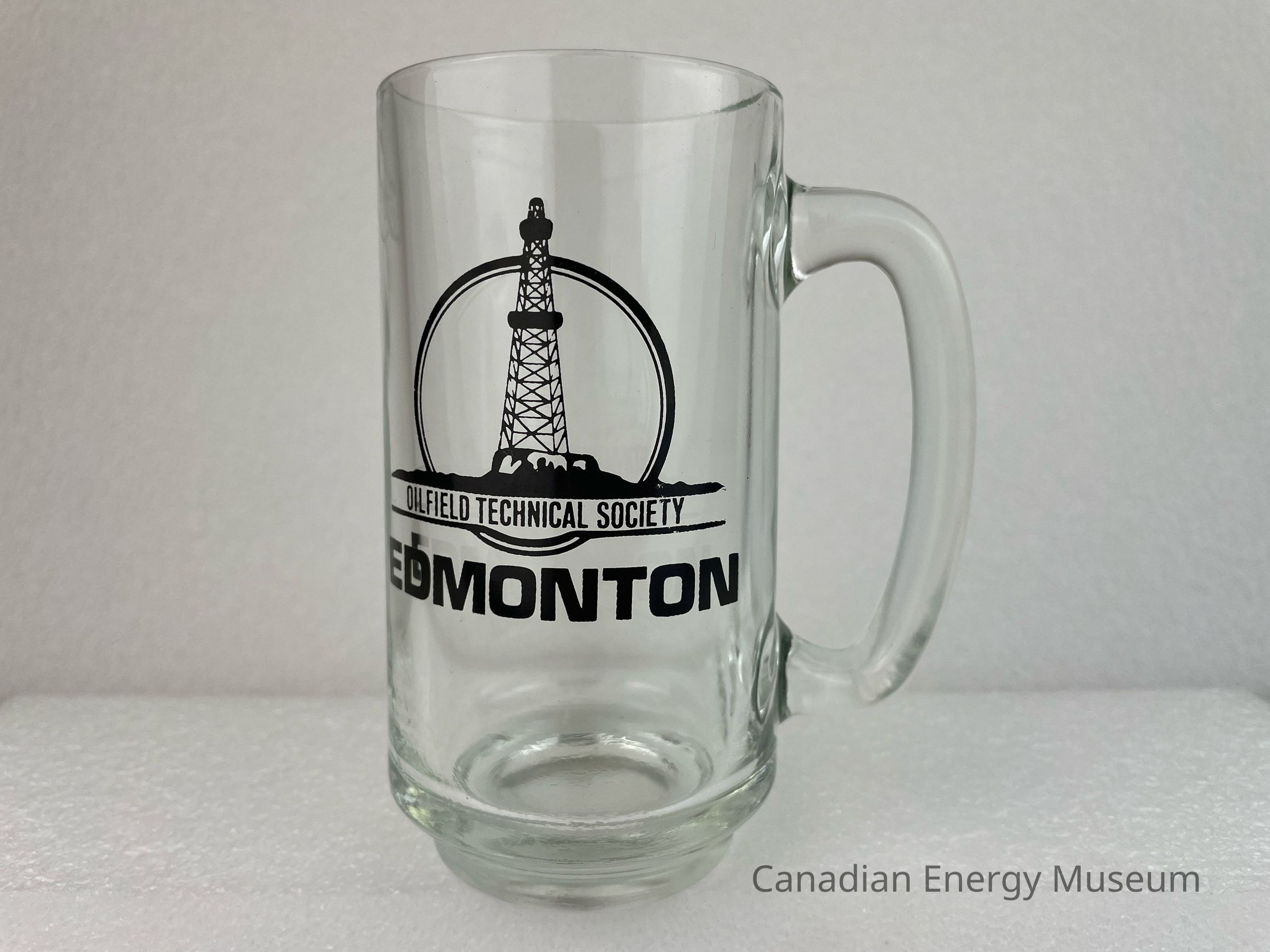 A clear glass tankard with a handle branded to the Oilfield Technical Society. The tankard features a black logo of a circle with another circle inside and an oil derrick at the centre. The oil derrick sits on a line of earth with text underneath reading, "OILFIELD TECHNICAL SOCIETY" and is encase by another black line. Below the circle is large, bold text reading, "EDMONTON". The body of the glass rests on a smaller base.Collection