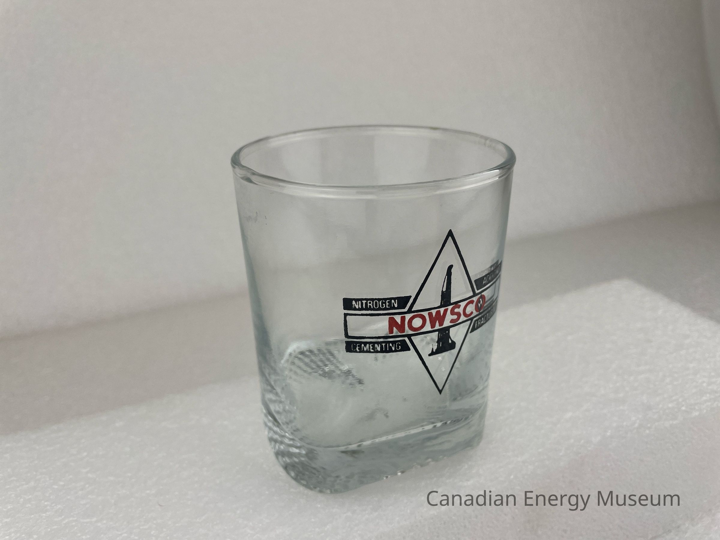 A footed, clear Whiskey glass branded to Nowsco. The printed design features a black outlined diamond with a black illustration of a drill rig in the centre. A black outlined rectangle runs through the centre of the diamond horizontally with red text, "NOWSCO". Four small, black rectangles surround the centred rectangle with text reading from top to bottom and left to right, "NITROGEN", "ACIDIZING", "CEMENTING", "FRACTURING".Collection