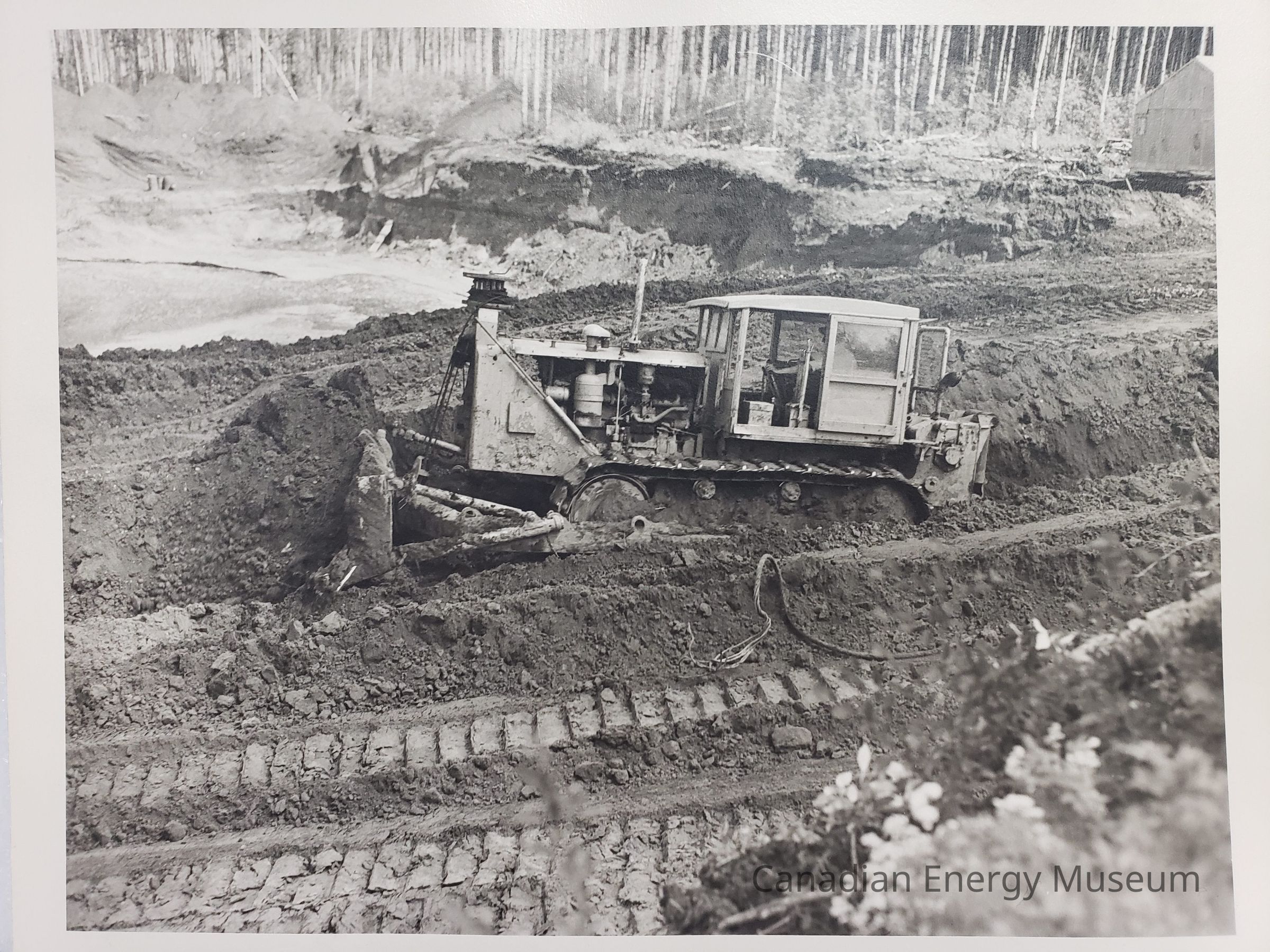 A large, black and white photographic print of the side-view of a bulldozer moving dirt. The bulldozer takes up the majority of the midground, with the trees and a sunken area of earth in the background. On the reverse is a stamp for Smith Photographers ("Phone 212, Devon, Alta.").Collection