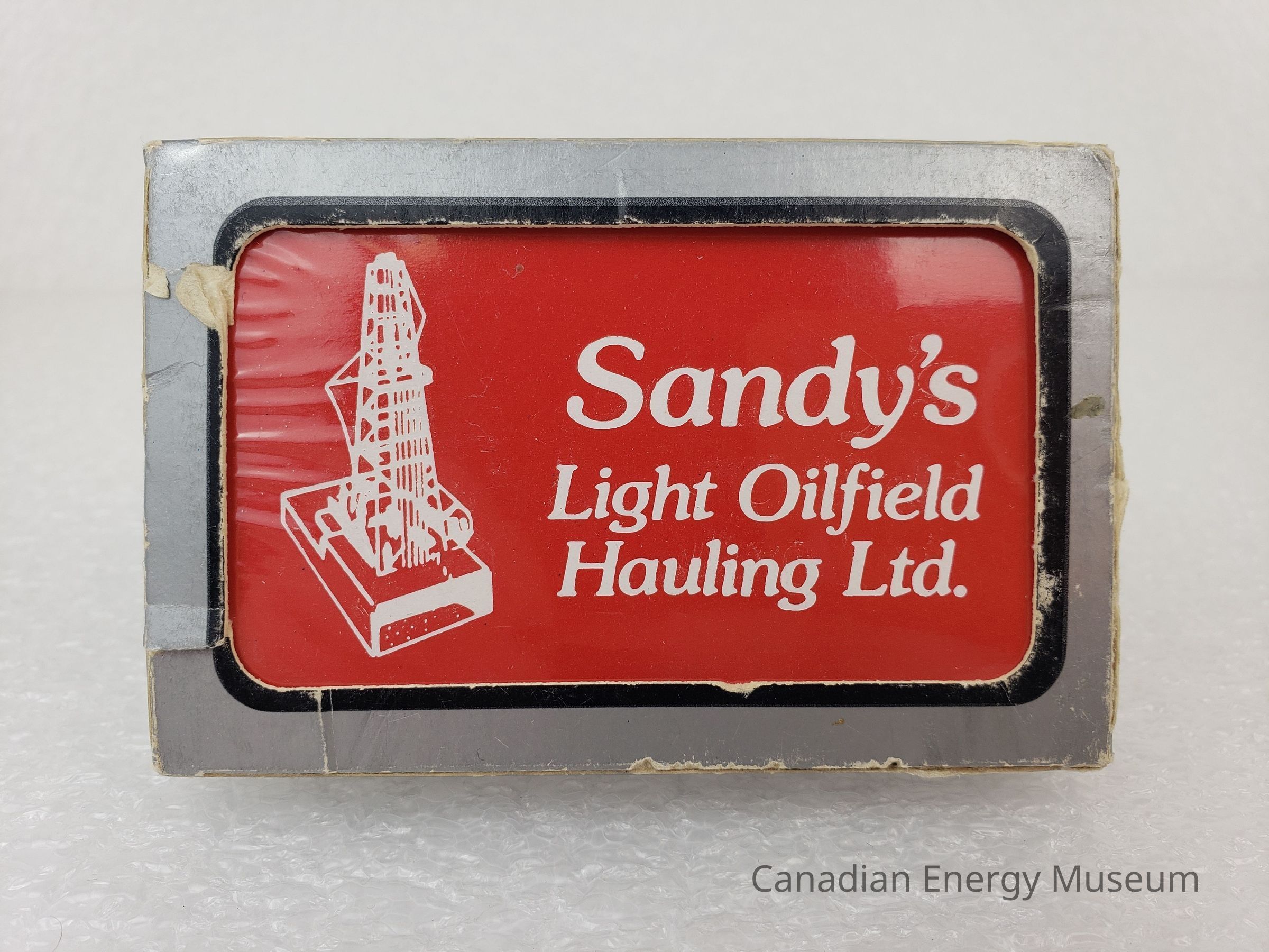 Playing Cards: The back design of the cards is a red base with white text "Sandy's Light Oilfield Hauling Ltd." and illustration of an oil derrick.