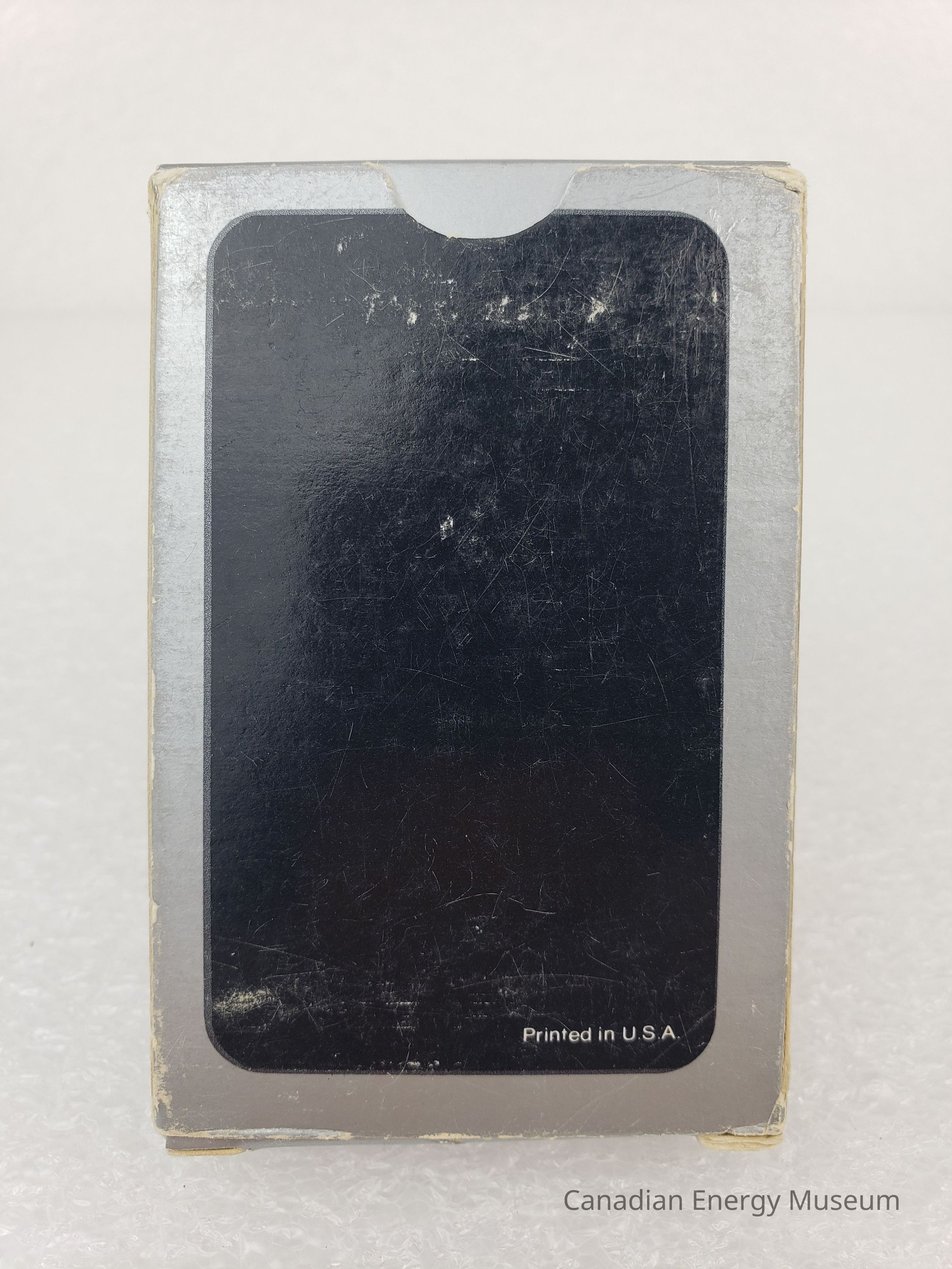 Box: A cardboard box, with a rounded rectangular cut-out window on the front. The box is a metallic-silver with black print. On the sides and top-/bottom-flaps are stylized card suits in black print. The back has a large, black rectangle with rounded corners, and the small white text "Printed in U.S.A.".