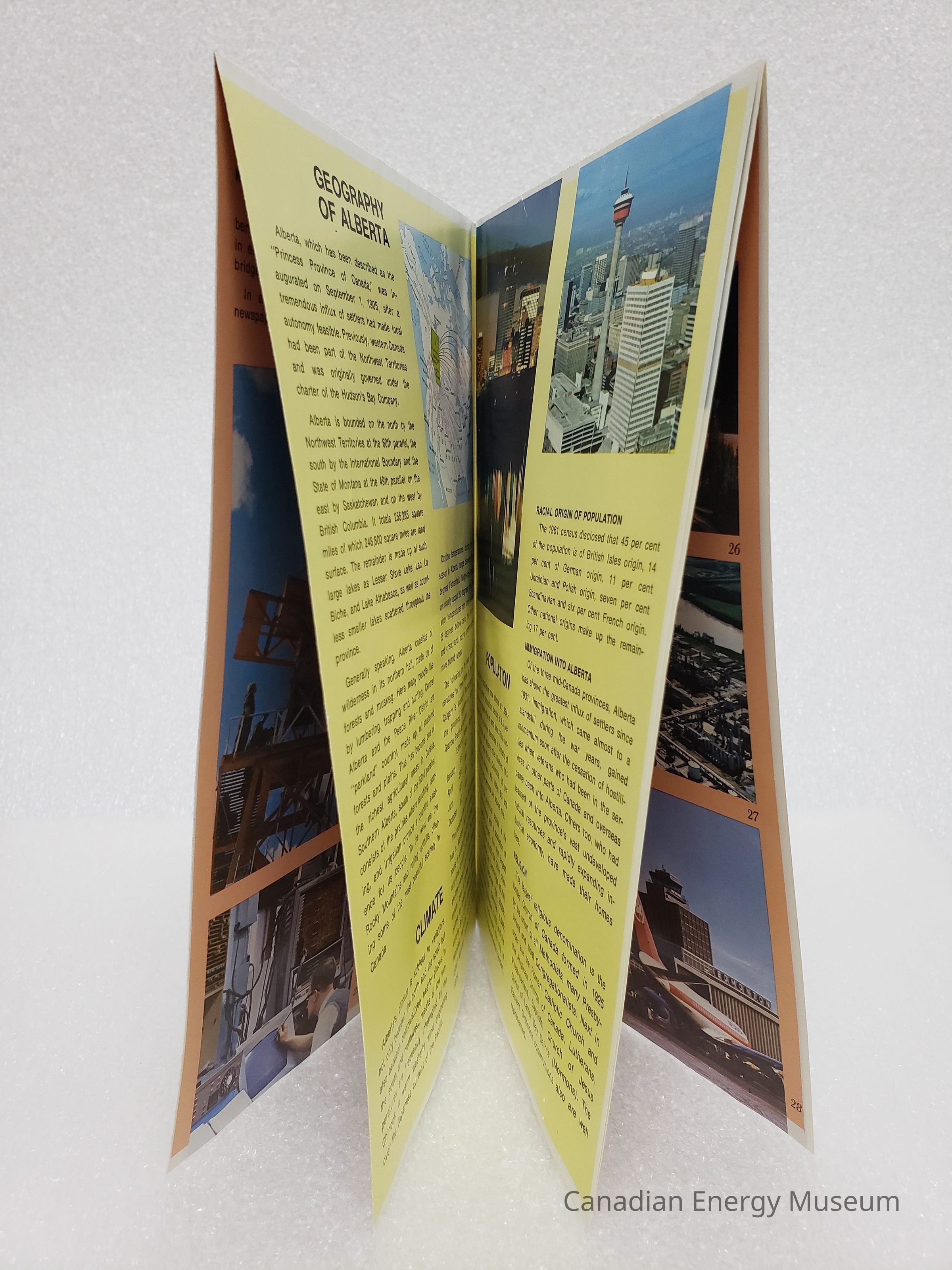 Description: An 8-panel informational pamphlet about Alberta made for visitors and new residents to the province, produced by The Alberta Government Travel Bureau. Pamphlet contains full-colour photographs related to the province and information on geography, climate, population, governance, communication services, education, health and social development, travel, economy, various energy resources, manufacturing, agriculture, and forestry.
