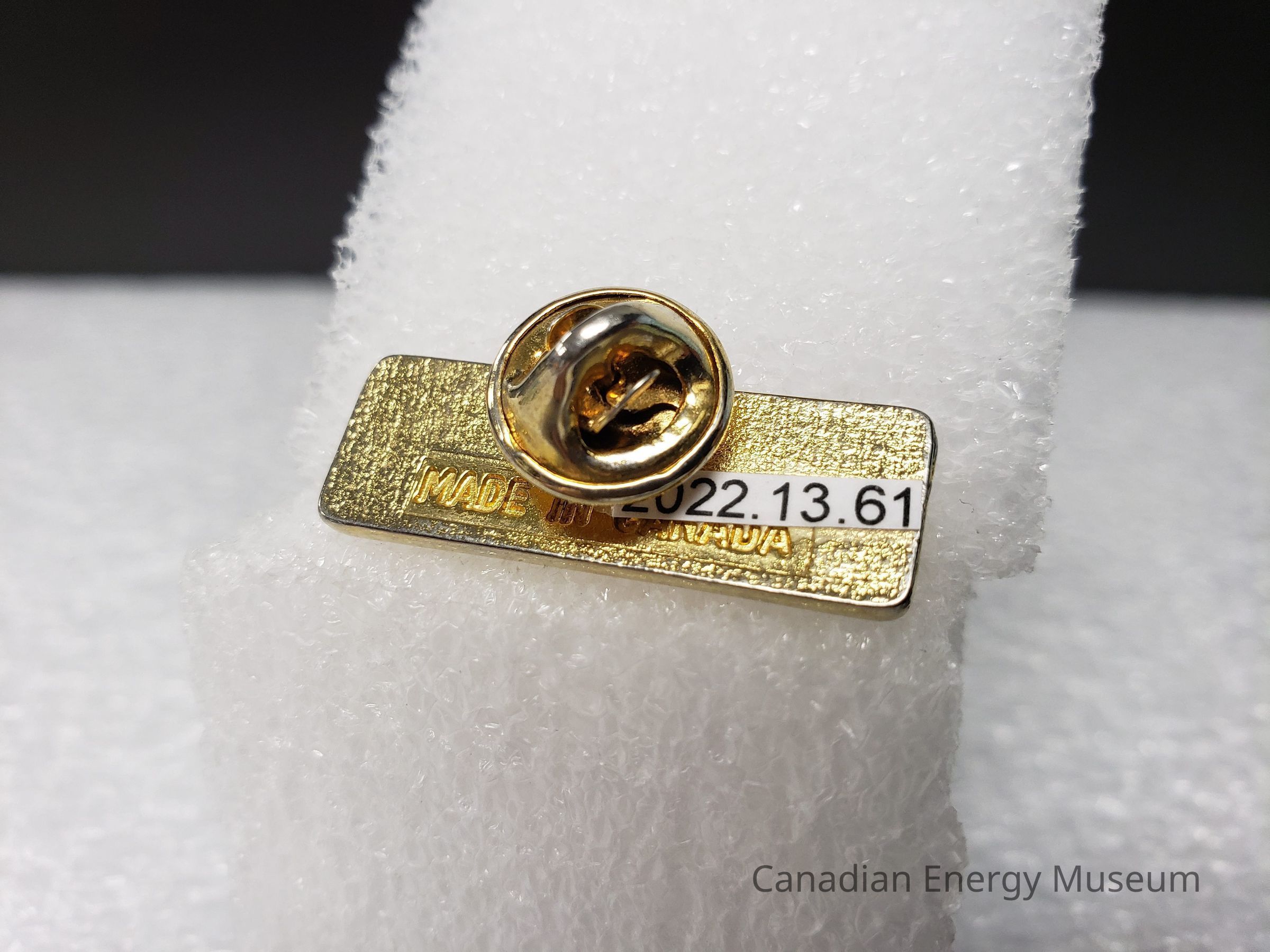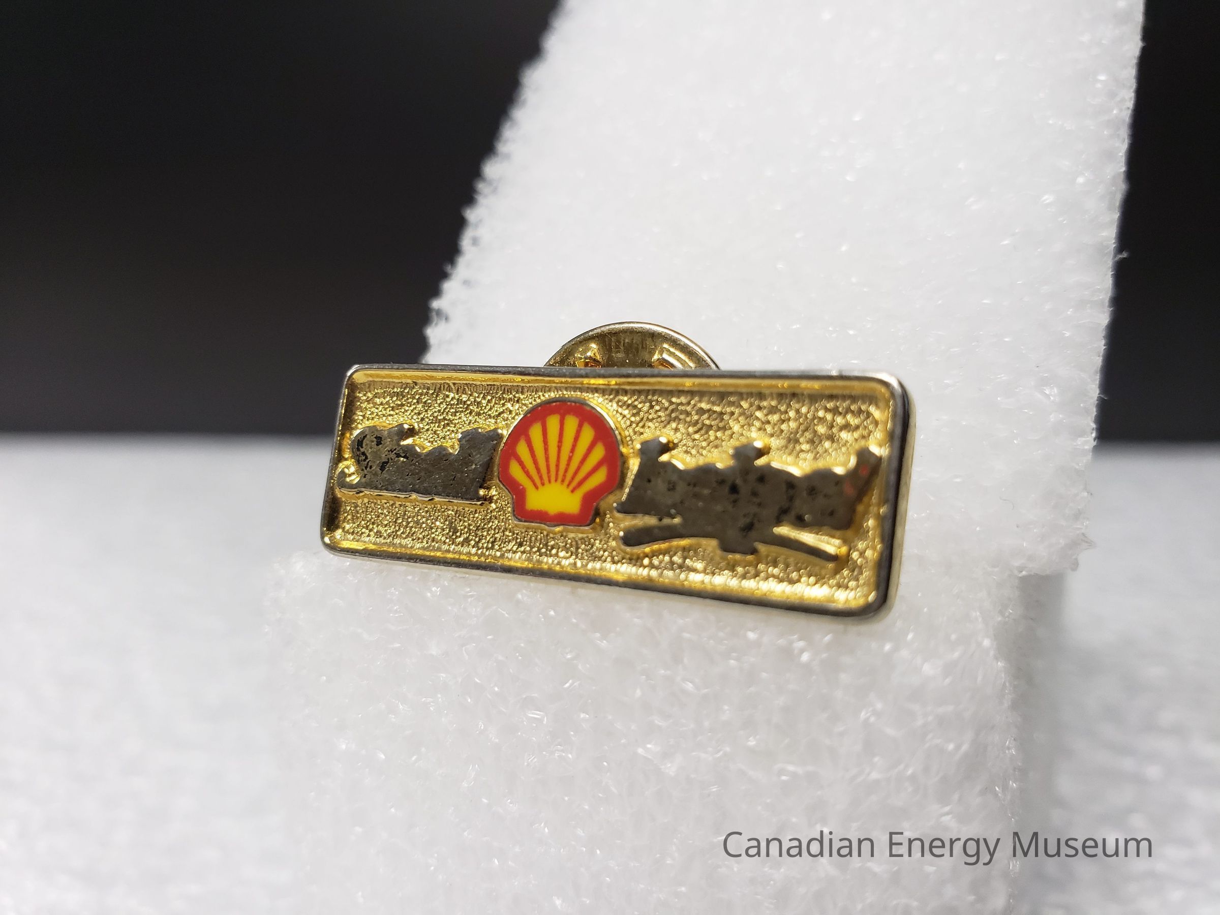Pin is a gold coloured rectangle with a raised border and speckled background. In the Middle of the rectangle is the red and yellow Shell logo in enamel. to the left of the logo is the word "Shell" in italicized text. Tho the left of the logo is the world "helps!". Both words have had paint loss and are hard to make out. The back of the pin says "MADE IN CANADA".