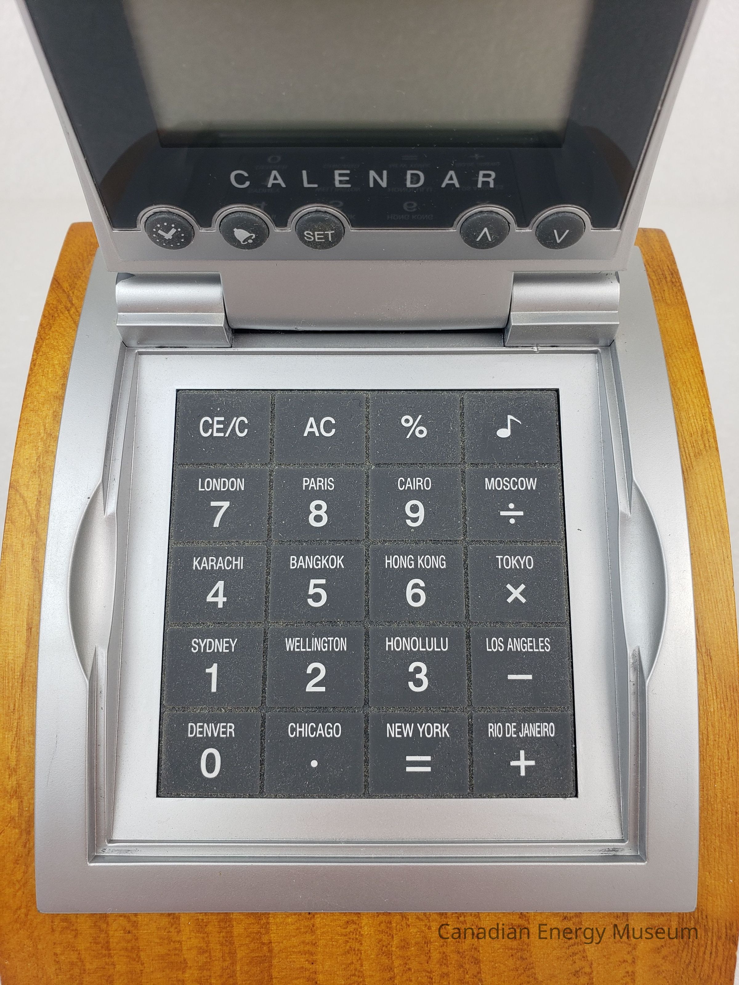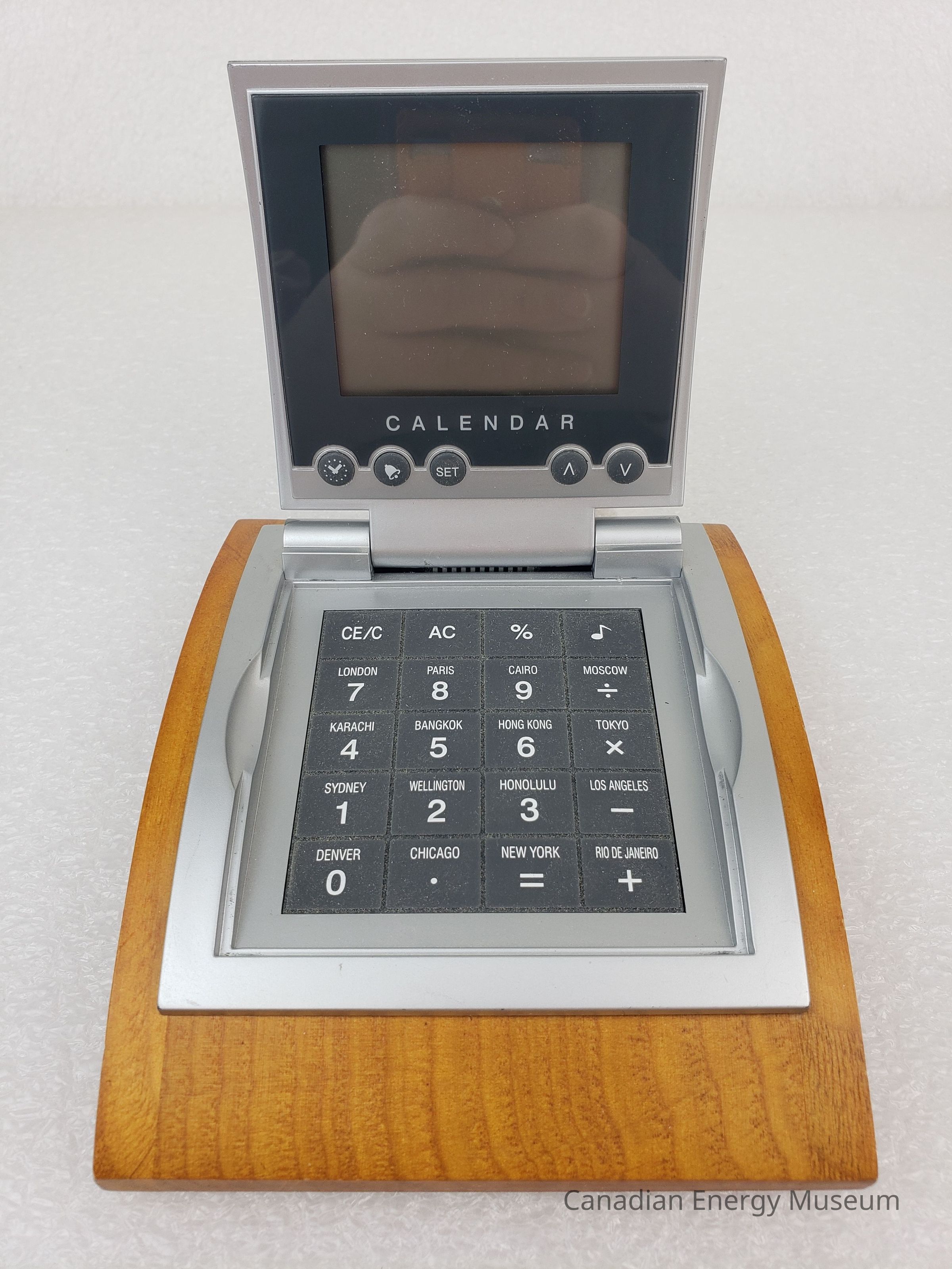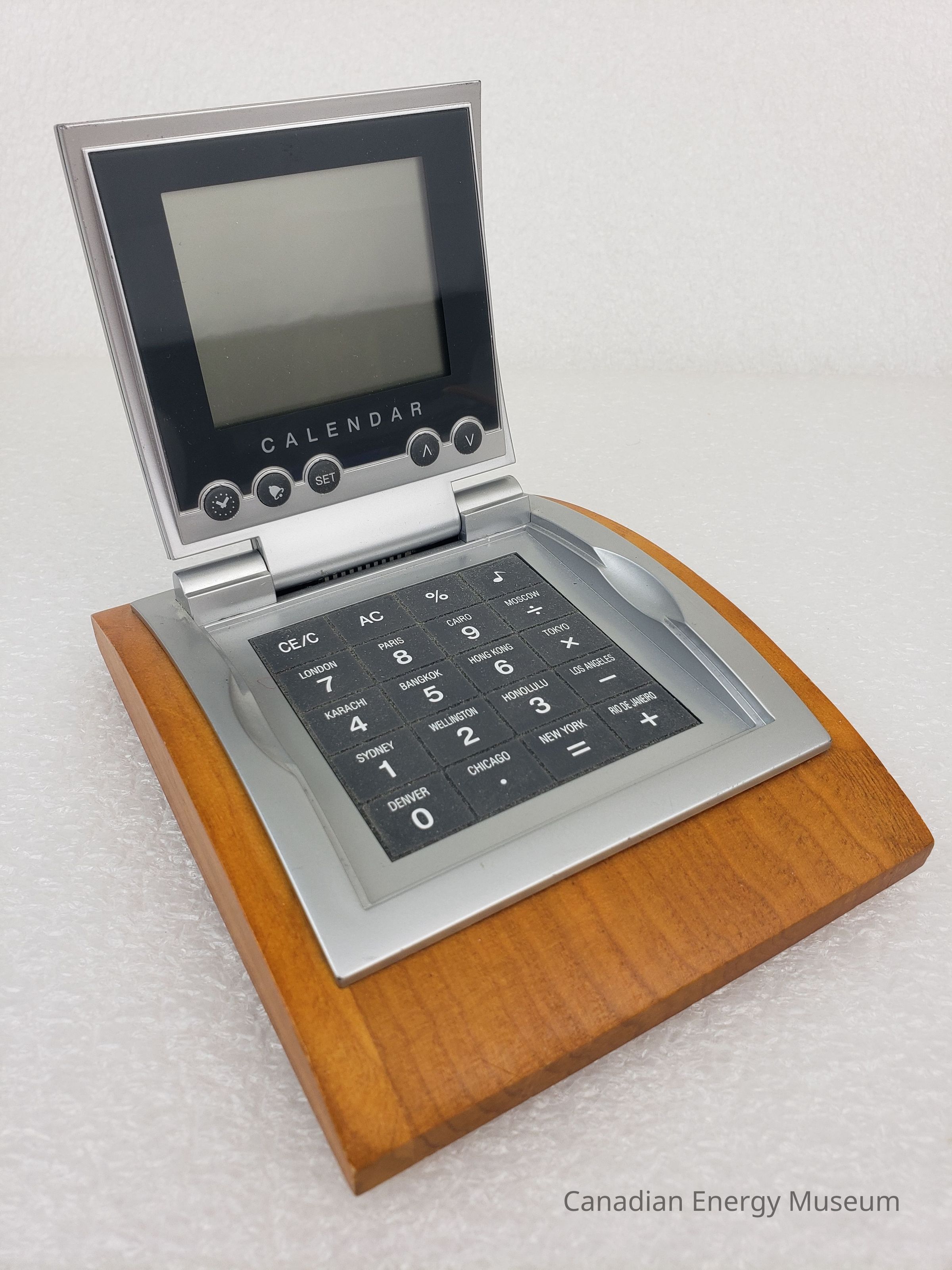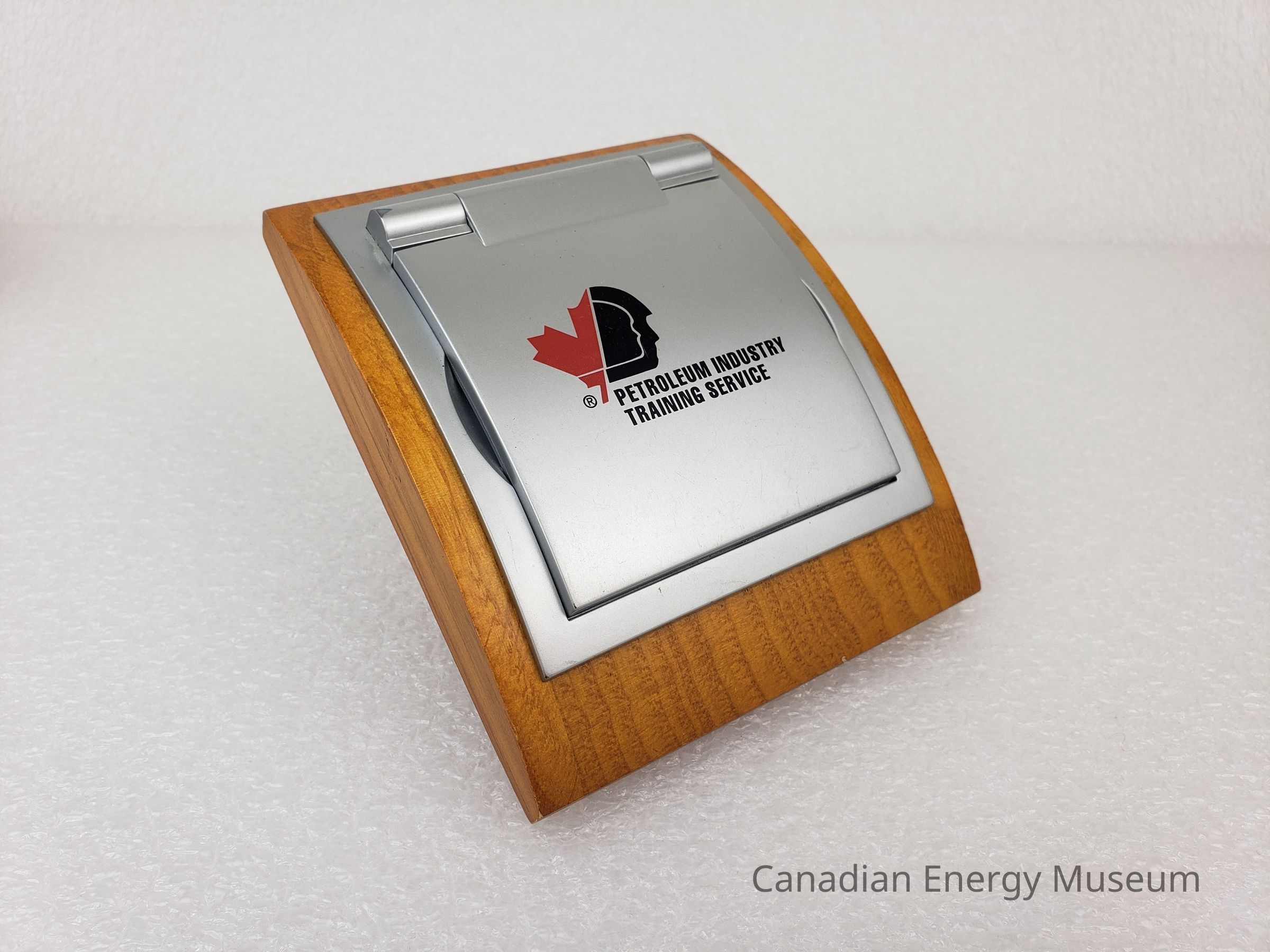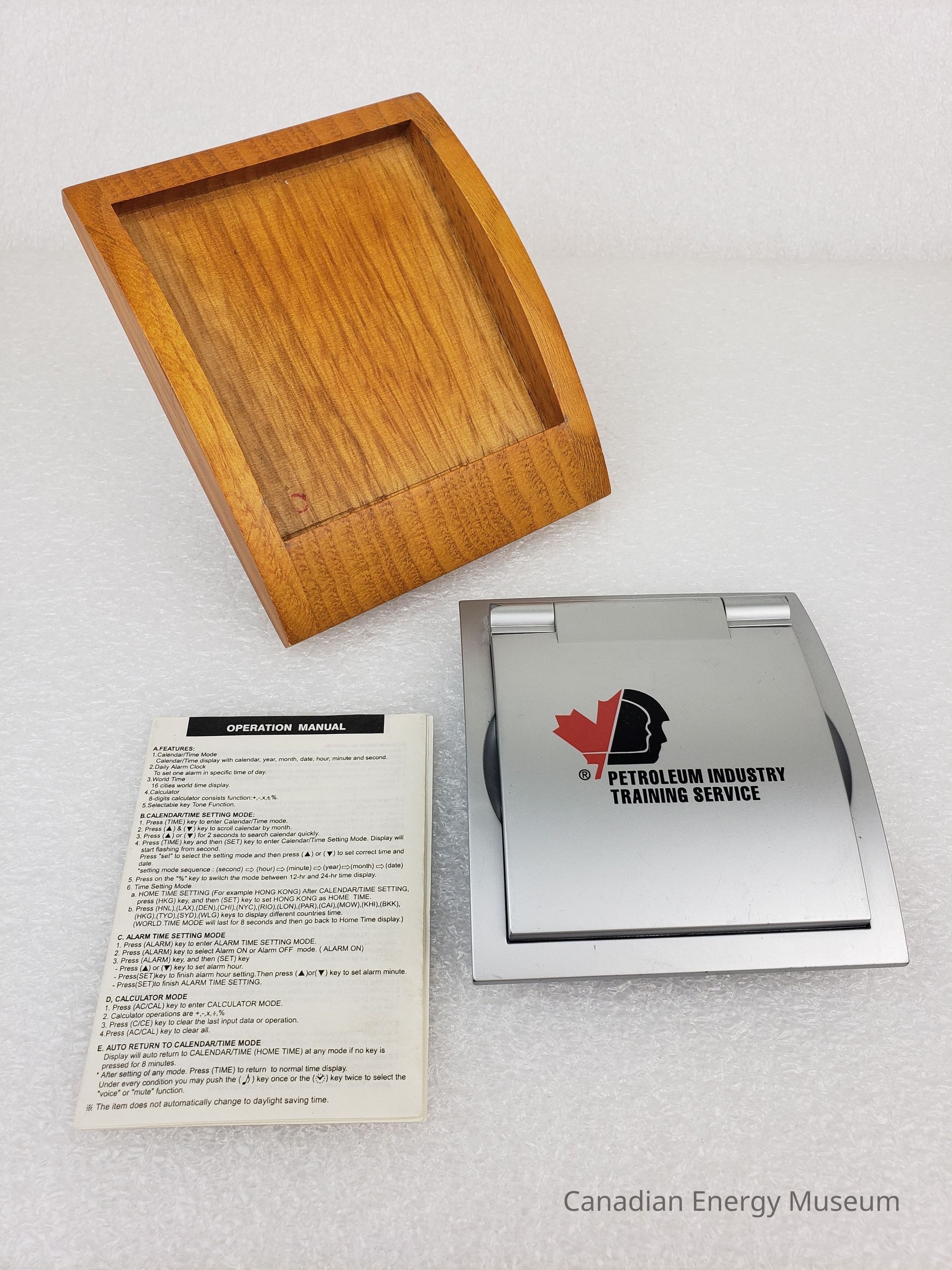 Description: A digital combination calendar, calculator, and alarm clock, mounted on a wooden block. The device has a silver plastic clam-shell design, on the top of which is the logo (half red maple-leaf, half a face within a face in black) and text name of "Petroleum Industry Training Service". When opened, the device has a display screen and five buttons on the lid, and a grey keypad on the base. When closed, the device has a curved shape, which matches the curve of the wooden mount. The device rests inside a cut-out in the wooden base, inside which is a set of printer user's information (the device rests in the groove, but is not secured in place). The underside of the wooden base has four small foam feet.