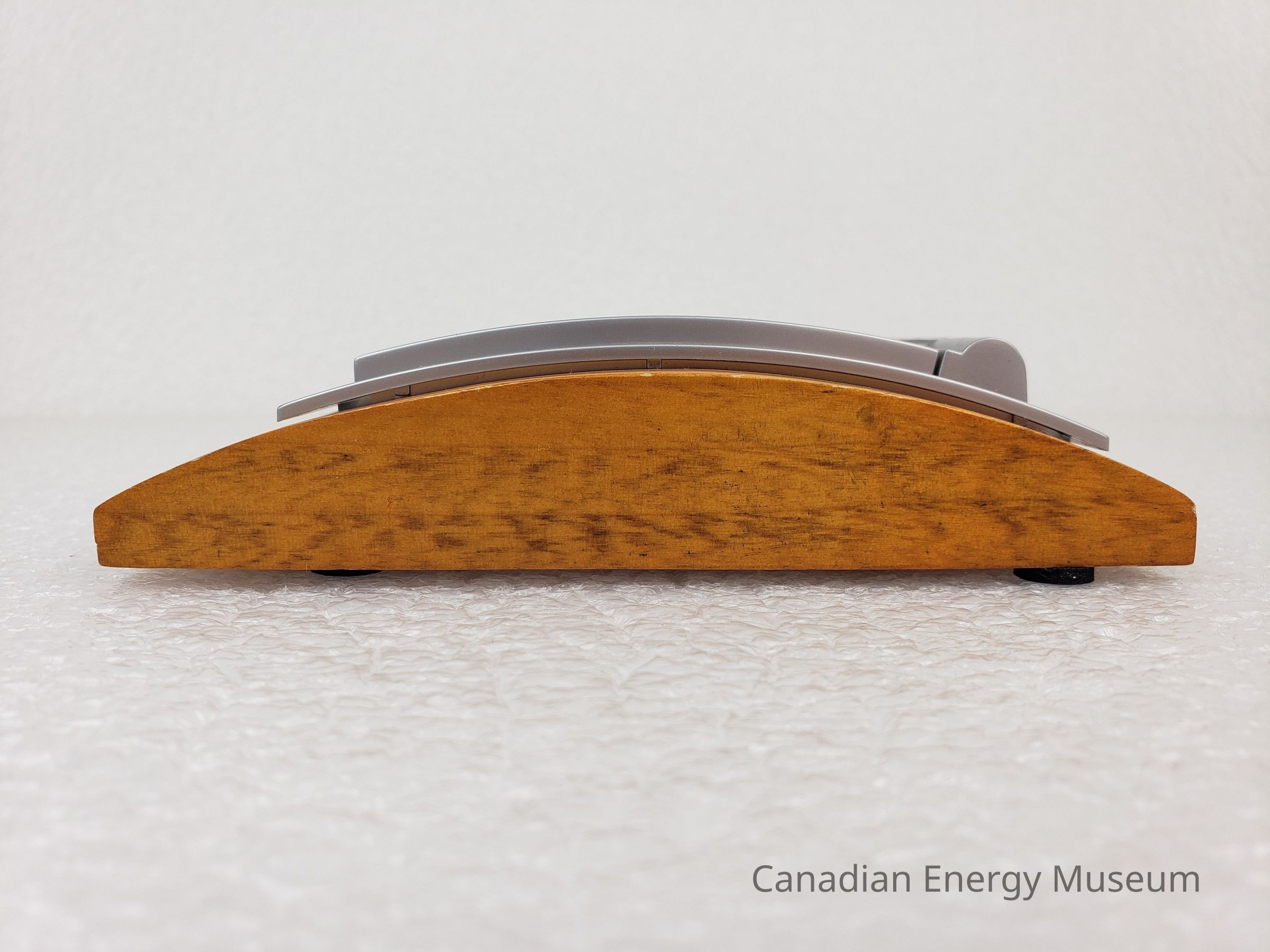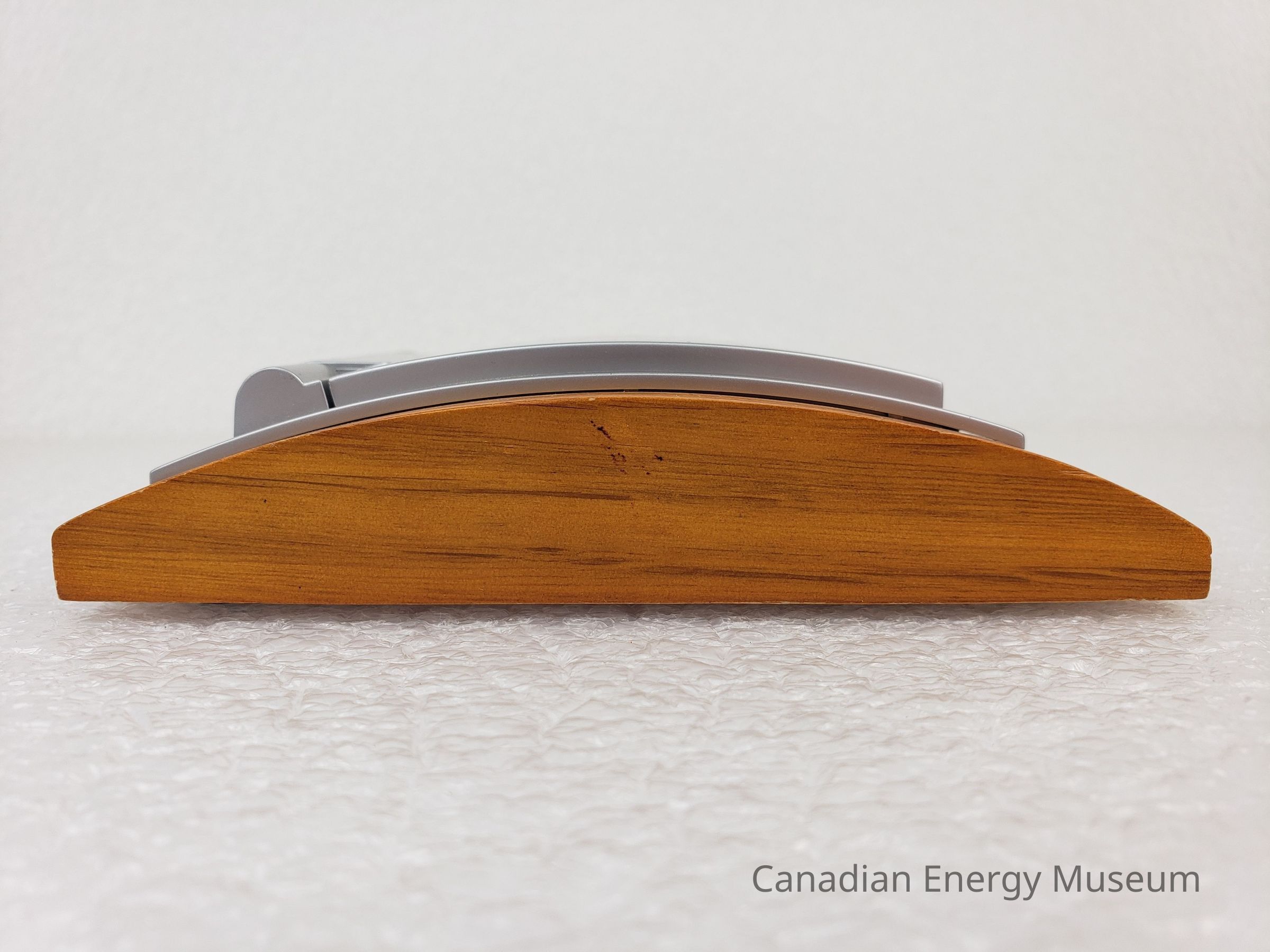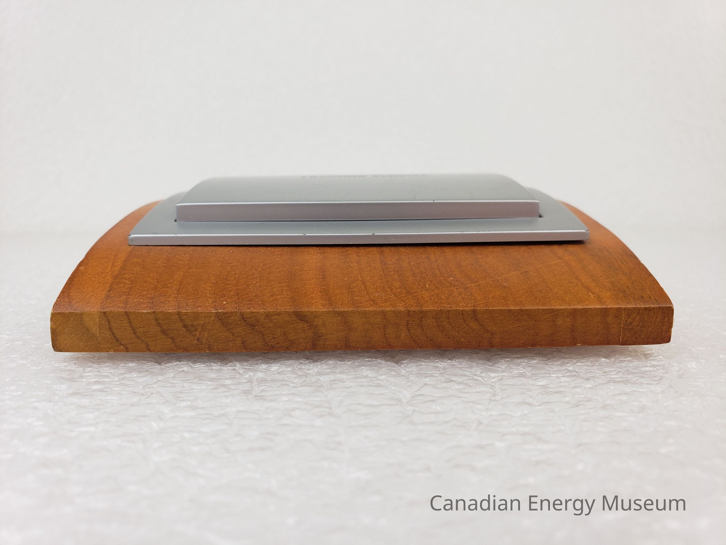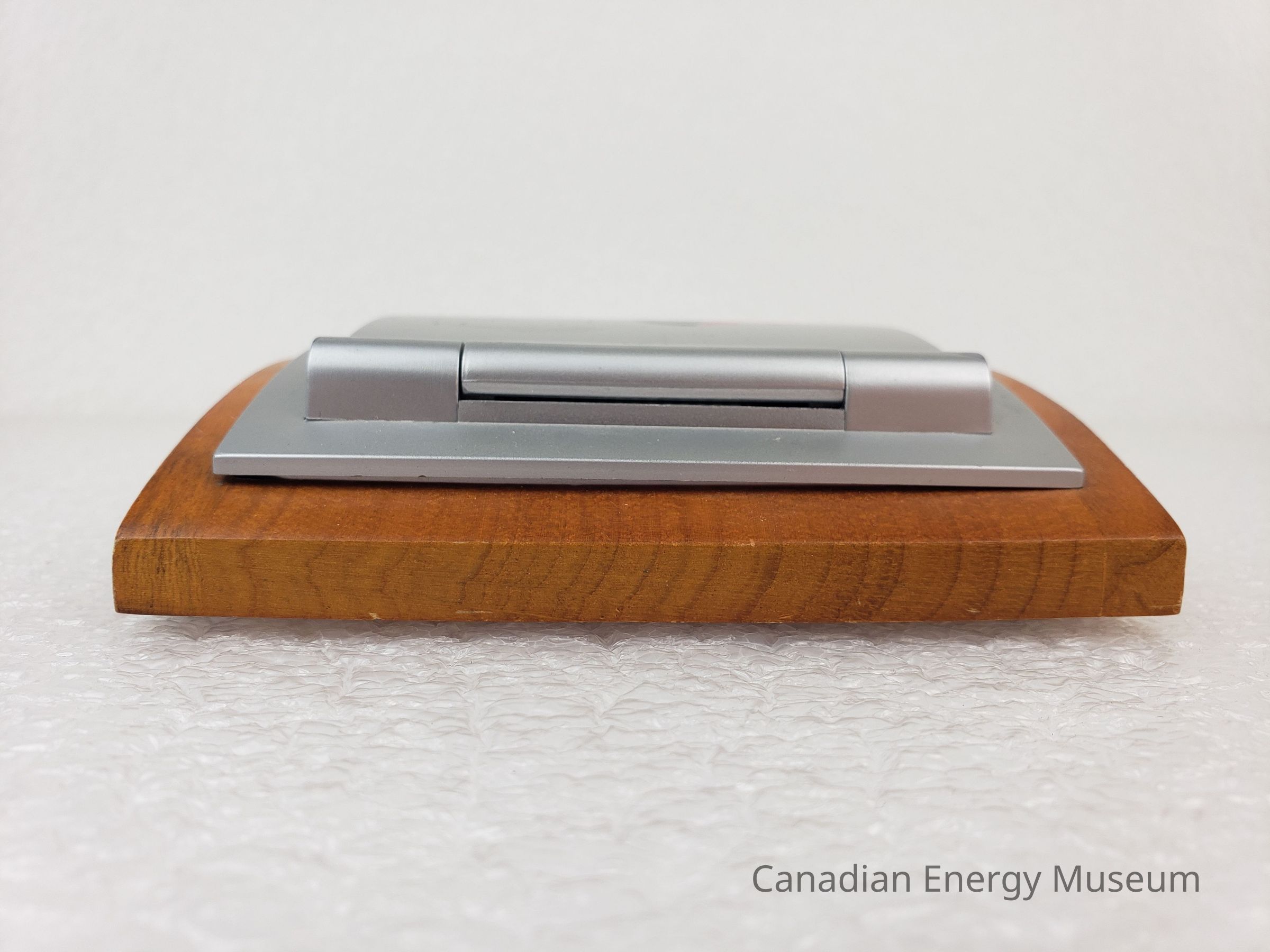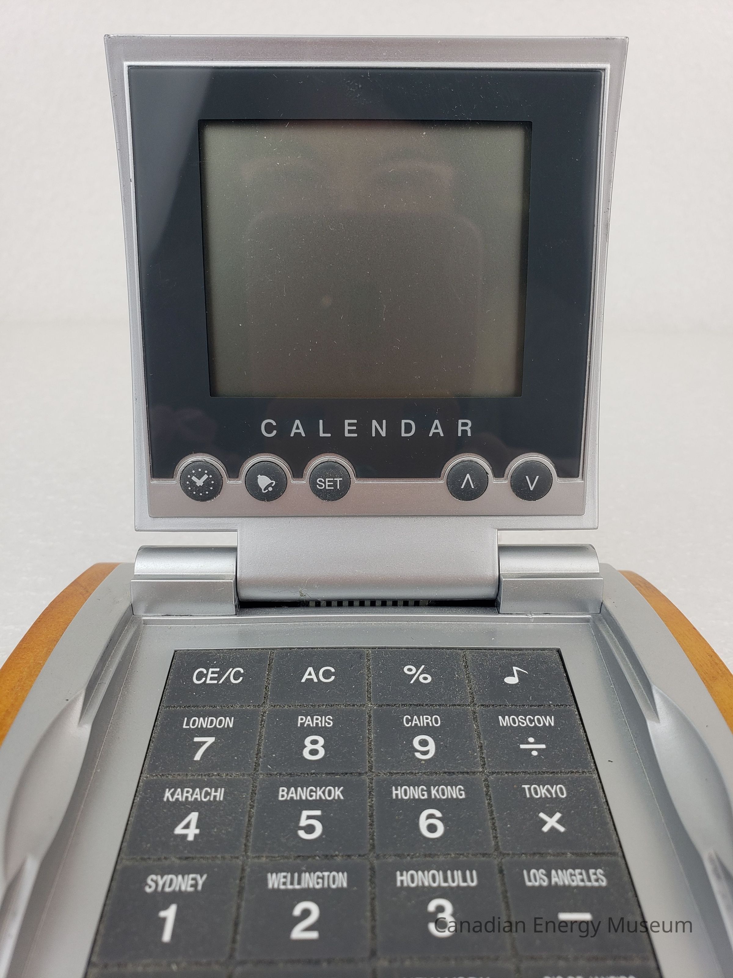 Description: A digital combination calendar, calculator, and alarm clock, mounted on a wooden block. The device has a silver plastic clam-shell design, on the top of which is the logo (half red maple-leaf, half a face within a face in black) and text name of "Petroleum Industry Training Service". When opened, the device has a display screen and five buttons on the lid, and a grey keypad on the base. When closed, the device has a curved shape, which matches the curve of the wooden mount. The device rests inside a cut-out in the wooden base, inside which is a set of printer user's information (the device rests in the groove, but is not secured in place). The underside of the wooden base has four small foam feet.