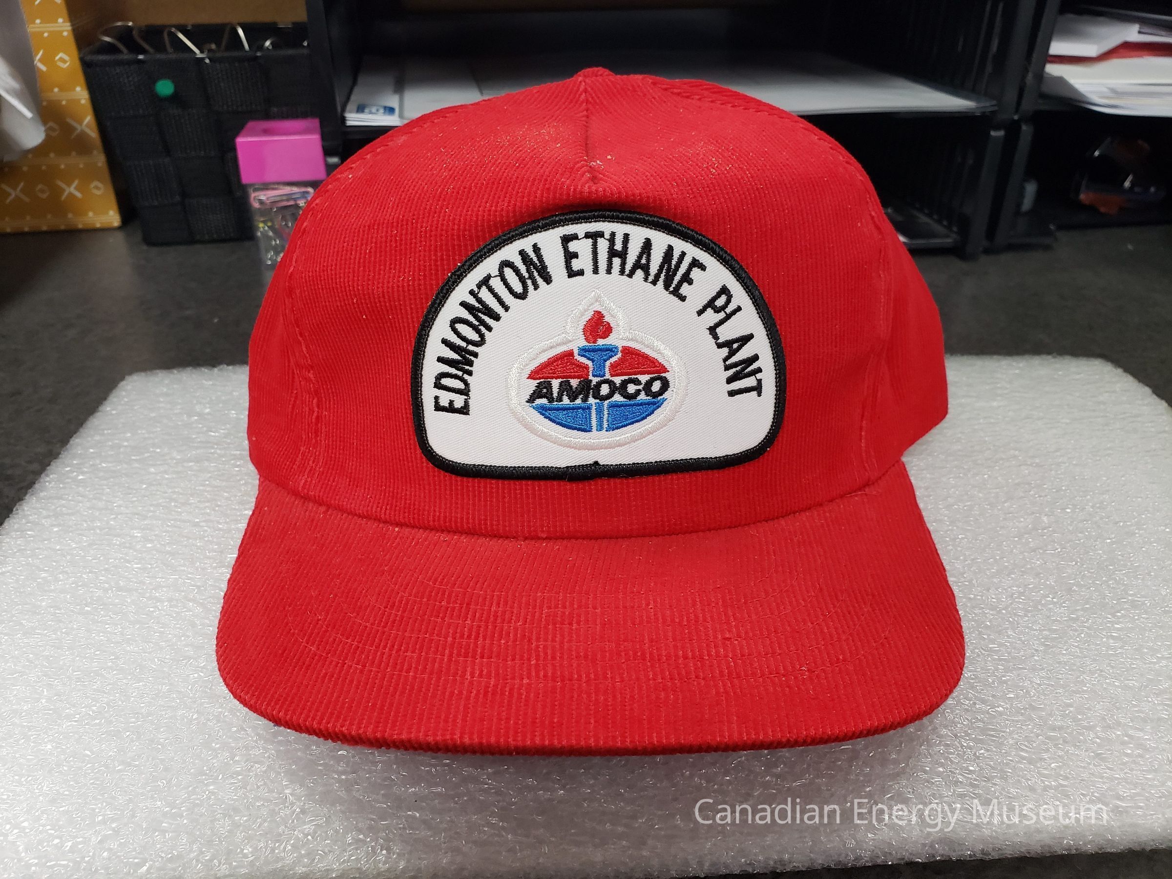 Design: On the front is a semi-circular embroidered patch, at the centre of which is a red/blue/black AMOCO logo, with the black text "EDMONTON ETHANE PLANT" along the top curve. The body fabric is a red corduroy.