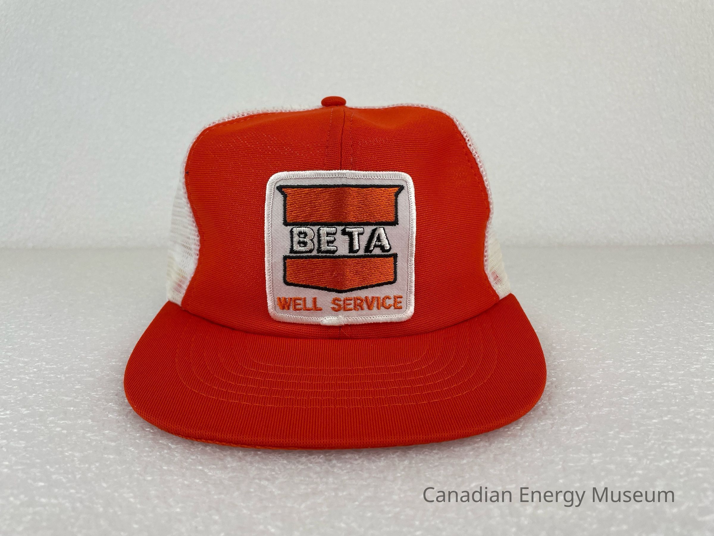 Design: An orange crown with a rounded rectangle patch branded to Beta Well Service. The patch design features a white base with white edge embroidery. The patch displays an orange badge shape outlined in black. The badge is split into two, with "BETA" going through the middle in white embroidery and black outline. The text at the bottom of the patch reads, "WELL SERVICE" in orange embroidery.